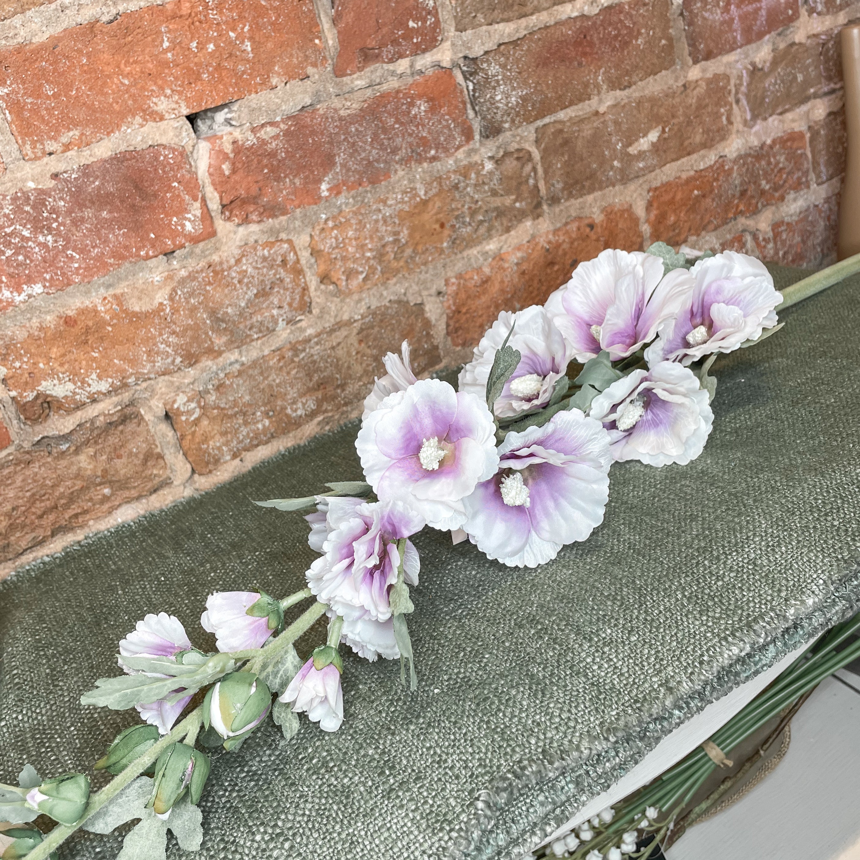 This 43" hollyhock stem showcases a beautiful shade of purple, adding a pop of color to any arrangement. Made from high-quality materials, it is durable and long-lasting. Create a stunning floral display with this unique, eye-catching stem.