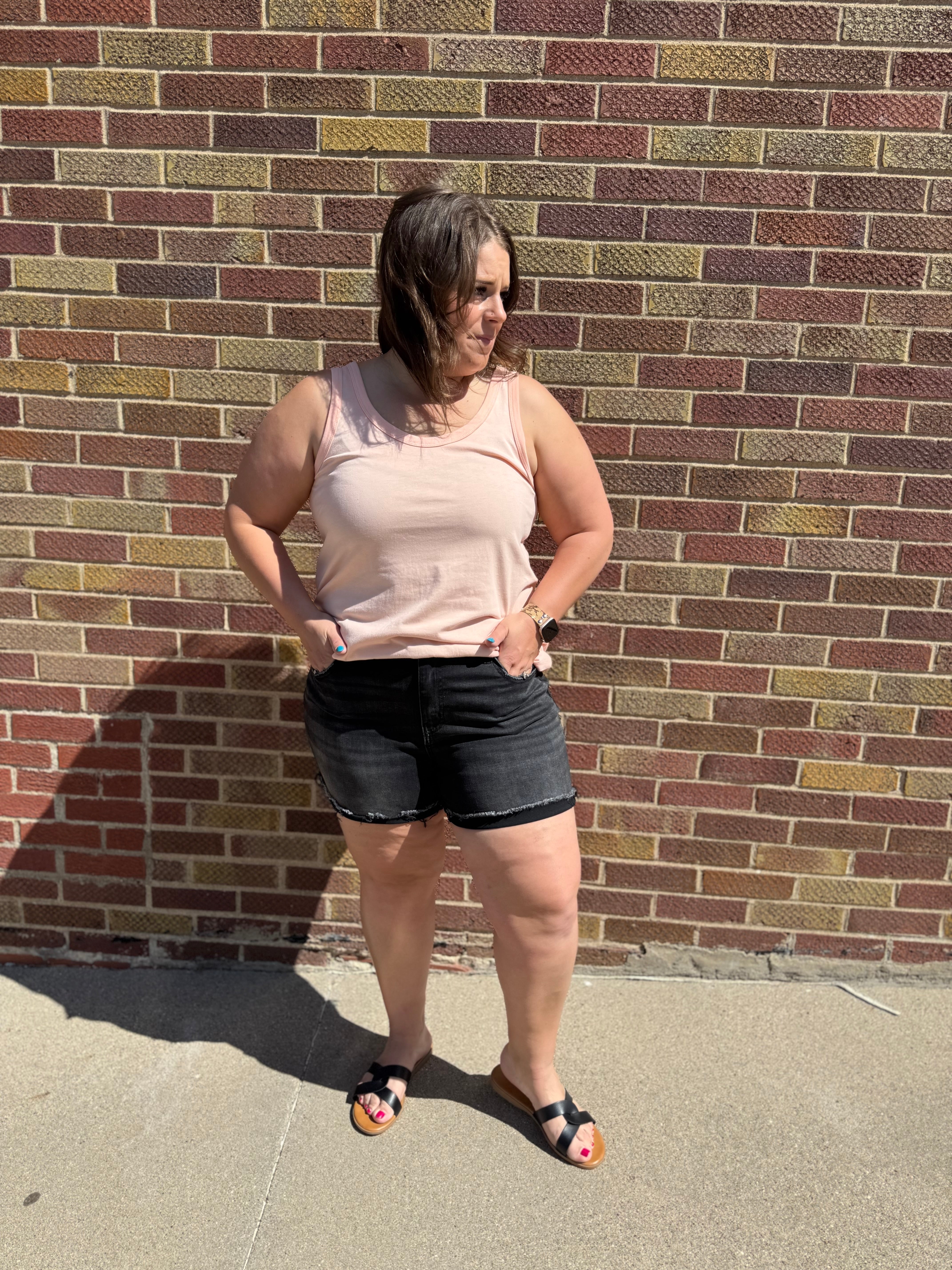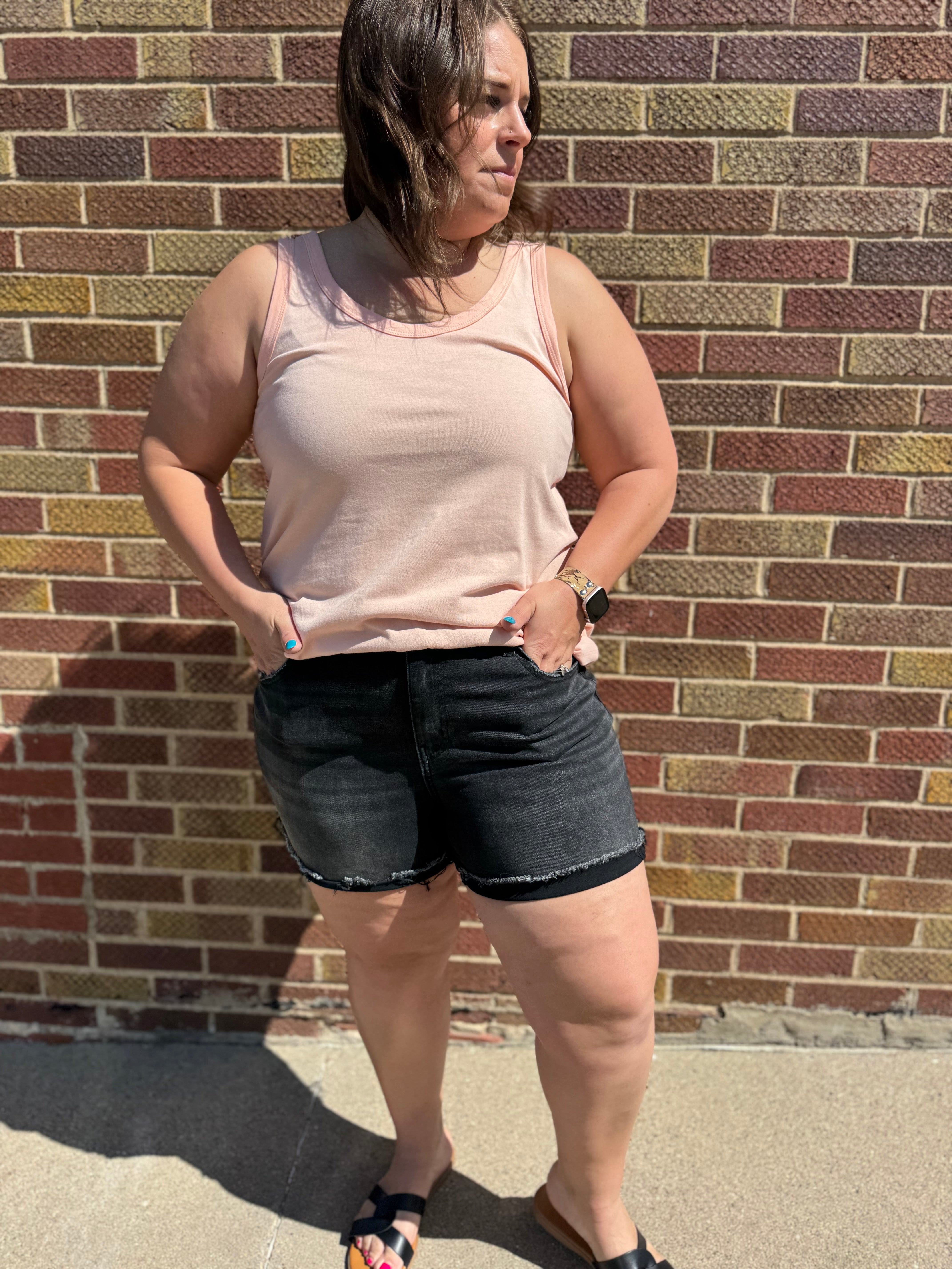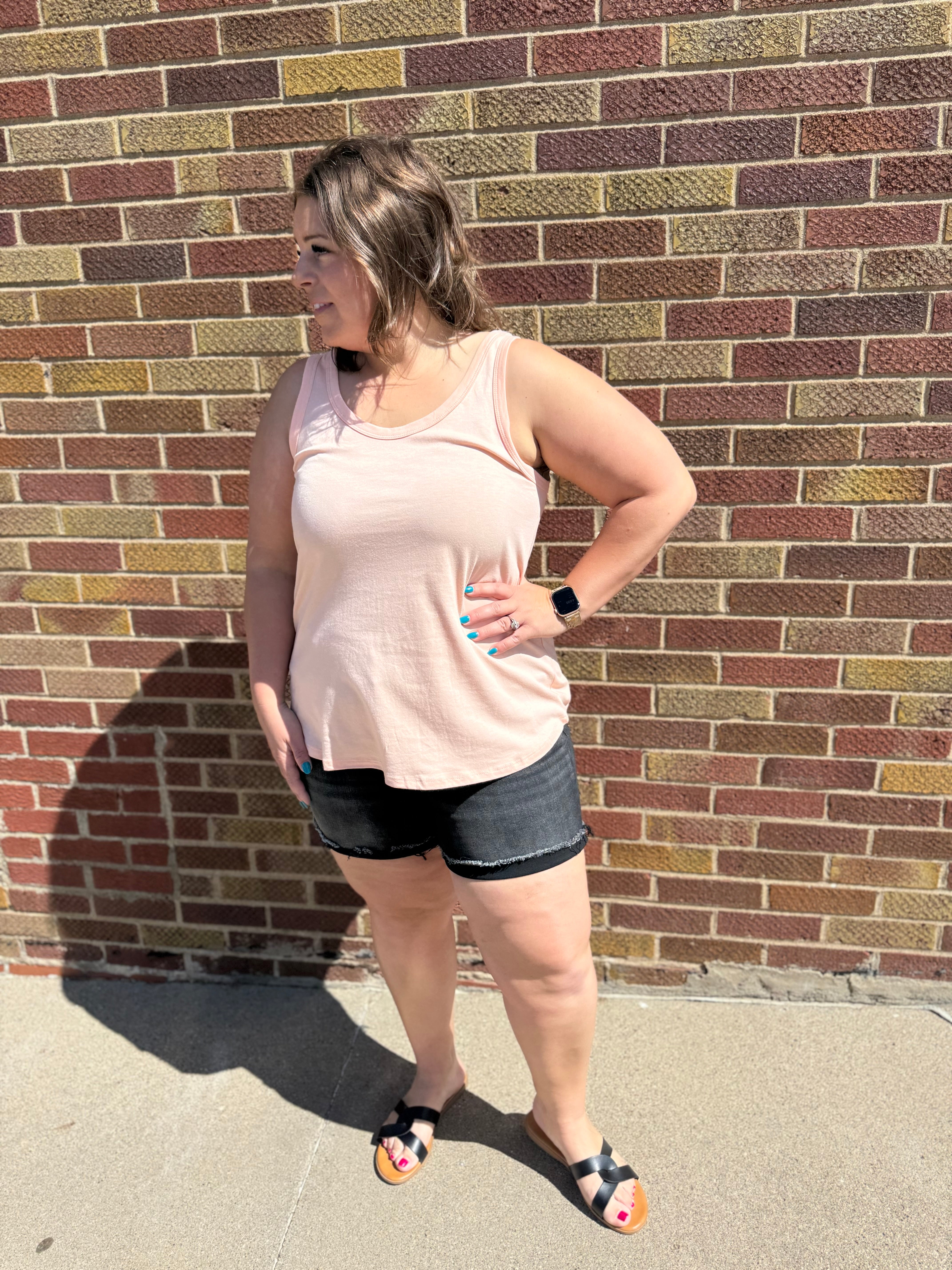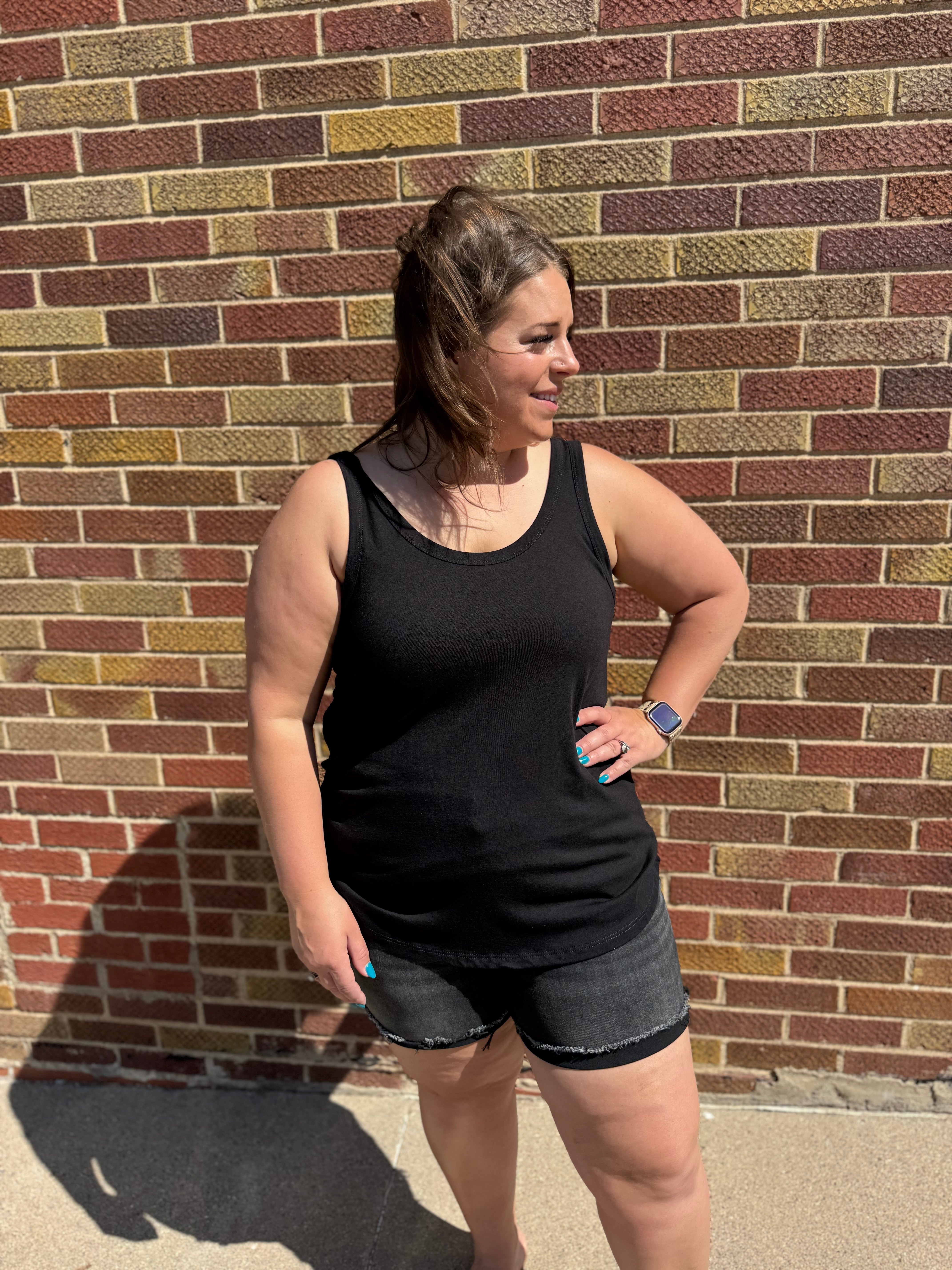 This scoop neck tank has a stylish round hem and comes in 3 versatile colors. Its loose fit allows for optimal comfort and airflow. Perfect for any casual occasion, this tank is a must-have for your wardrobe.
