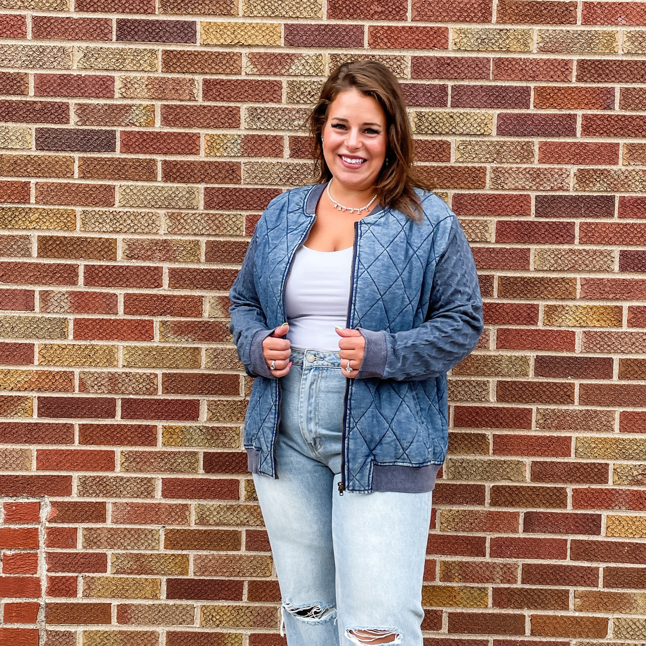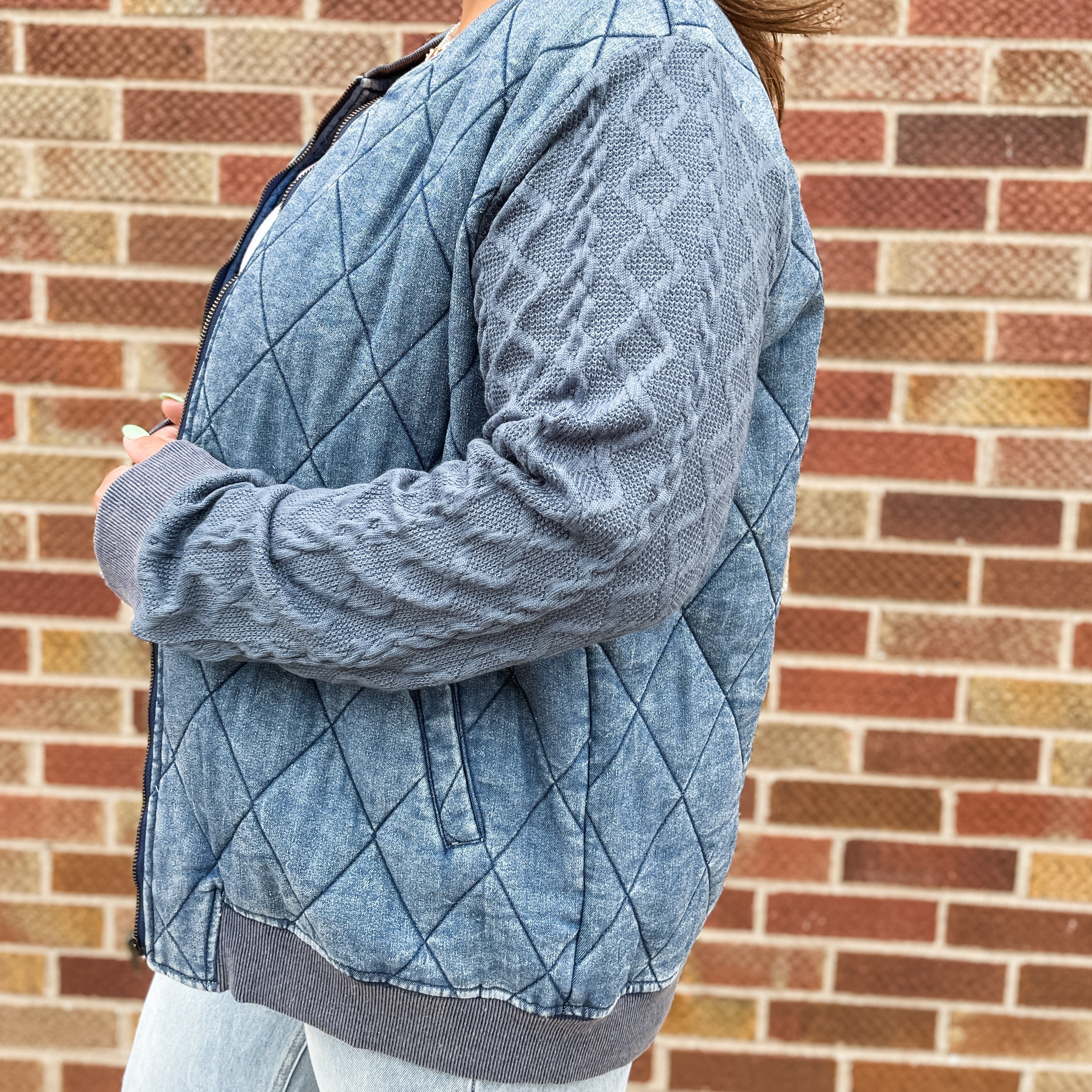 Quilted Washed jacket with cable knit sweater sleeves featuring zip-up closure. Stay warm and stylish with our Plus Sweater Sleeve Quilted Jacket. Featuring a cozy sweater sleeve design and quilted outer layer, our jacket offers both comfort and fashion. Perfect for chilly days, this jacket is a must-have for any wardrobe.