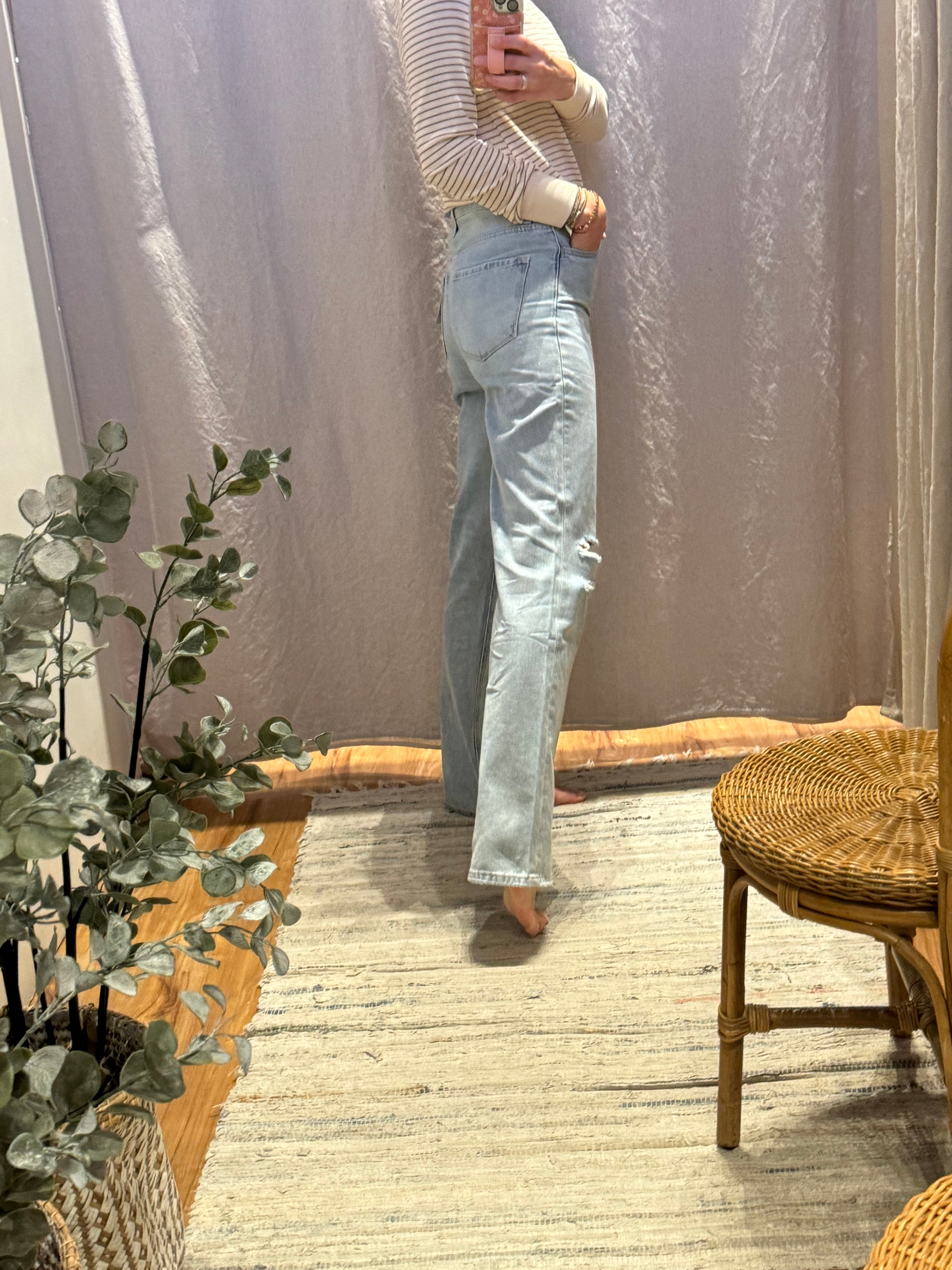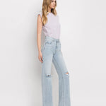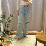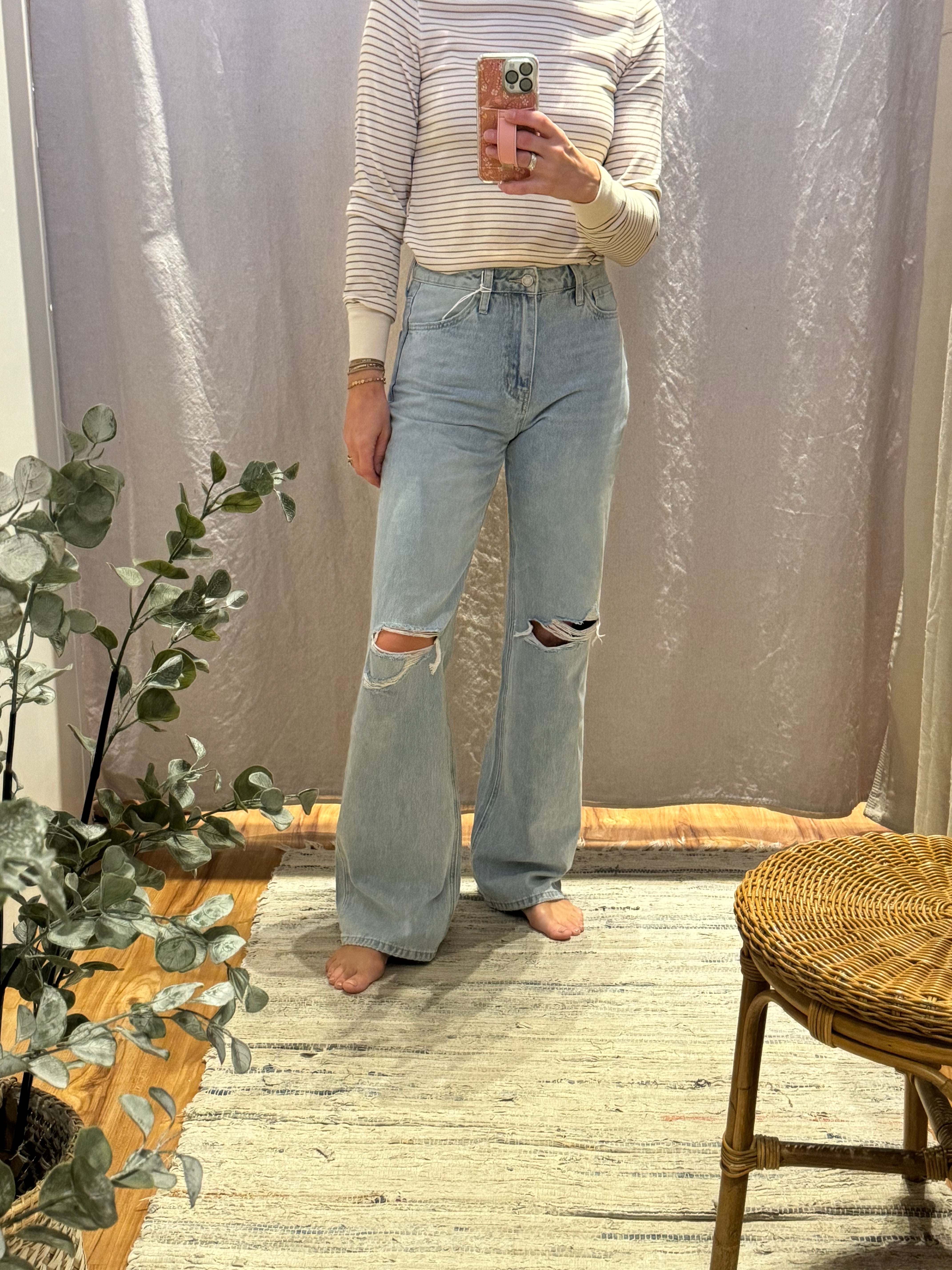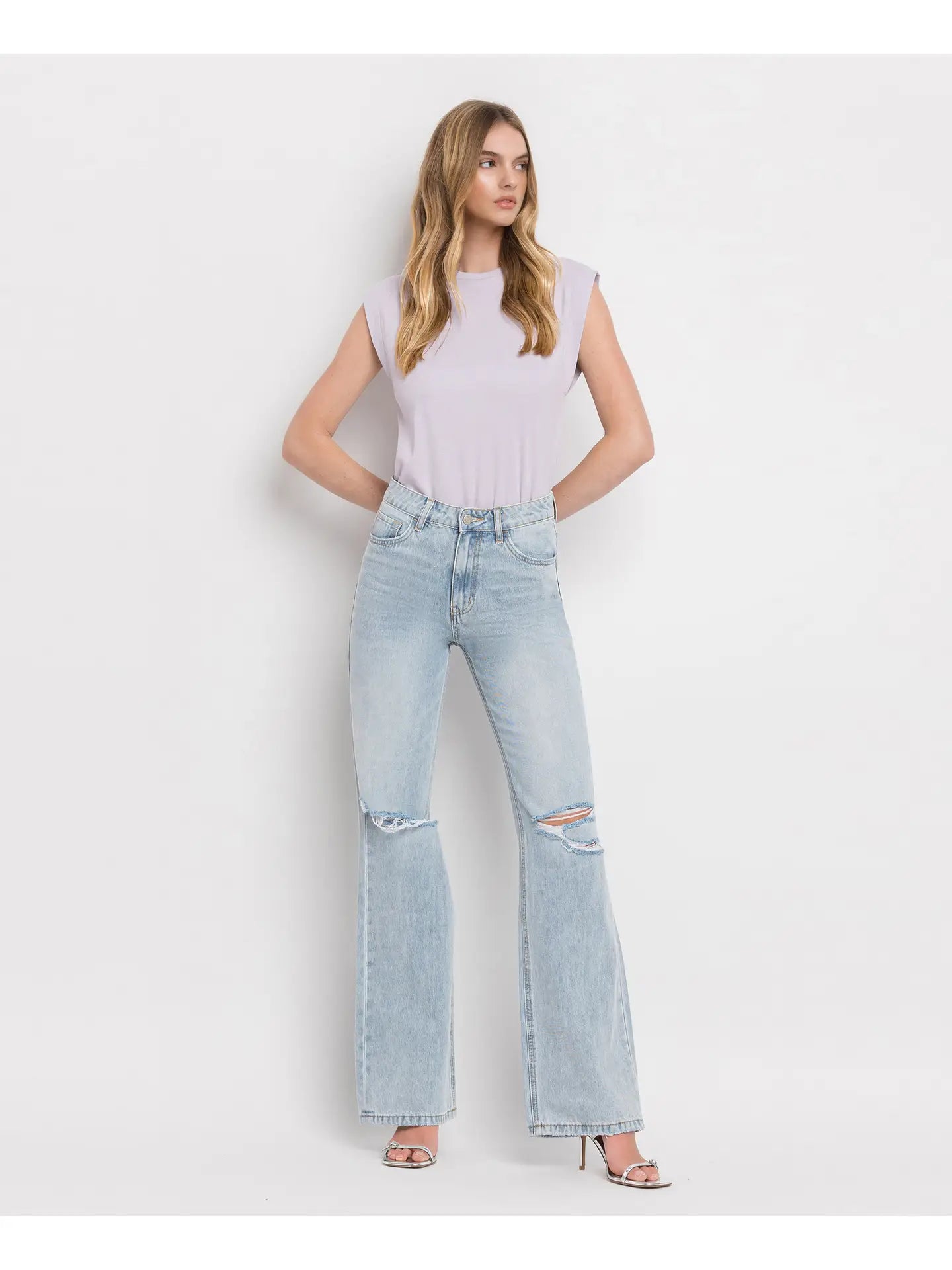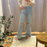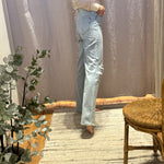 90'S VINTAGE SUPER HIGH RISE FLARE JEANS NON STRETCH DENIM, SUPER HIGH RISE WAIST, 90'S VINTAGE STYLE, DISTRESSED DETAIL, FULL LENGTH, FLARE JEANS F. RISE: 11 1/2" / INSEAM: 33 1/2" / LEG OPENING: 20"