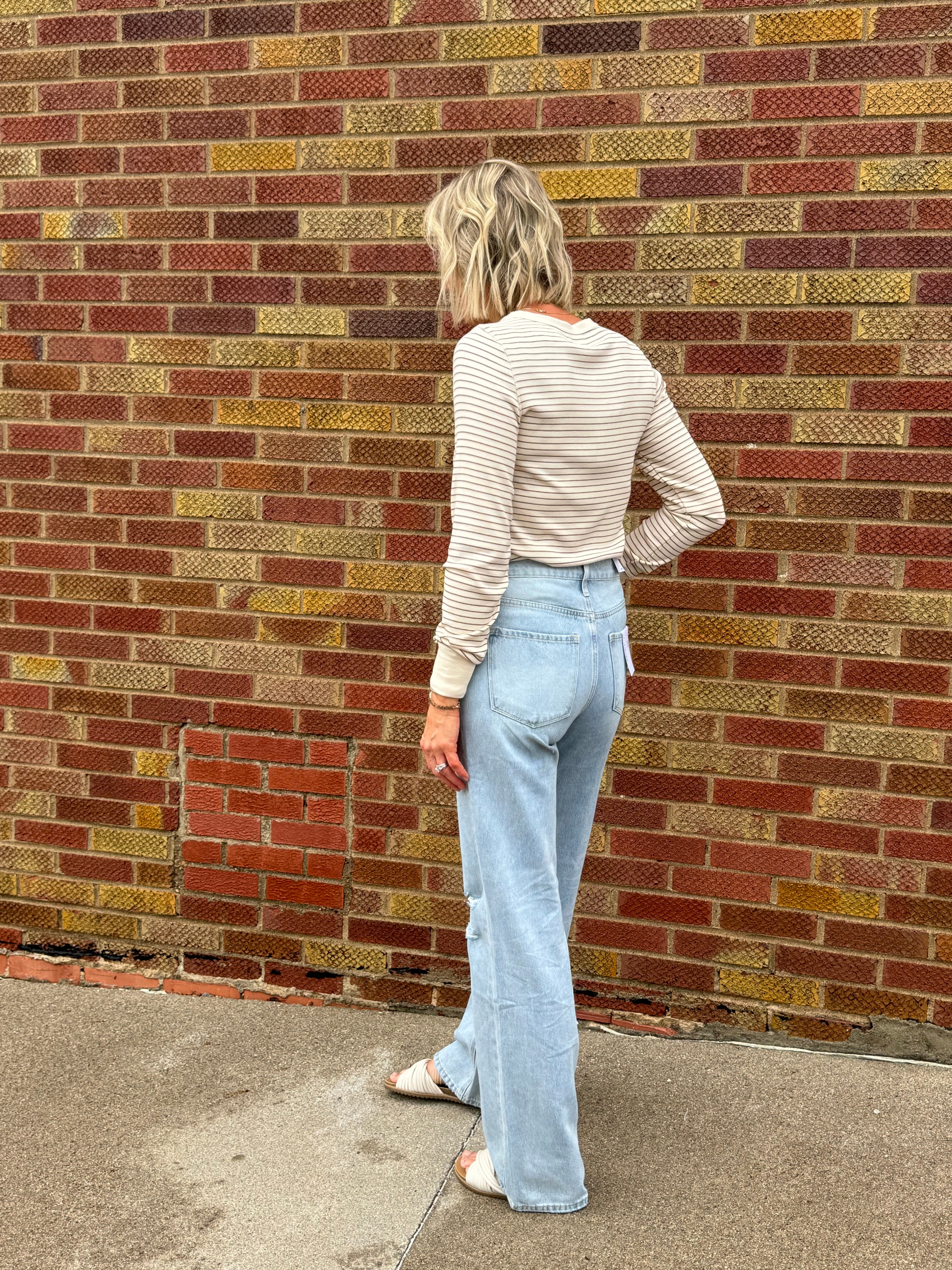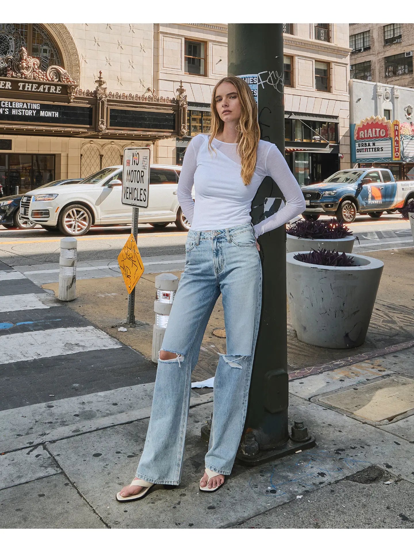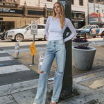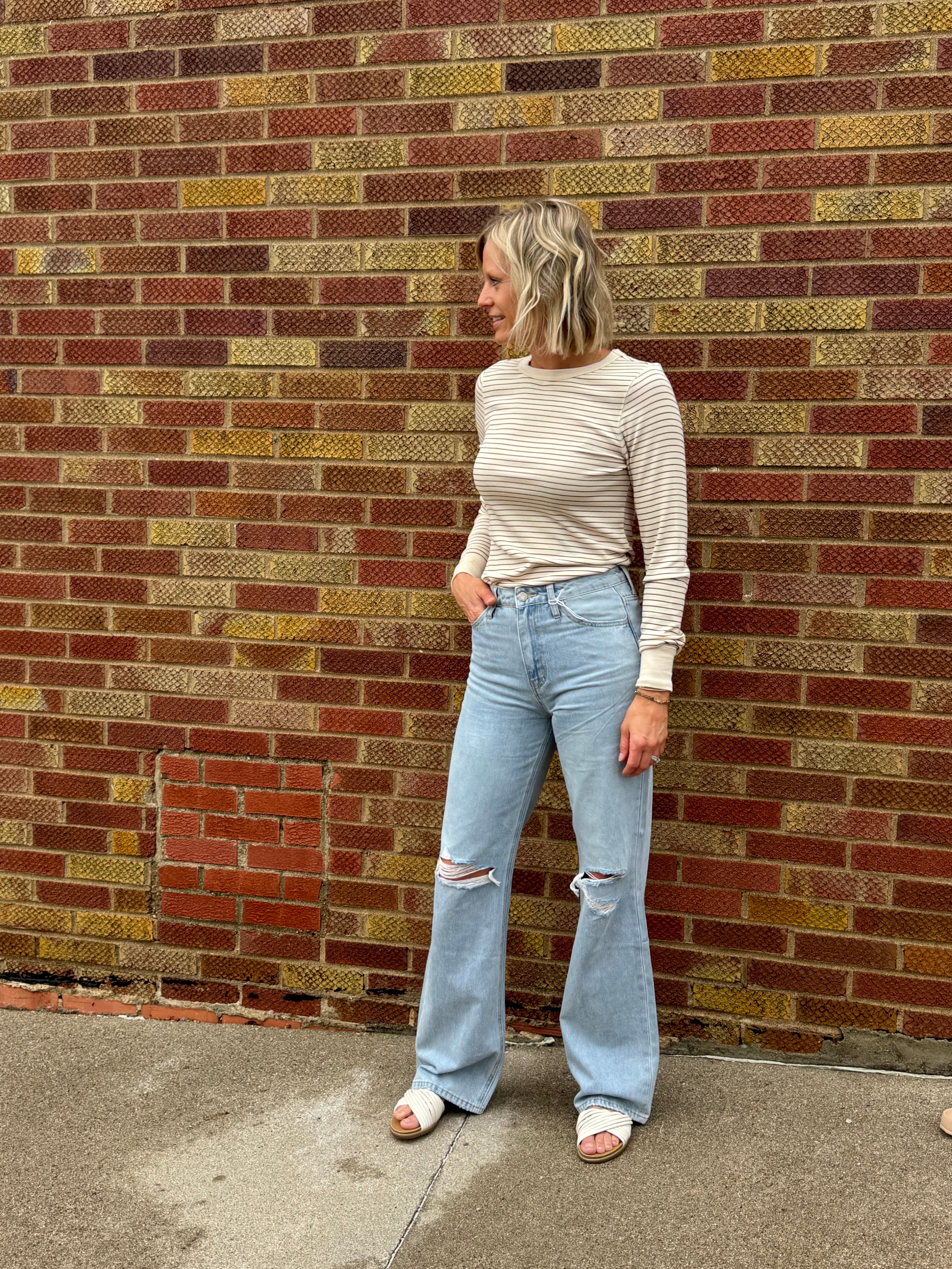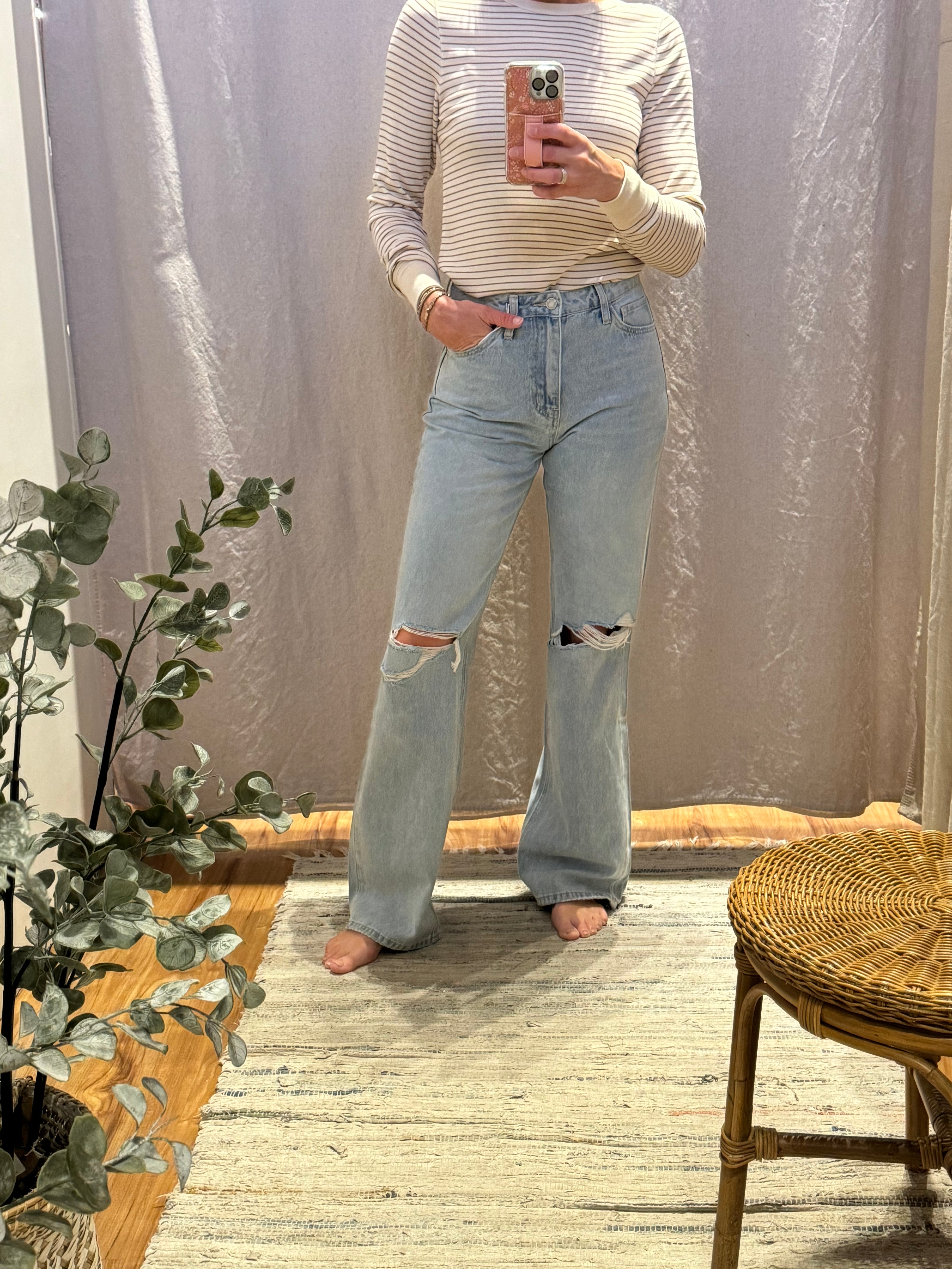 90'S VINTAGE SUPER HIGH RISE FLARE JEANS NON STRETCH DENIM, SUPER HIGH RISE WAIST, 90'S VINTAGE STYLE, DISTRESSED DETAIL, FULL LENGTH, FLARE JEANS F. RISE: 11 1/2" / INSEAM: 33 1/2" / LEG OPENING: 20"