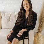 Our beautiful cross-over robe is the perfect addition to every Mamas wardrobe! It features 3/4 length drop sleeves, side seam pockets, an inner tie & outer tie for maximum adjustability and made out of our most coveted prints that are the softest jersey knit pieces you'll ever wear. So good that it will become your forever robe! Once you've worn it, you will know what we mean.