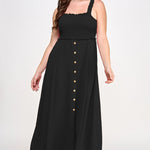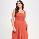 The Plus Button Down Dress features a black or terracotta color, button detail on the front, and a midi length. The smocked bodice offers a snug fit, emphasizing your figure and providing comfort. Elevate your style with ruffled straps for a touch of femininity.