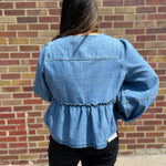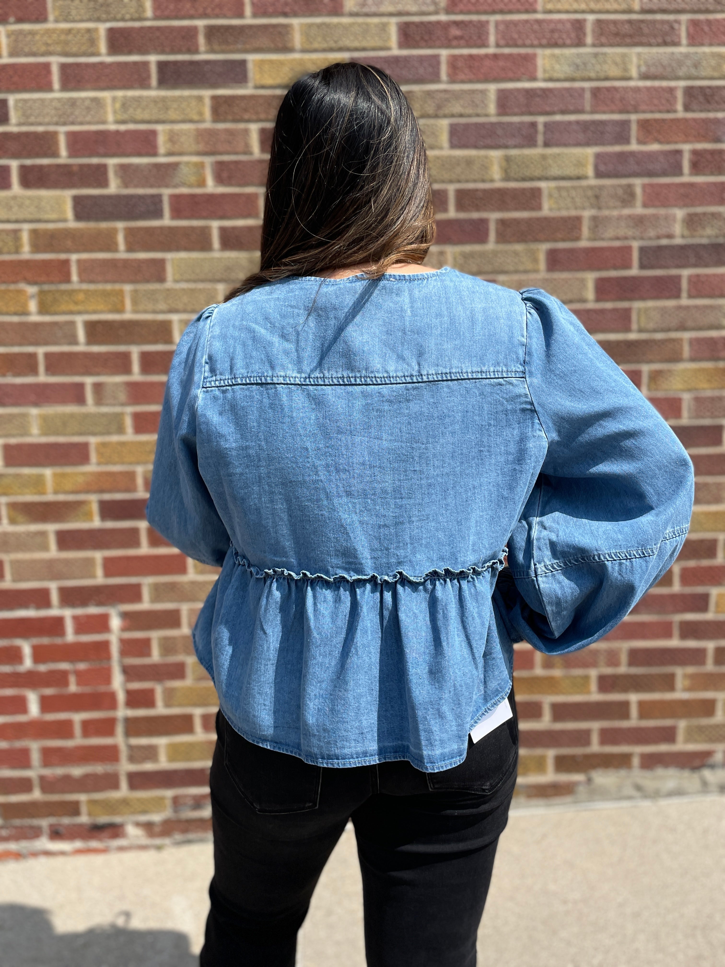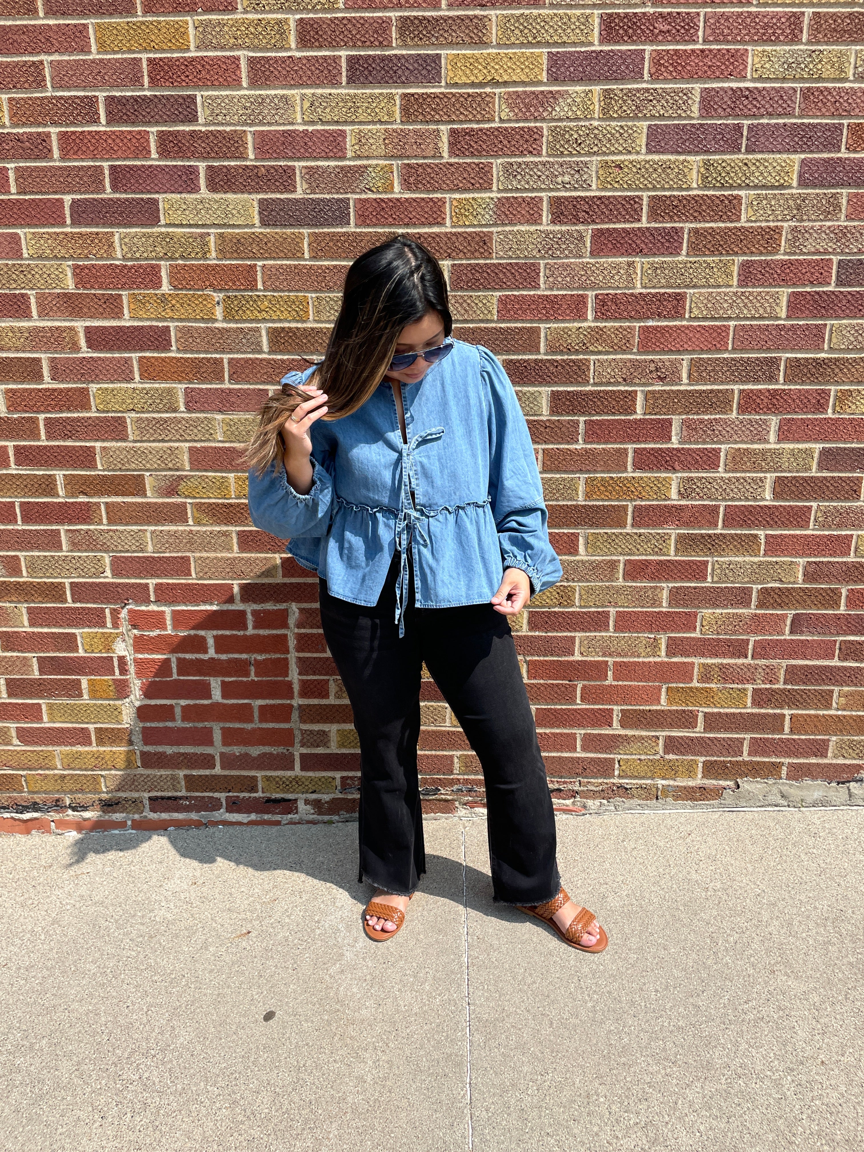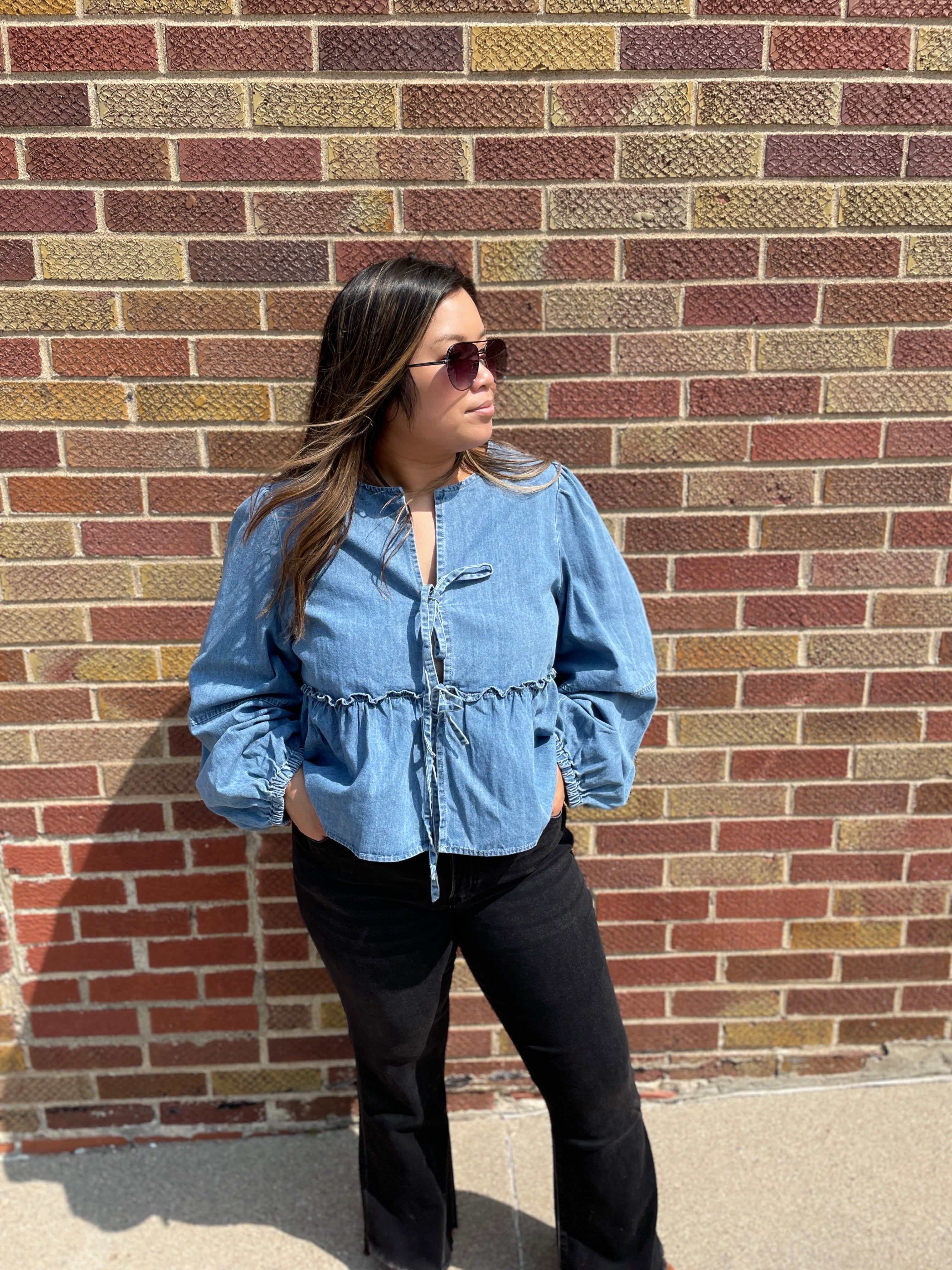 The Balloon Sleeve Tie Front Denim Top featuring long balloon sleeves and an open front with strings to tie. This denim top brings fun and volume to any outfit. Perfect for layering or wearing solo, it’s a stylish way to keep things light and lively.