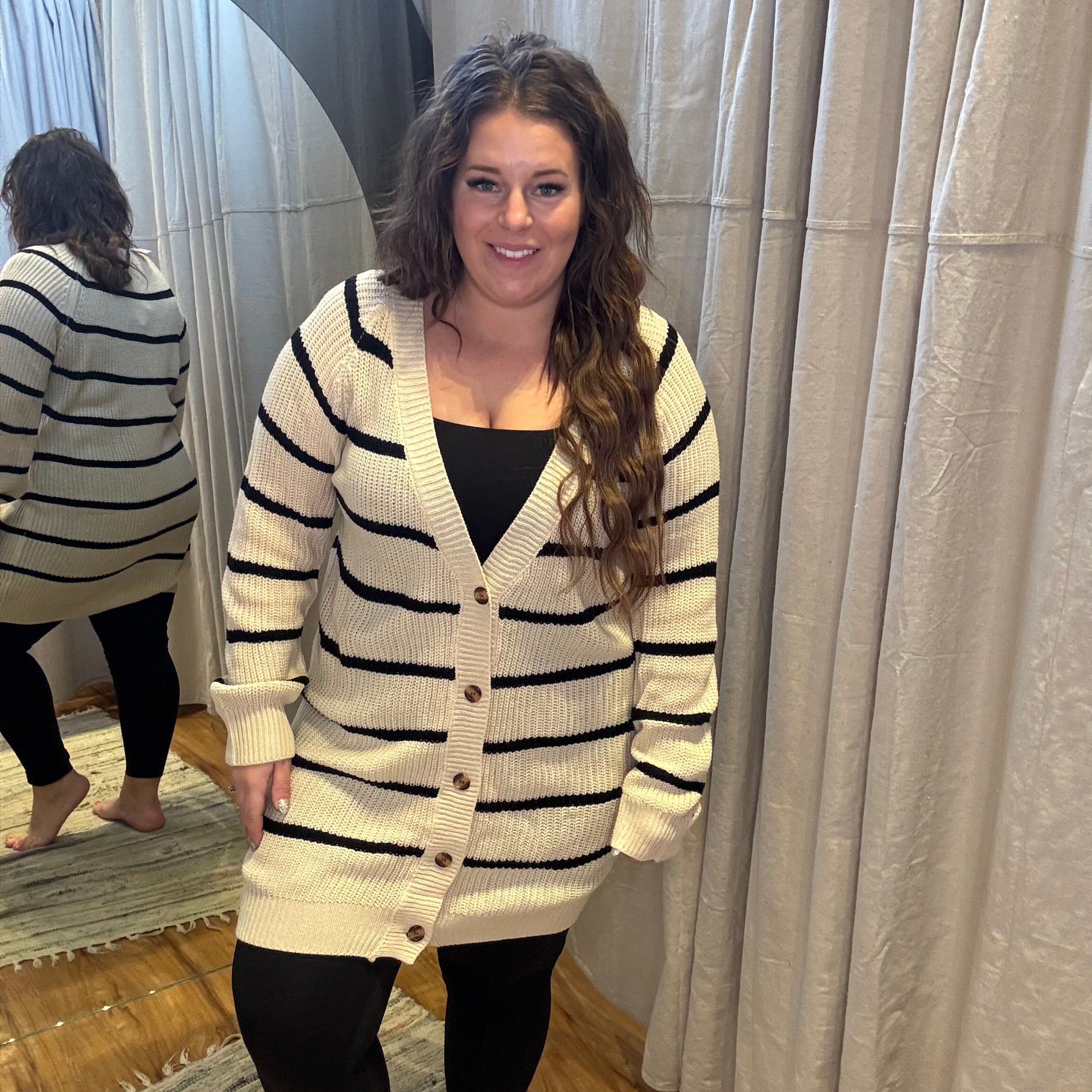 This Cream/Black Stripe Sweater Cardigan features a button down design and long sleeves, making it a versatile and stylish addition to any wardrobe. With its longer length, it provides coverage and comfort while still flattering your figure. Stay warm and fashionable with this must-have piece.