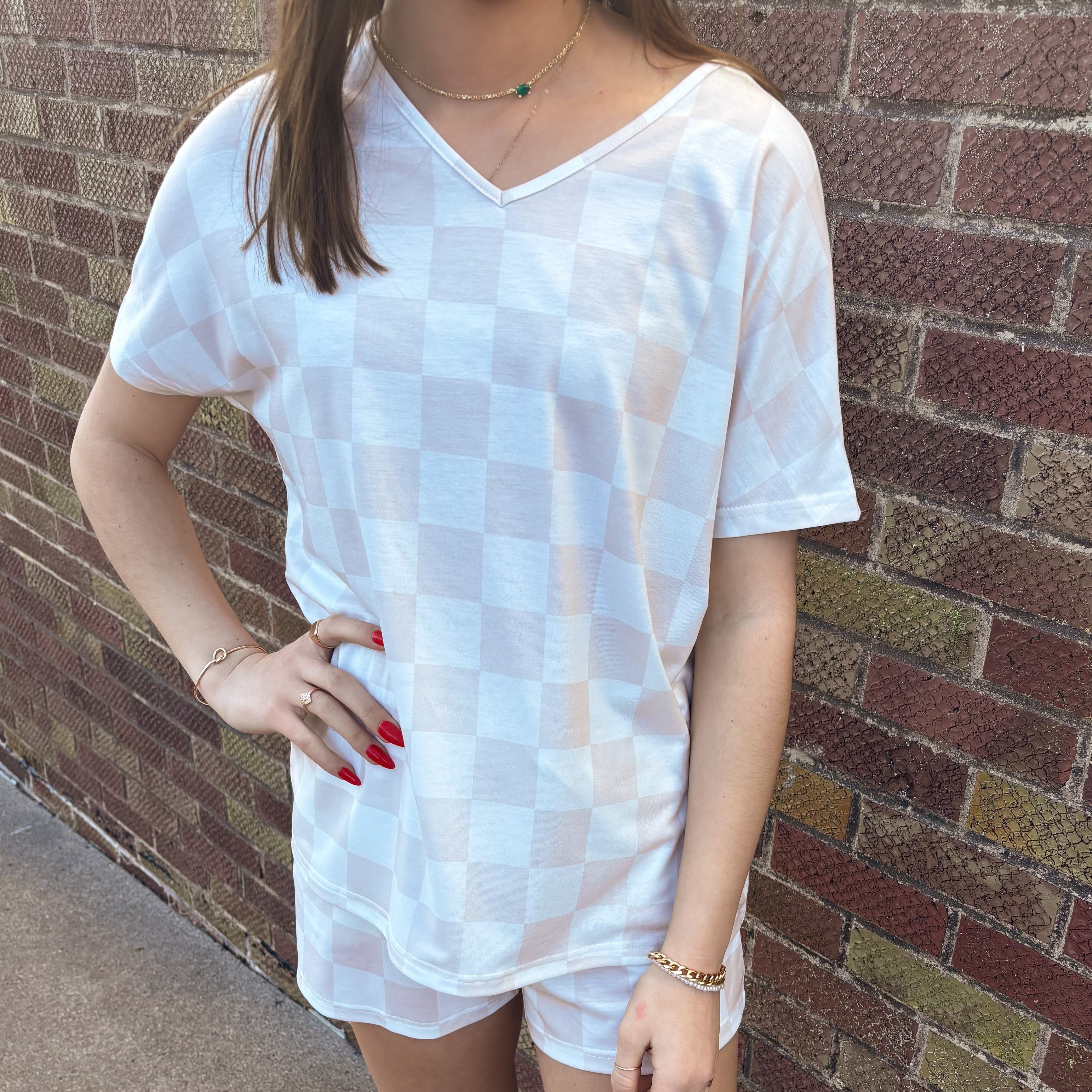 This Checkered Vneck Top offers a stylish and timeless look with its checkered design. Made from soft and comfortable fabric, it provides both style and comfort. The V-neck adds a flattering touch, making it a must-have piece for any wardrobe.