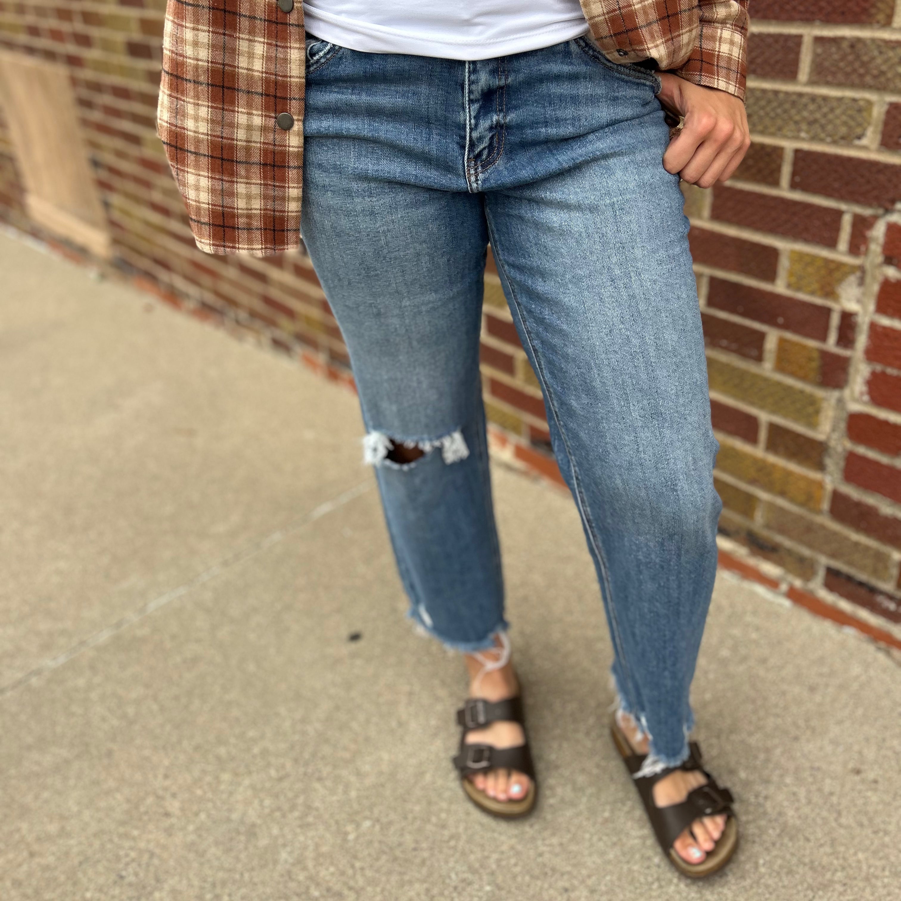 High rise slim wide jeans Comfort stretch denim, high rise waist, distressed detail, frayed hem, ankle length, slim wide jeans F. Rise: 10" / inseam: 27 1/2" / leg opening: 17"