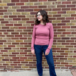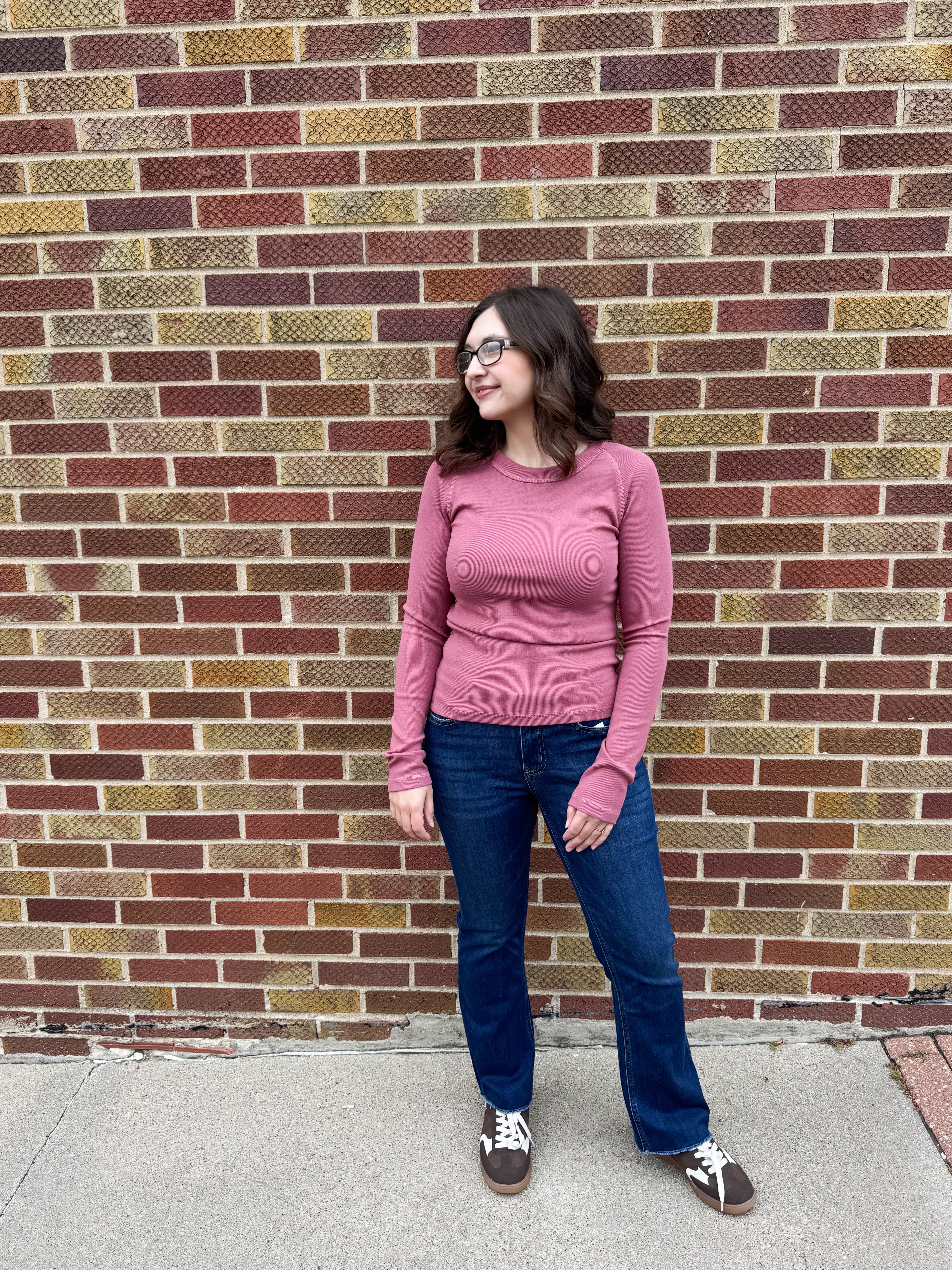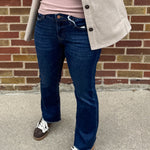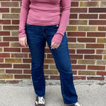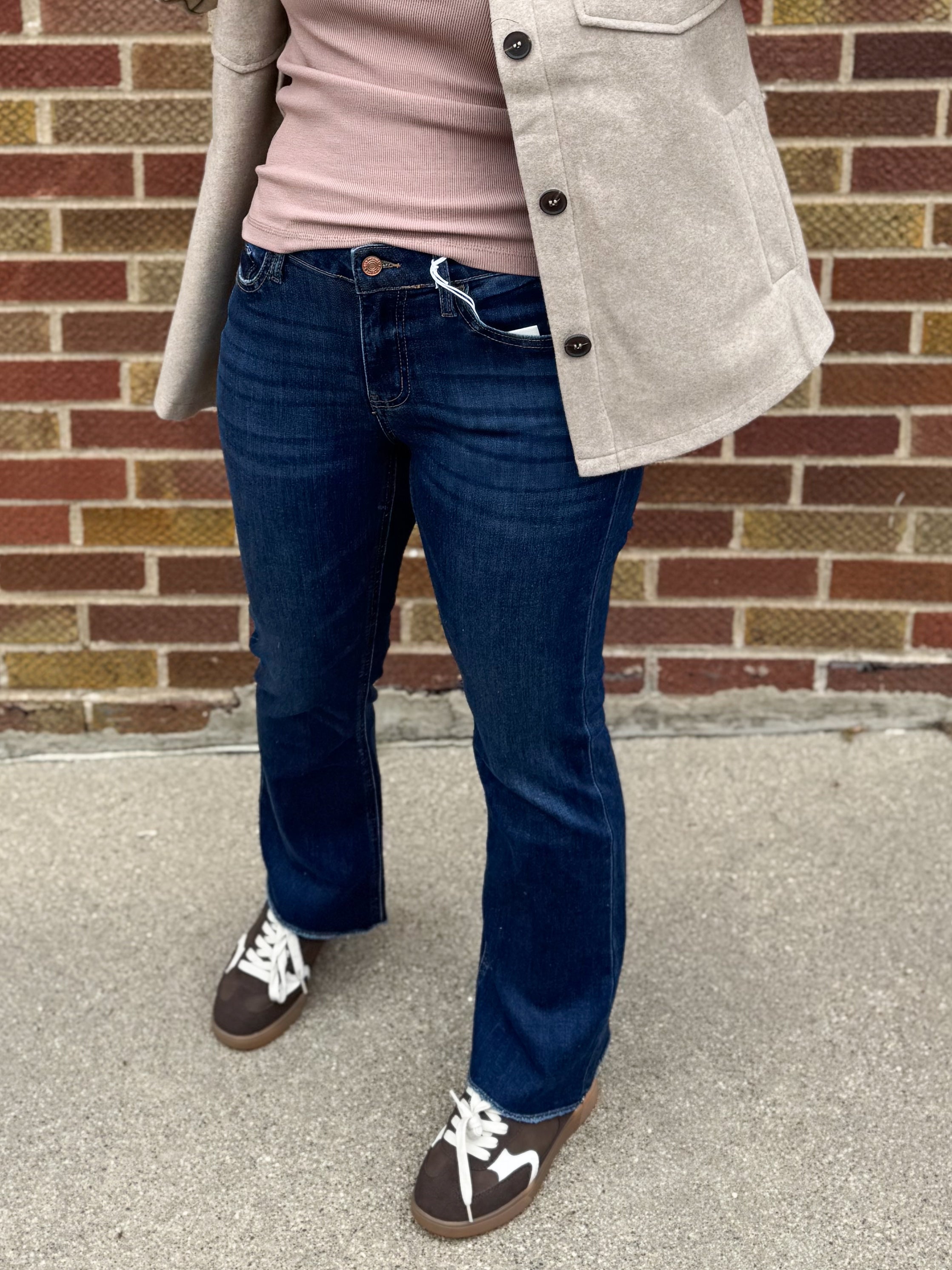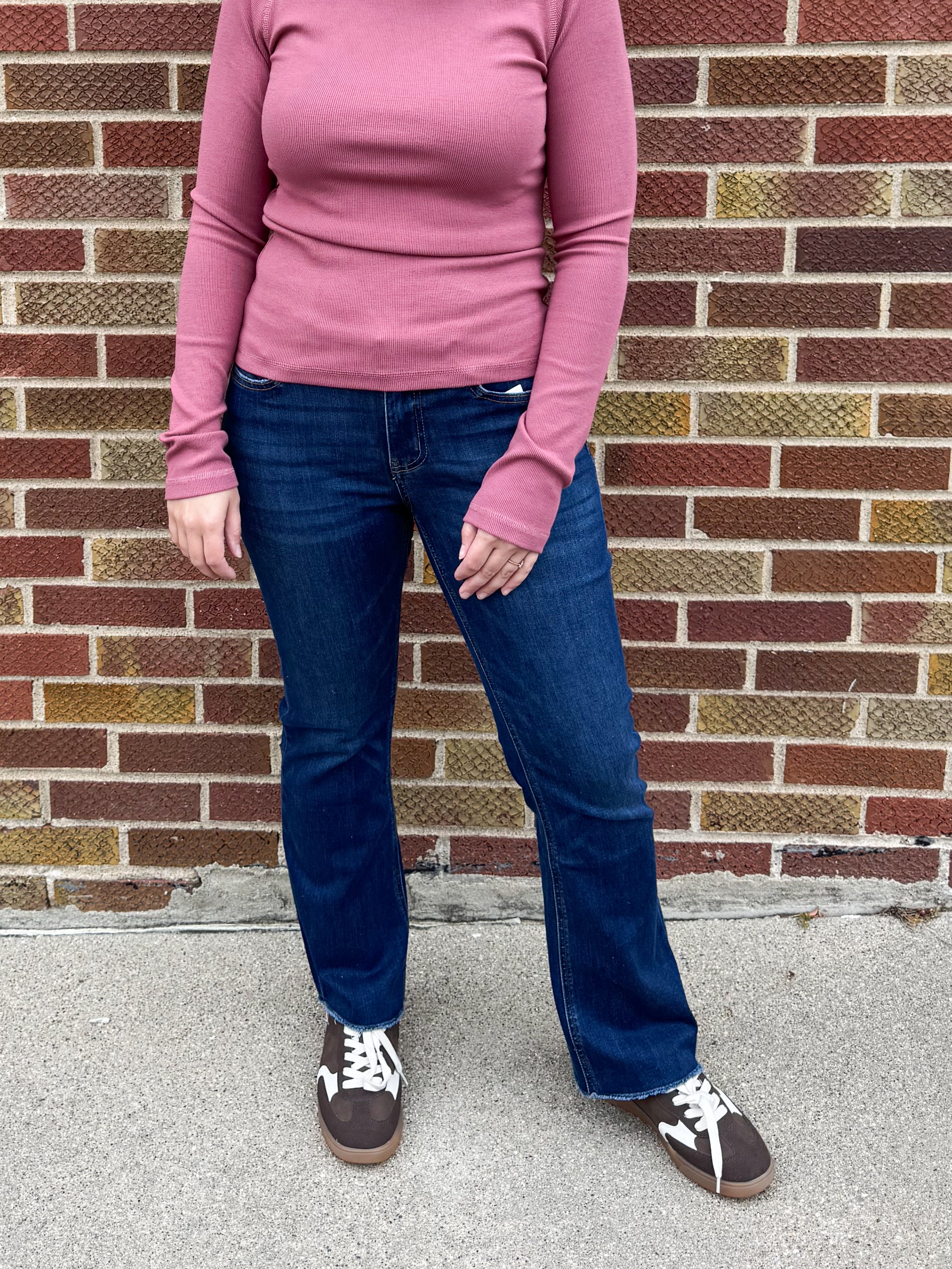 Mid rise raw hem kick flare jeans Comfort stretch denim, mid rise waist, raw hem, ankle length, kick flare jeans F. Rise: 9" / inseam: 28" / leg opening: 17 1/2" Model is 5'9" wearing a size 26