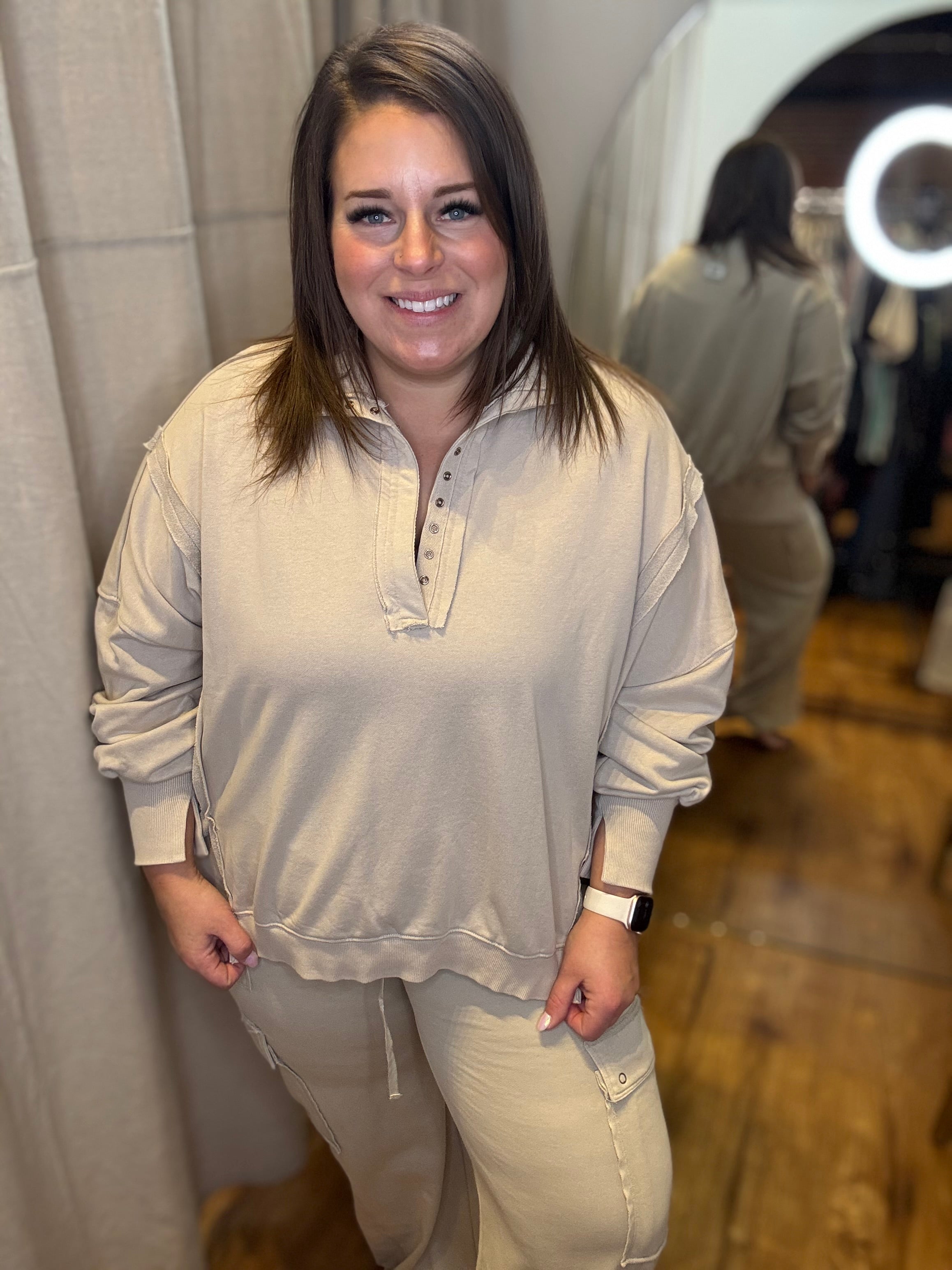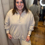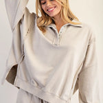 This snow washed pullover features a collared neckline with snap button detailing, dropped shoulders with exposed seam accents, voluminous balloon sleeves with ribbed cuffs featuring subtle slits, and a relaxed high-low silhouette with side slits for an effortlessly laid back look.