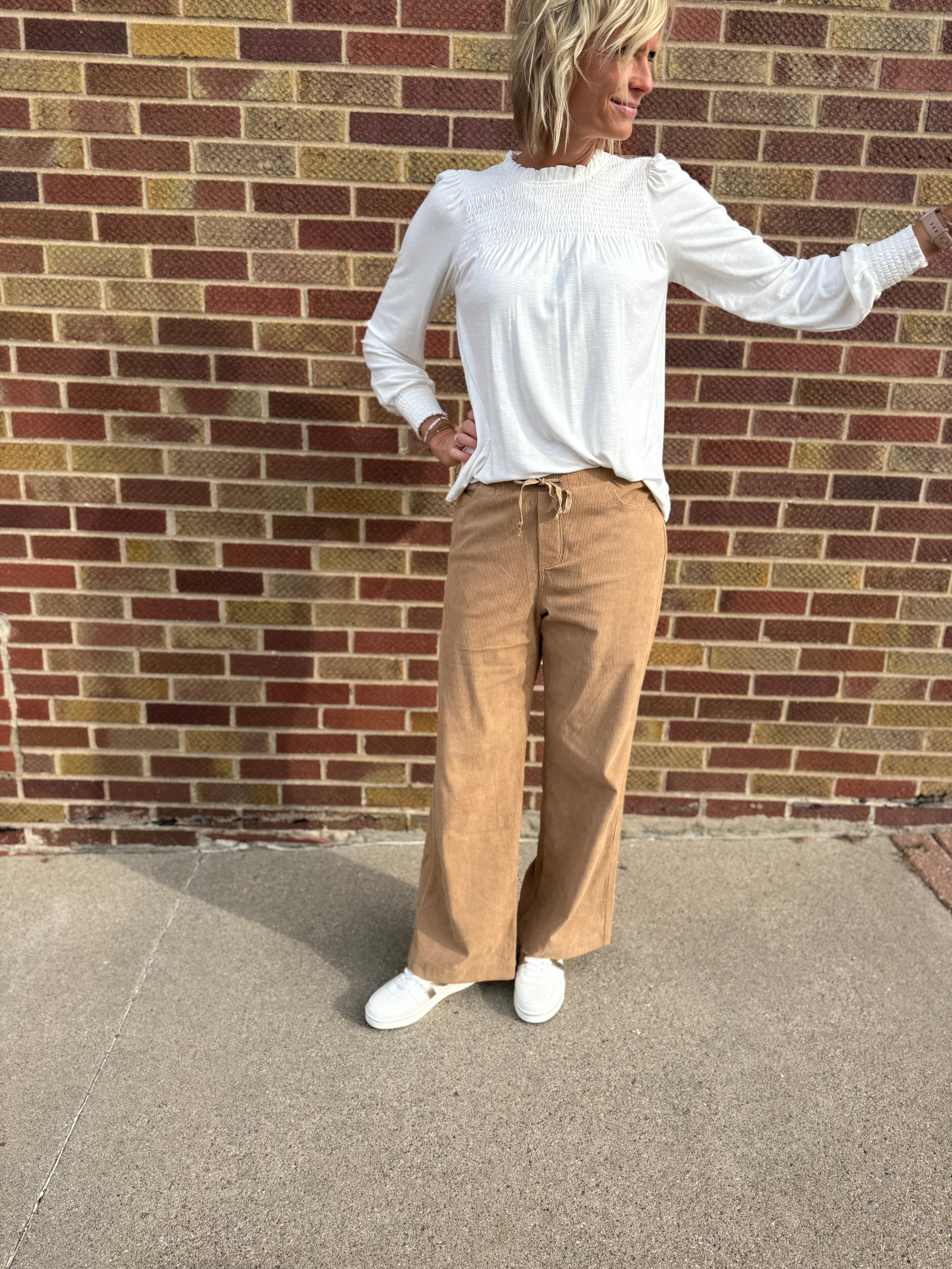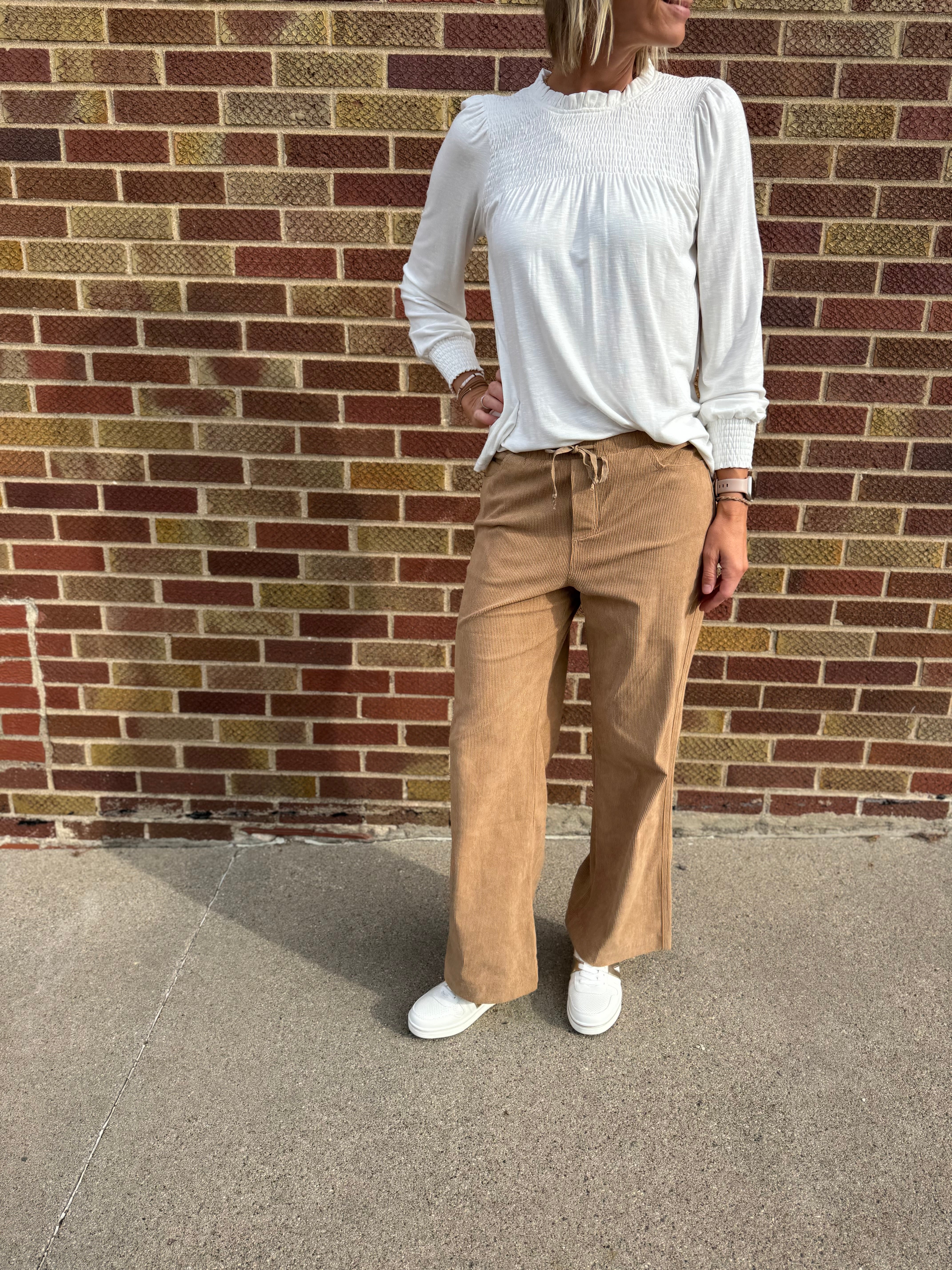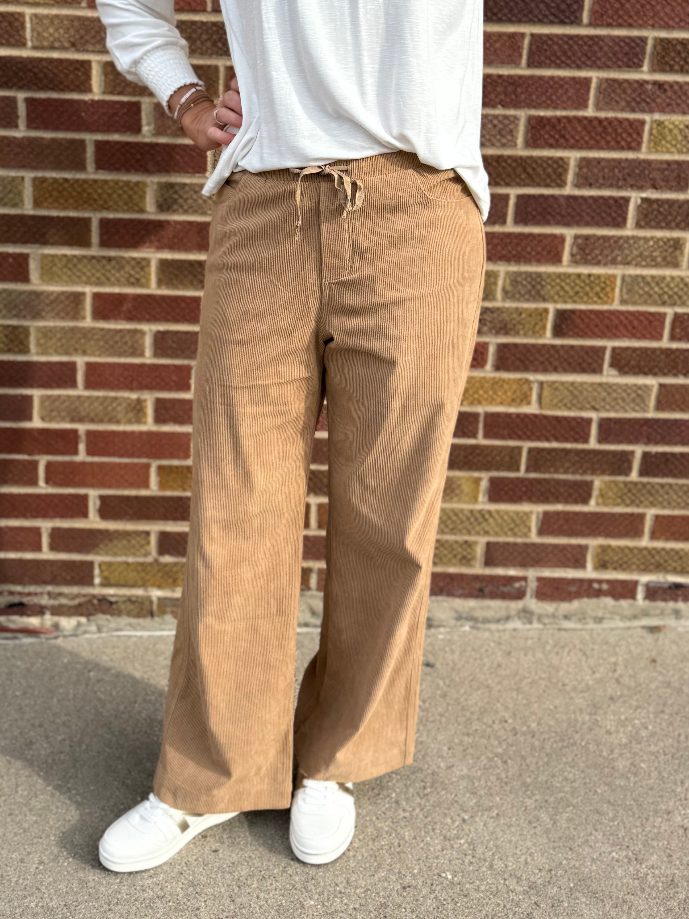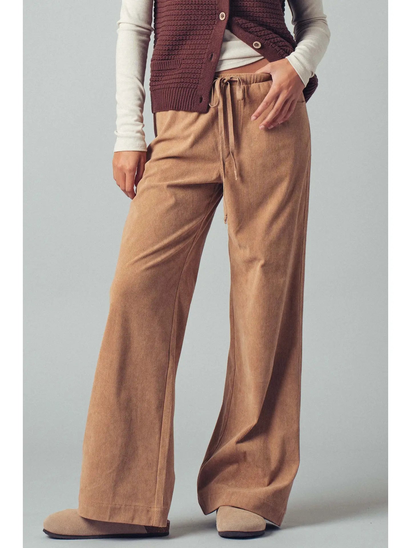 Effortless comfort meets timeless texture in these warm camel wide-leg pants, crafted from soft fine-wale corduroy. Designed with a relaxed full-length silhouette, elastic drawstring waist, and practical front and back pockets for laid-back utility and everyday wear.