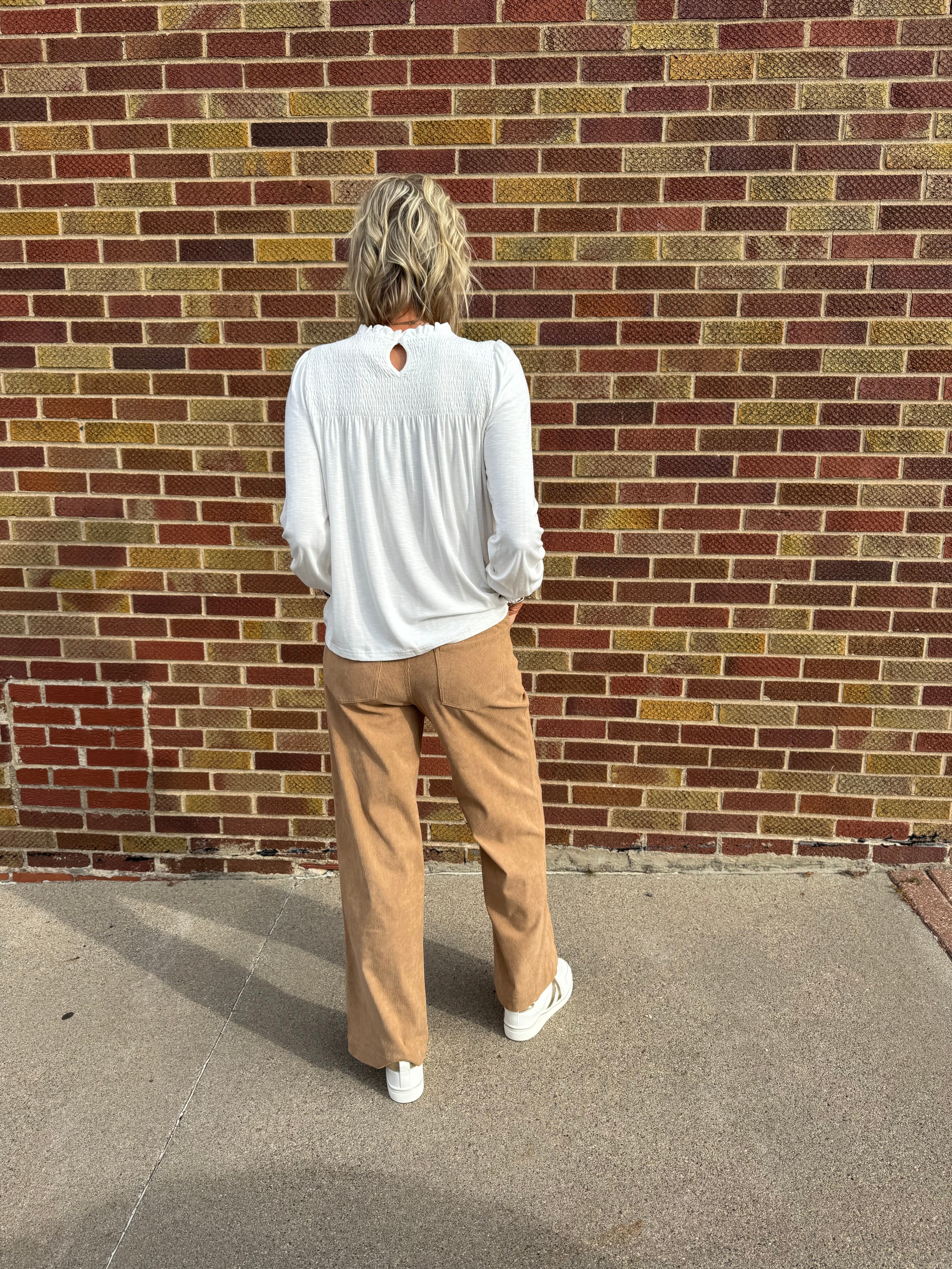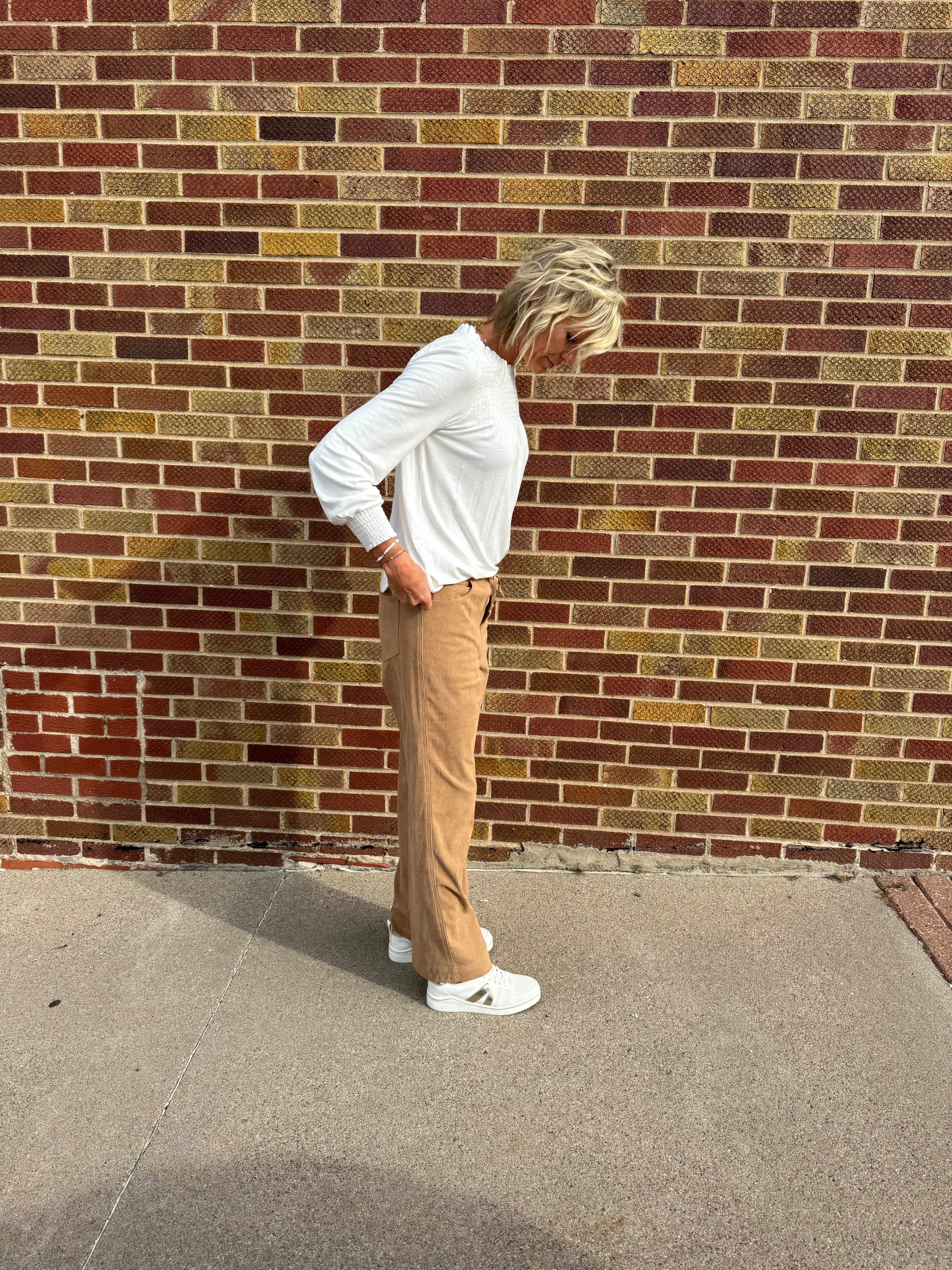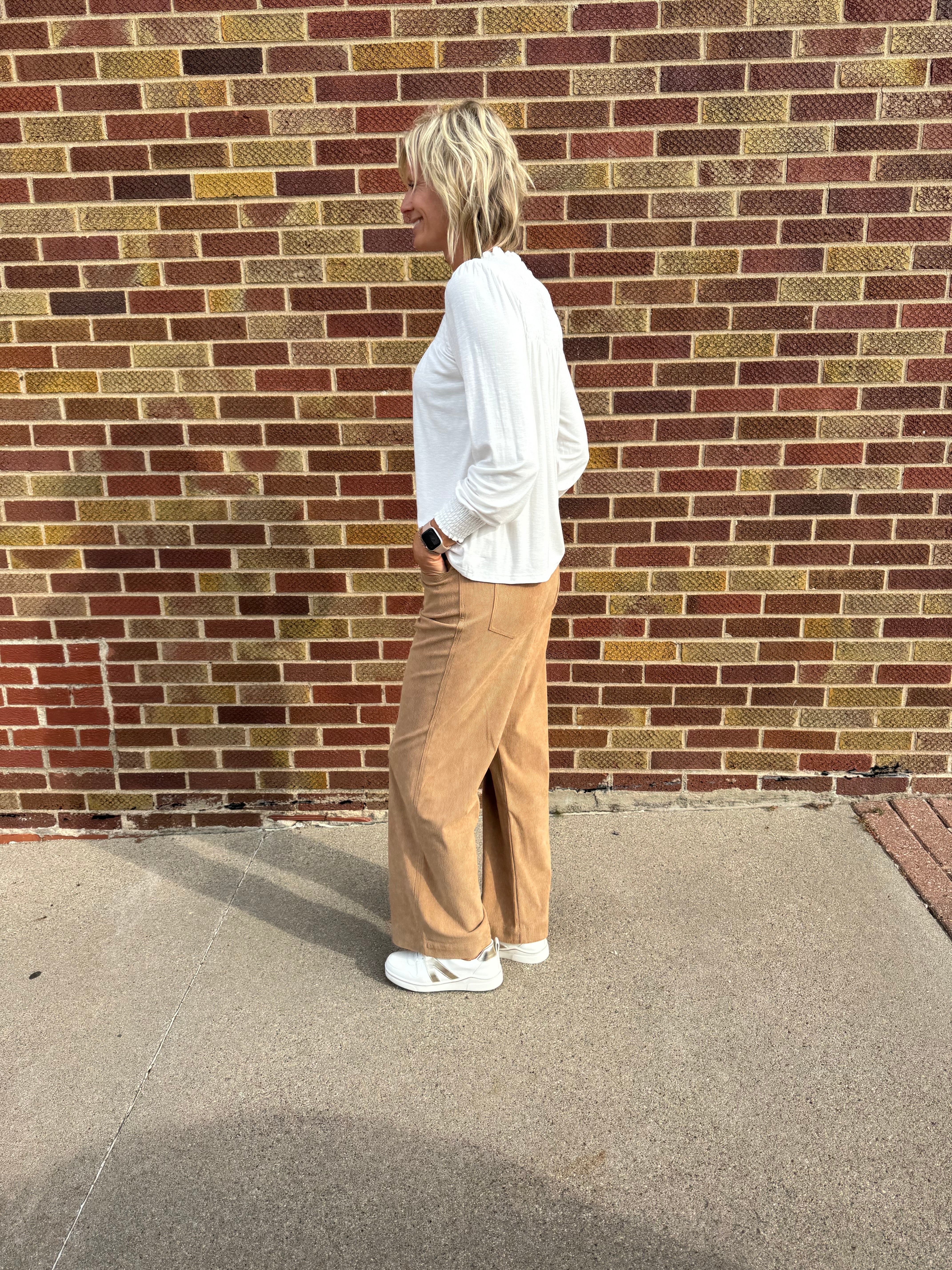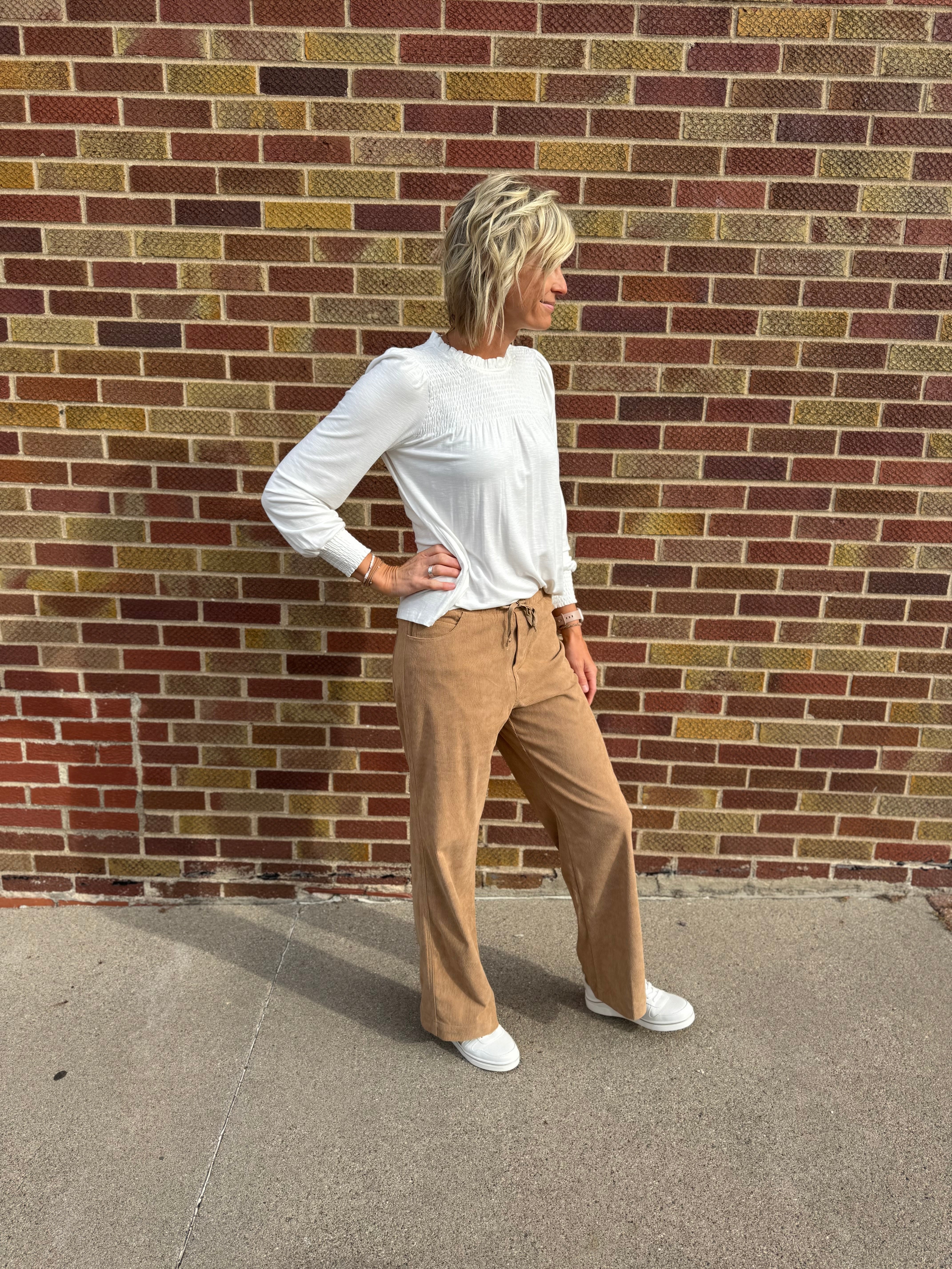 Effortless comfort meets timeless texture in these warm camel wide-leg pants, crafted from soft fine-wale corduroy. Designed with a relaxed full-length silhouette, elastic drawstring waist, and practical front and back pockets for laid-back utility and everyday wear.