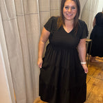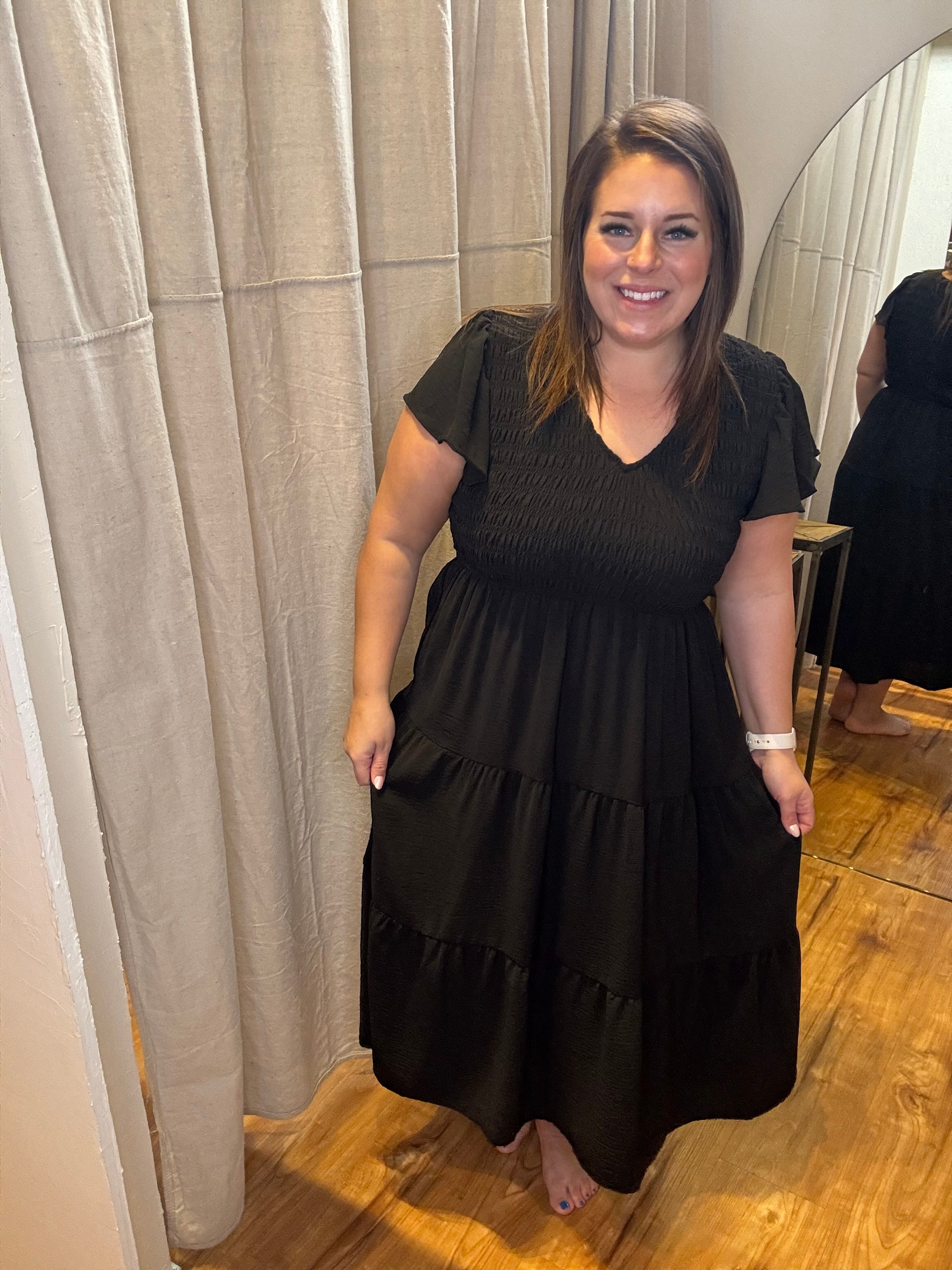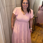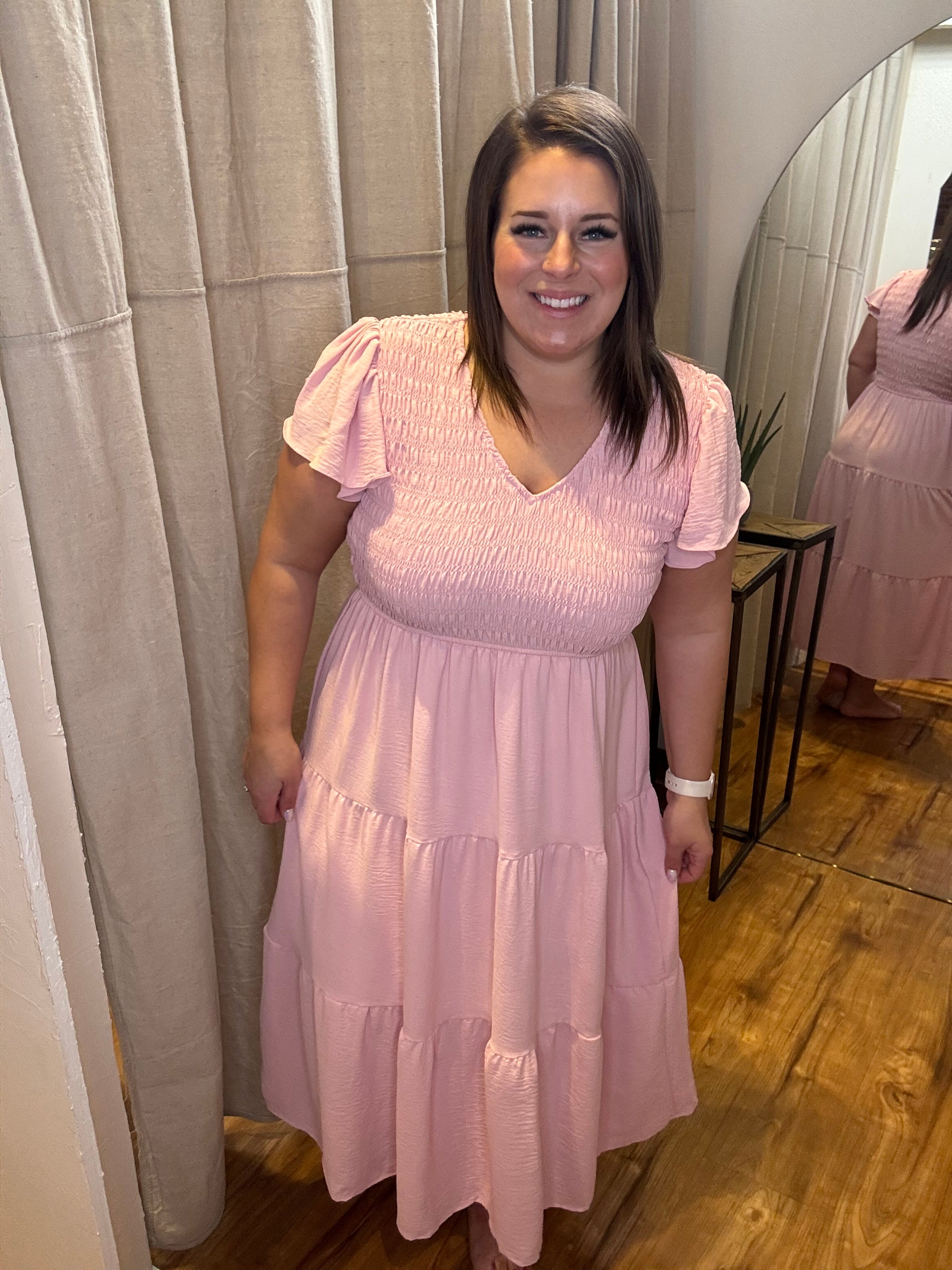 The Plus Flutter Sleeve V Neck Smocked Midi Dress combines elegance with comfort. Designed in a timeless black and light pink, this dress features flutter sleeves and smocking for an enhanced fit. Ideal for various occasions, it offers versatility while maintaining a sophisticated silhouette, ensuring a polished look at any event.