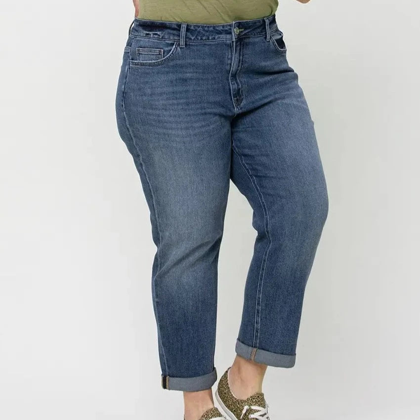 Description: plus cuffed stretch boy friend - Comfort stretch denim, high waisted, cropped length, cuffed hemline, relaxed through the thighs legs
