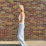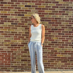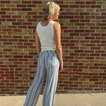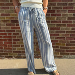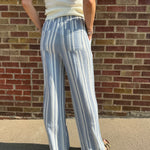 Elevate your casual wear with Benny Pants. Featuring an elastic waist and drawstring, side and back pockets, these pants provide both comfort and style. The ivory and blue striped design adds a touch of sophistication to any outfit. Expertly crafted for the modern individual.