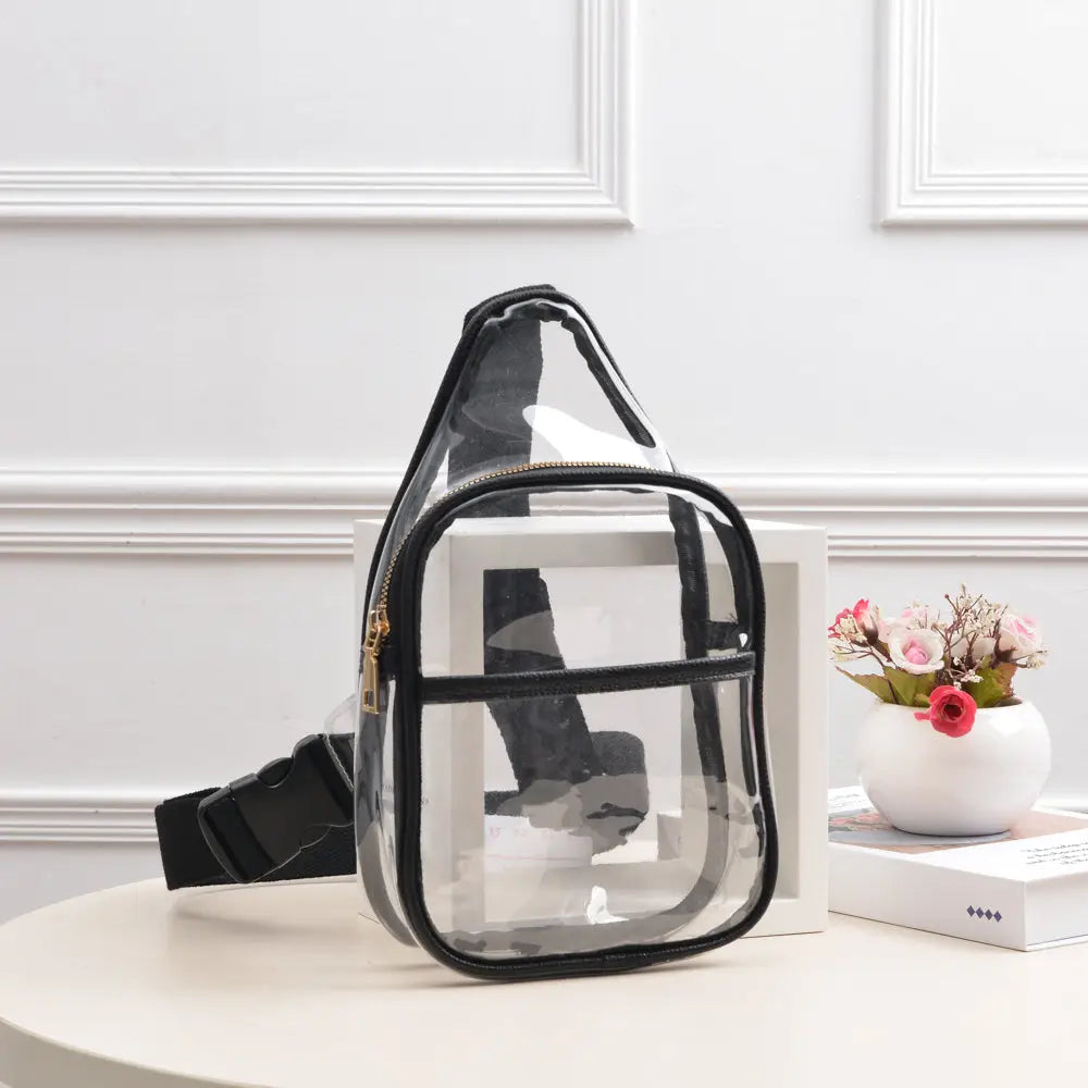 This Black/Clear Sling Bag features a convenient zipper closure for easy and secure access. Keep your belongings organized and within reach while on the go. Made with high-quality materials, this bag is both stylish and functional. Perfect for any occasion, whether it's a day out or a night on the town.