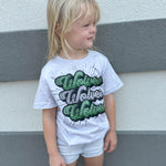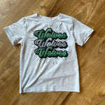 This spirit tee is perfect for all the little wolves! The Grey and Green repeating 'Wolves' logo is the shirts' highlight and makes it perfect for your little Wolves!