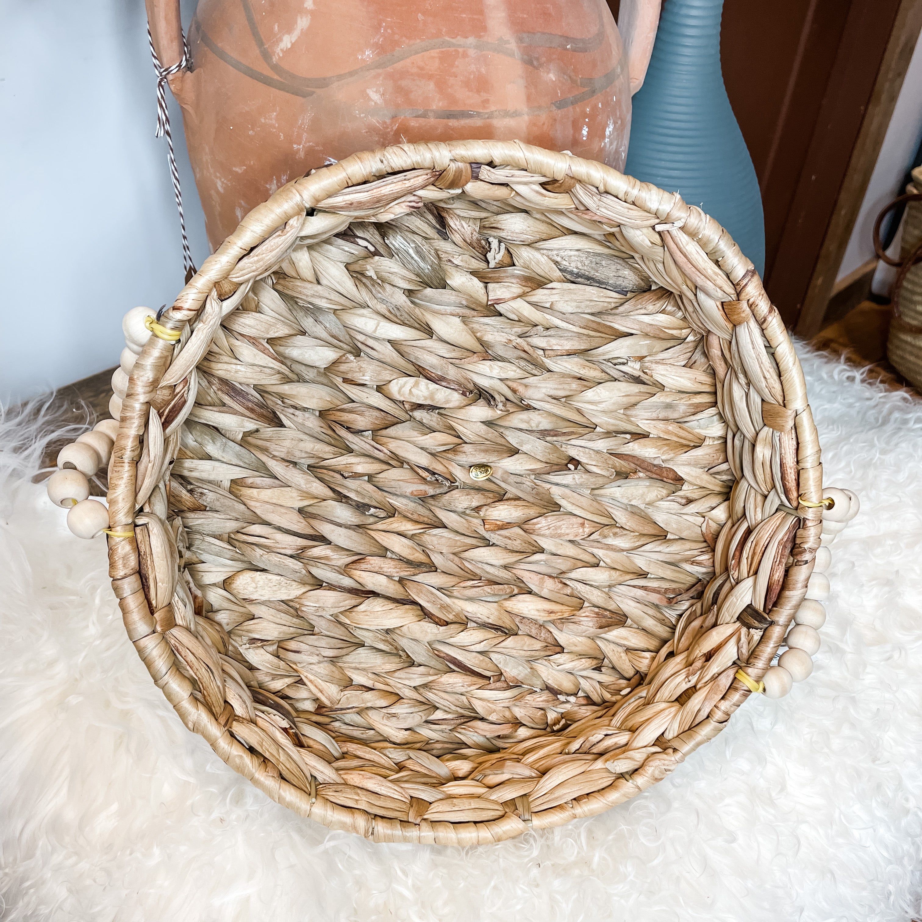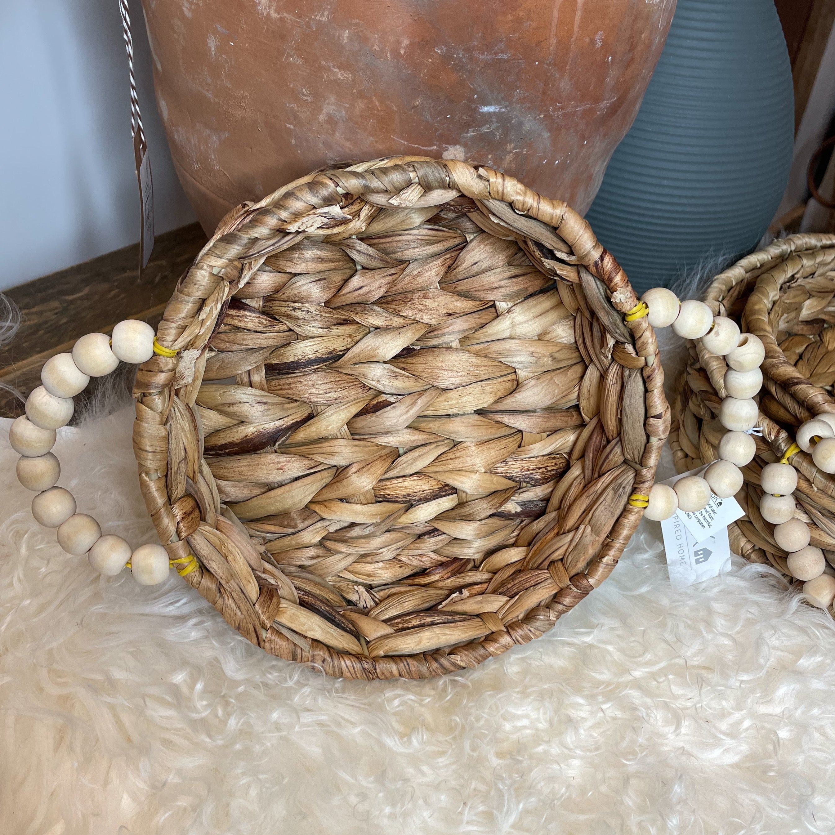 Woven Round Basket w/ Wood Bead Handle