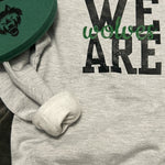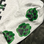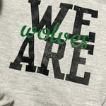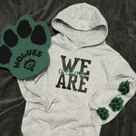 Independent trading company brand heathered athletic grey hoodie in youth sizes. Super soft and lightly fleece lined. “We are wolves” graphic on front with three black paw prints with green background on left lower sleeve.