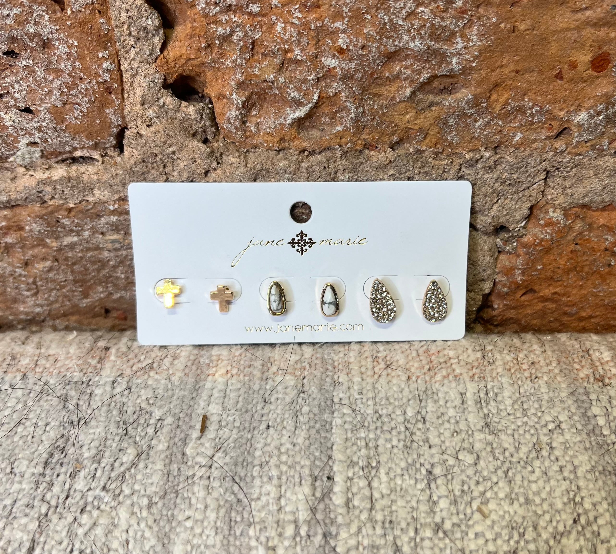 3 Stud Opal Heart/Rhinestone Teardrop/Cross Earring Set