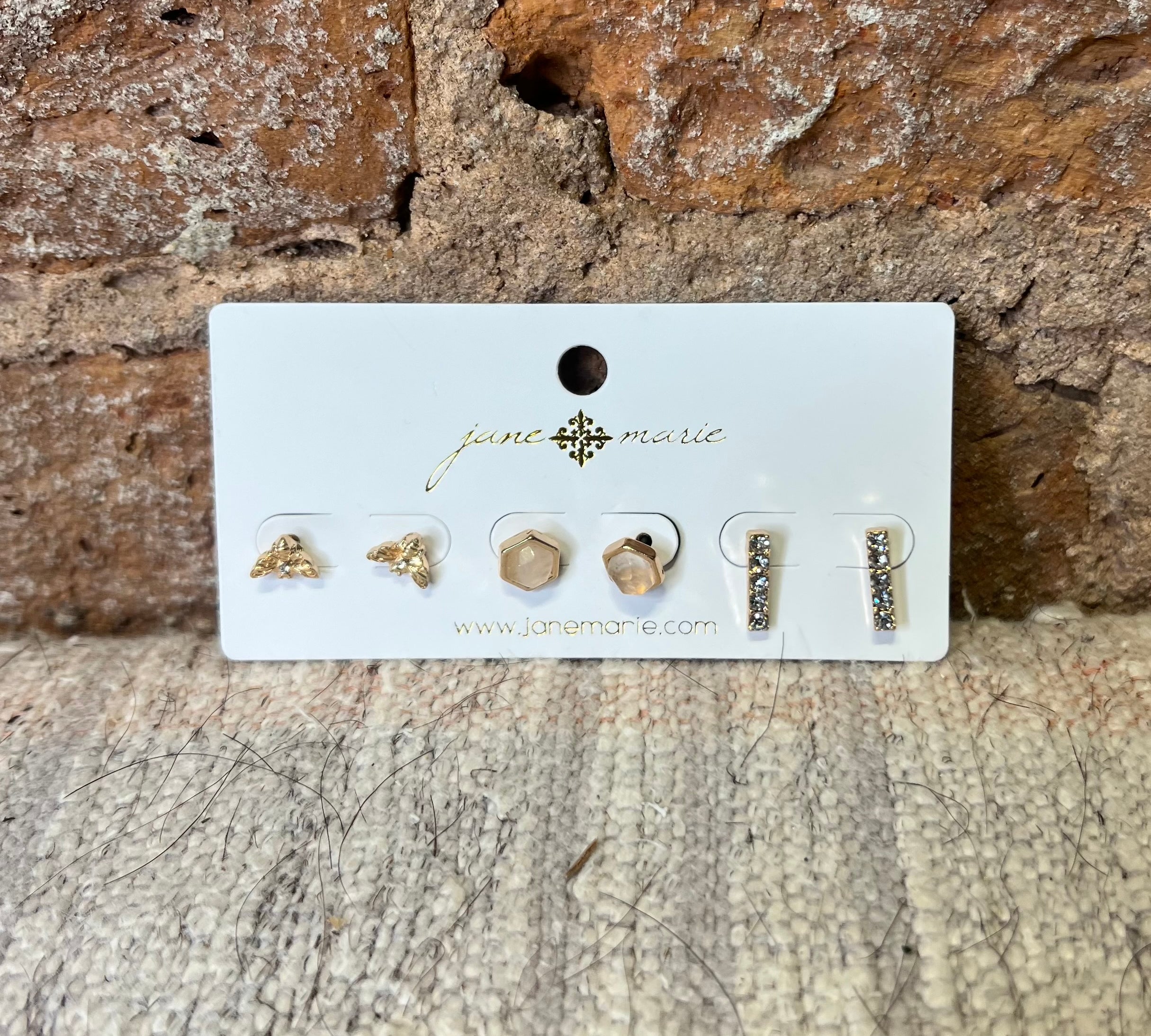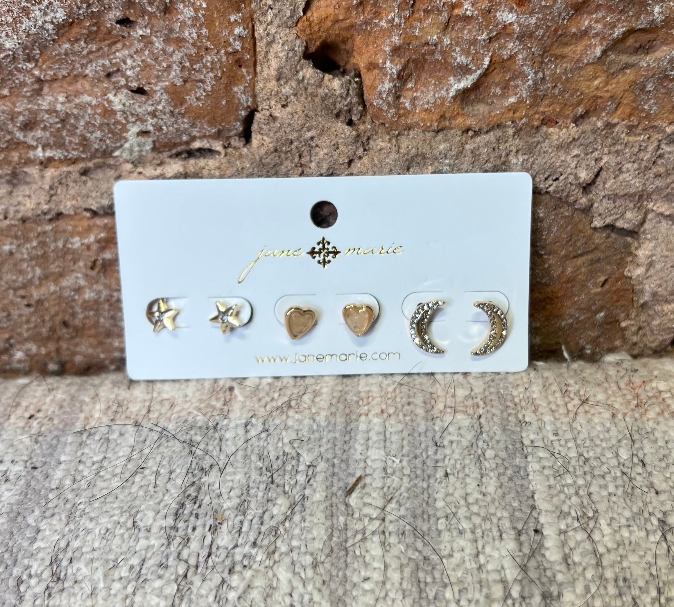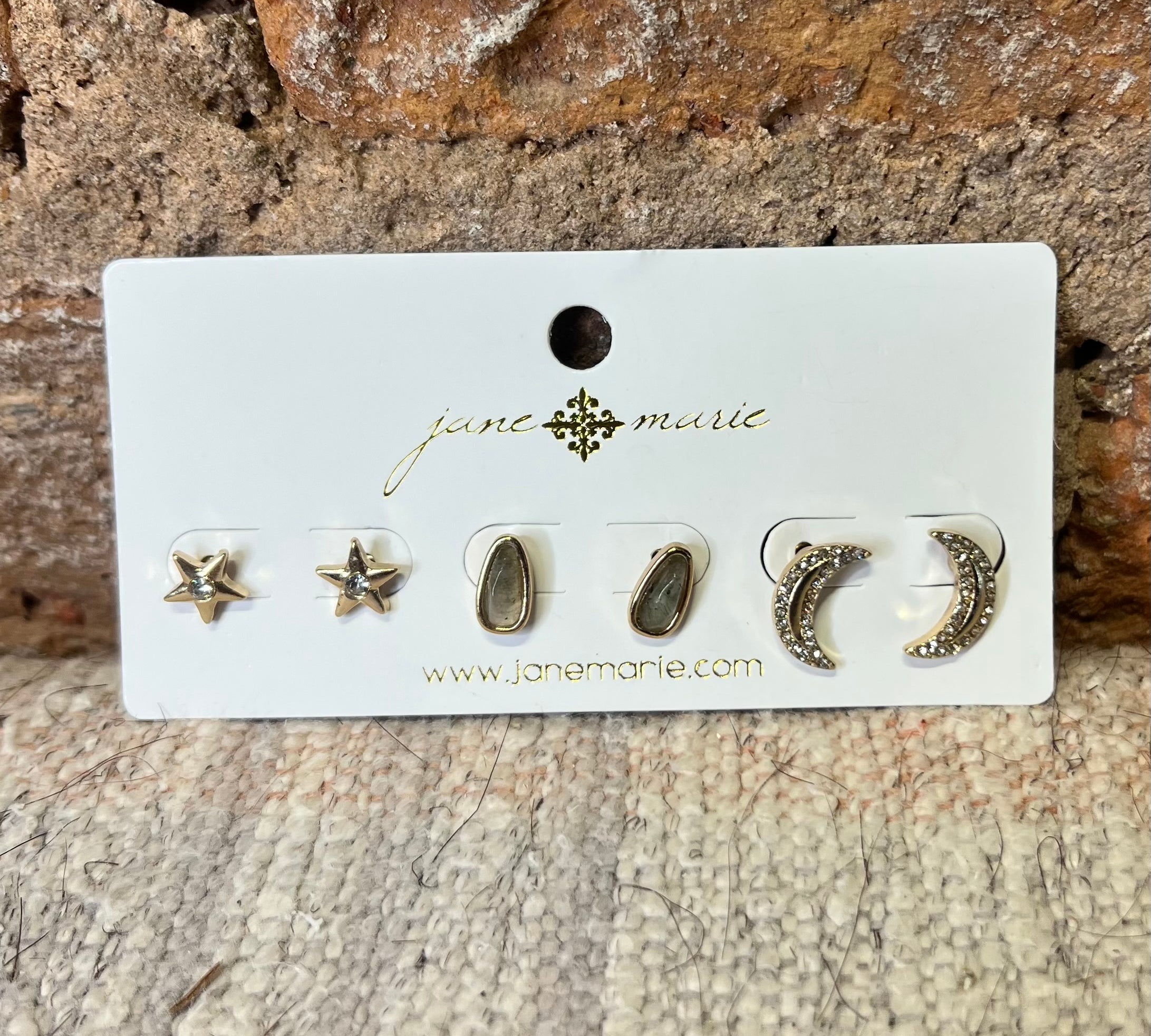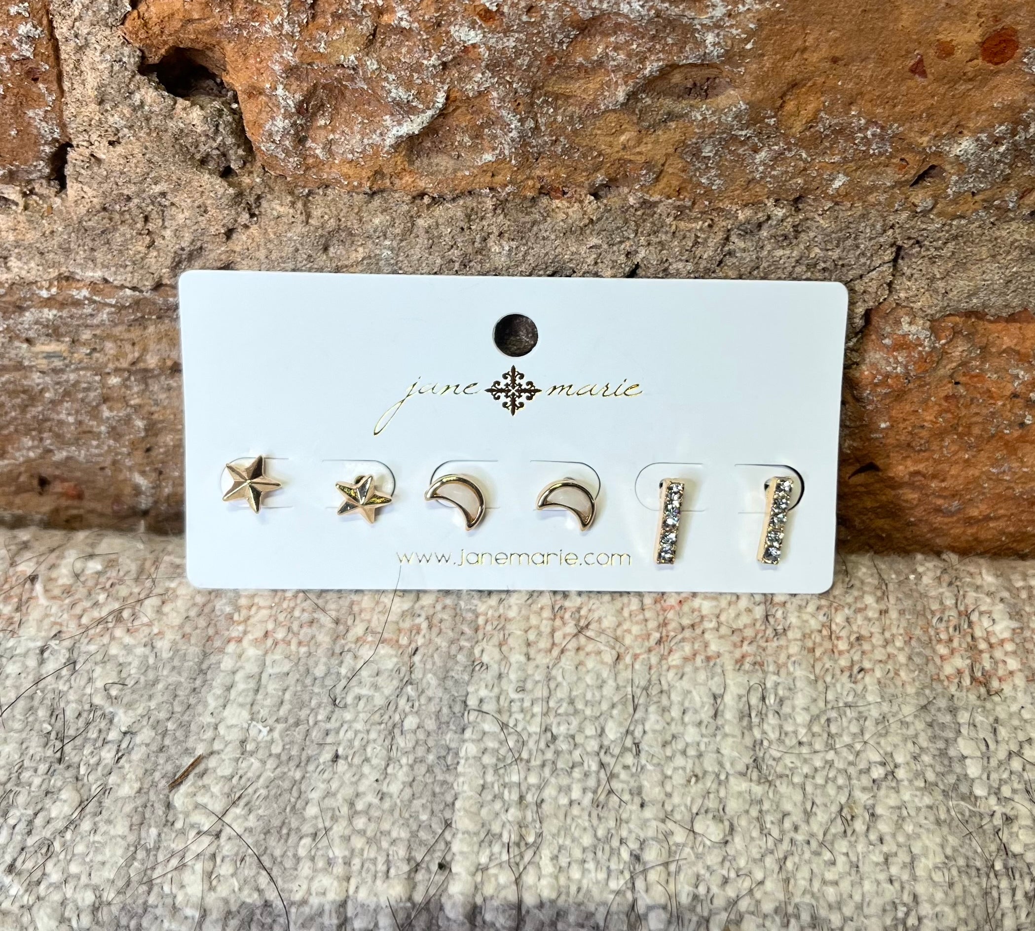 3 Stud Ivory Moon/Rhinestone Bar/Star Earring Set