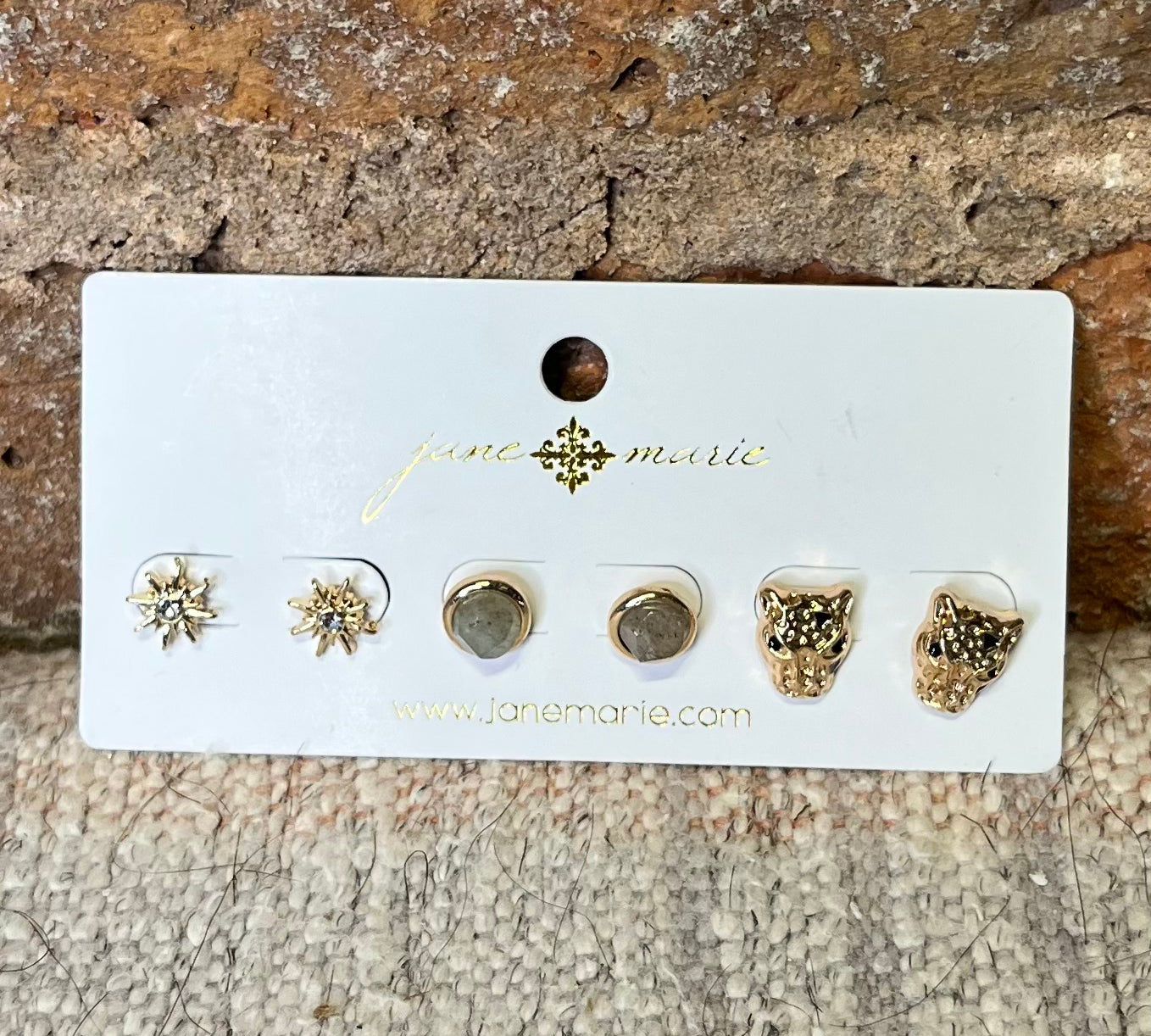 3 Stud Labradorite Circle/Jaguar Head Earring Set