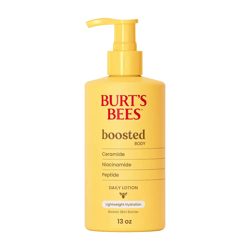 Body moisturizer: one 13 oz. bottle of burt's bees boosted body lotion with ceramide, niacinamide and peptide for 24-hour hydration