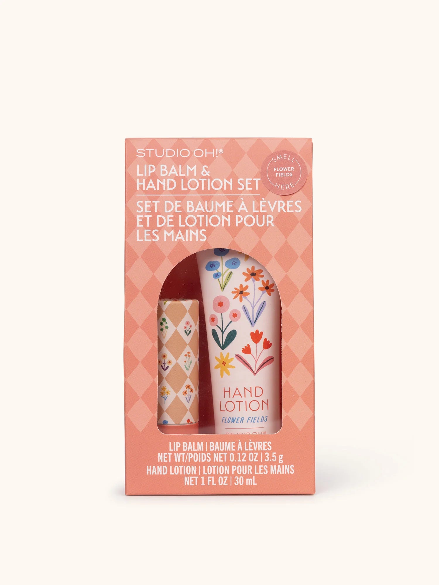 The Lip Balm Hand Lotion Set from Studio Oh! includes a 1 oz hand cream and lip balm packaged in a giftable box. The unscented lip balm helps gently moisturize and smooth dry lips, while the scented hand lotion hydrates hands and cuticles. The two-piece set is artfully designed and perfect for carrying in a handbag or gifting to a friend.