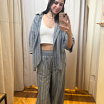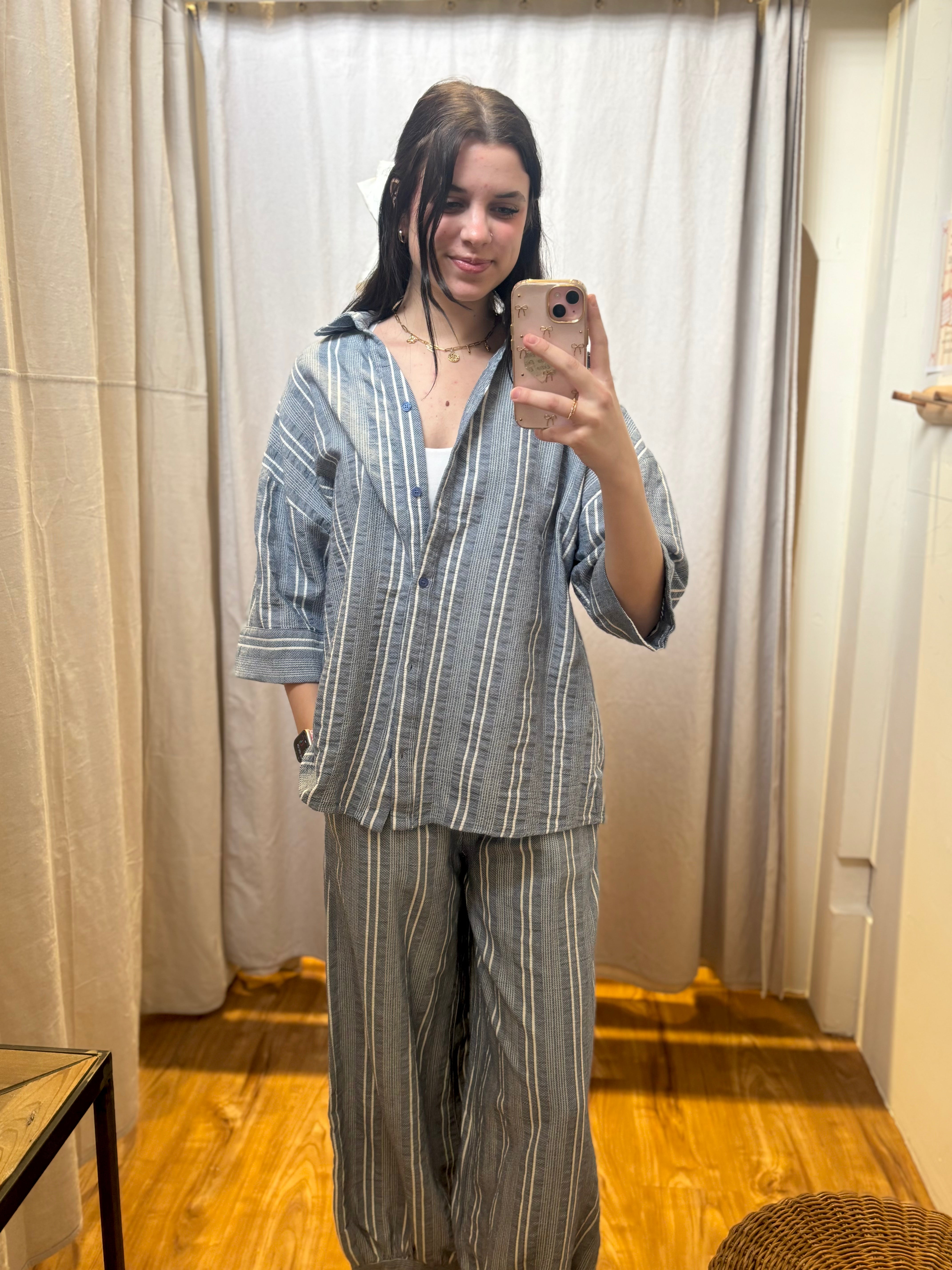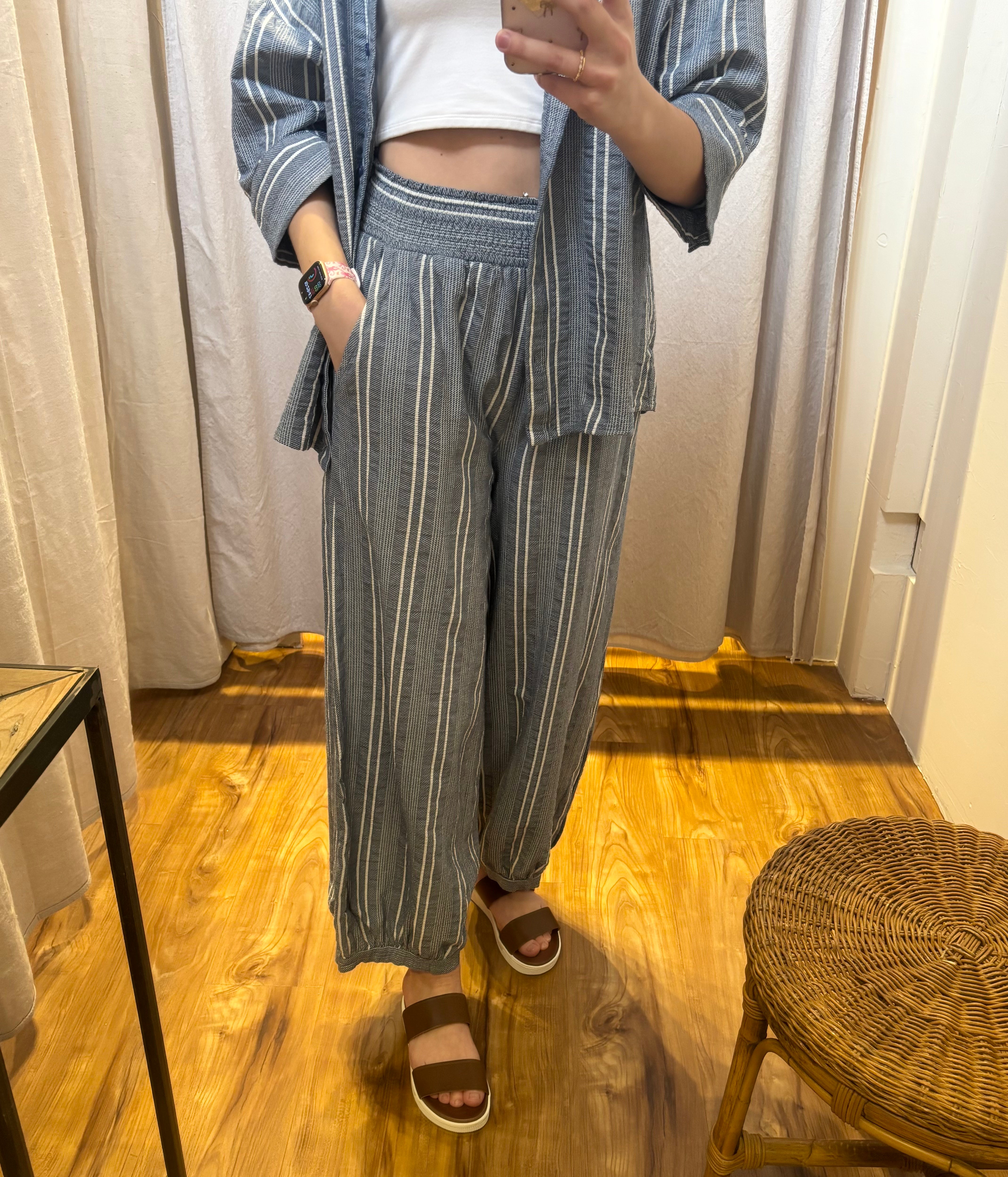 Discover the perfect balance of comfort and style with these white and blue striped pants. The relaxed, flowing fit moves with you throughout your day. These pants have an elastic waistband and pockets.