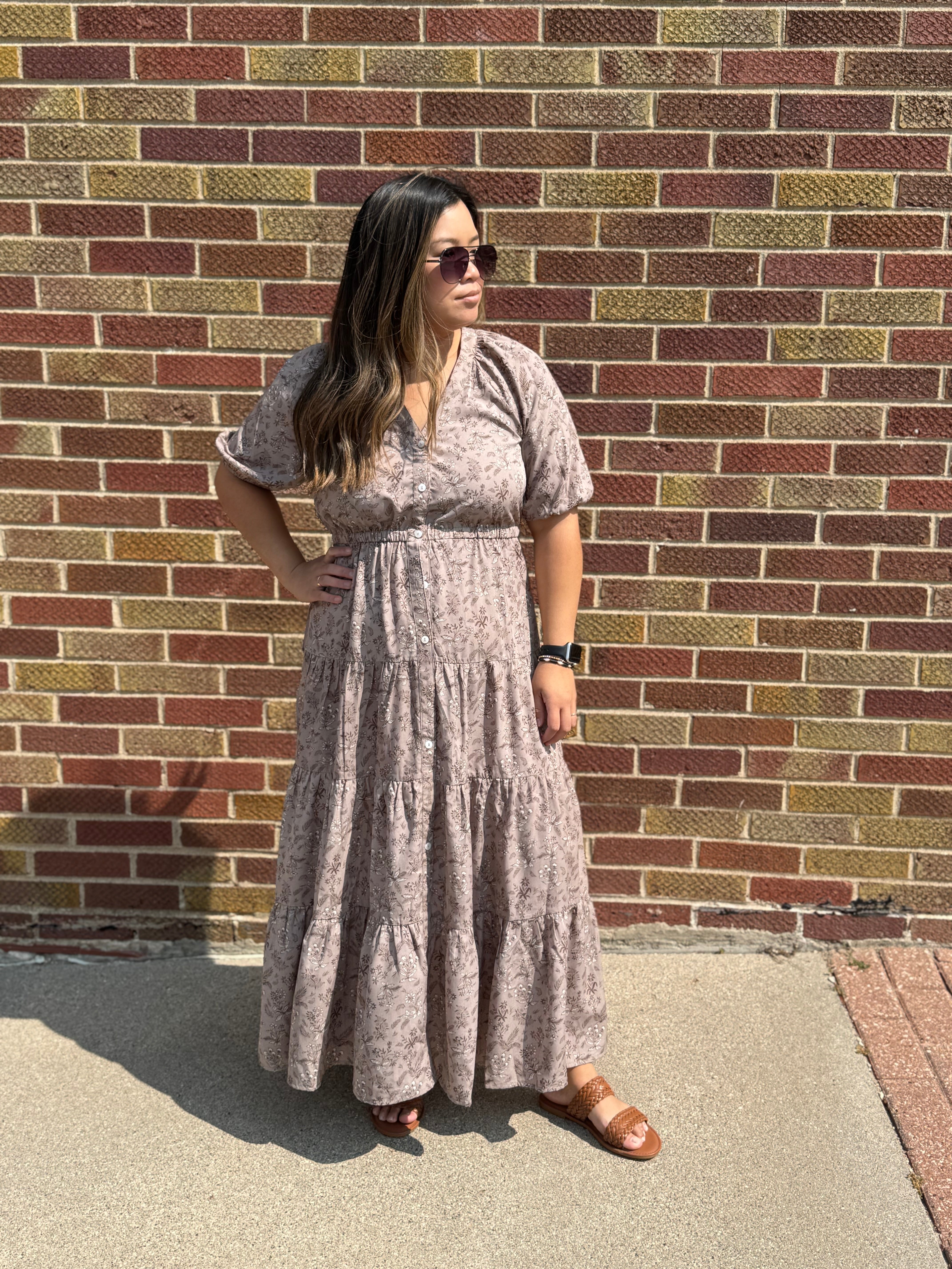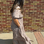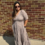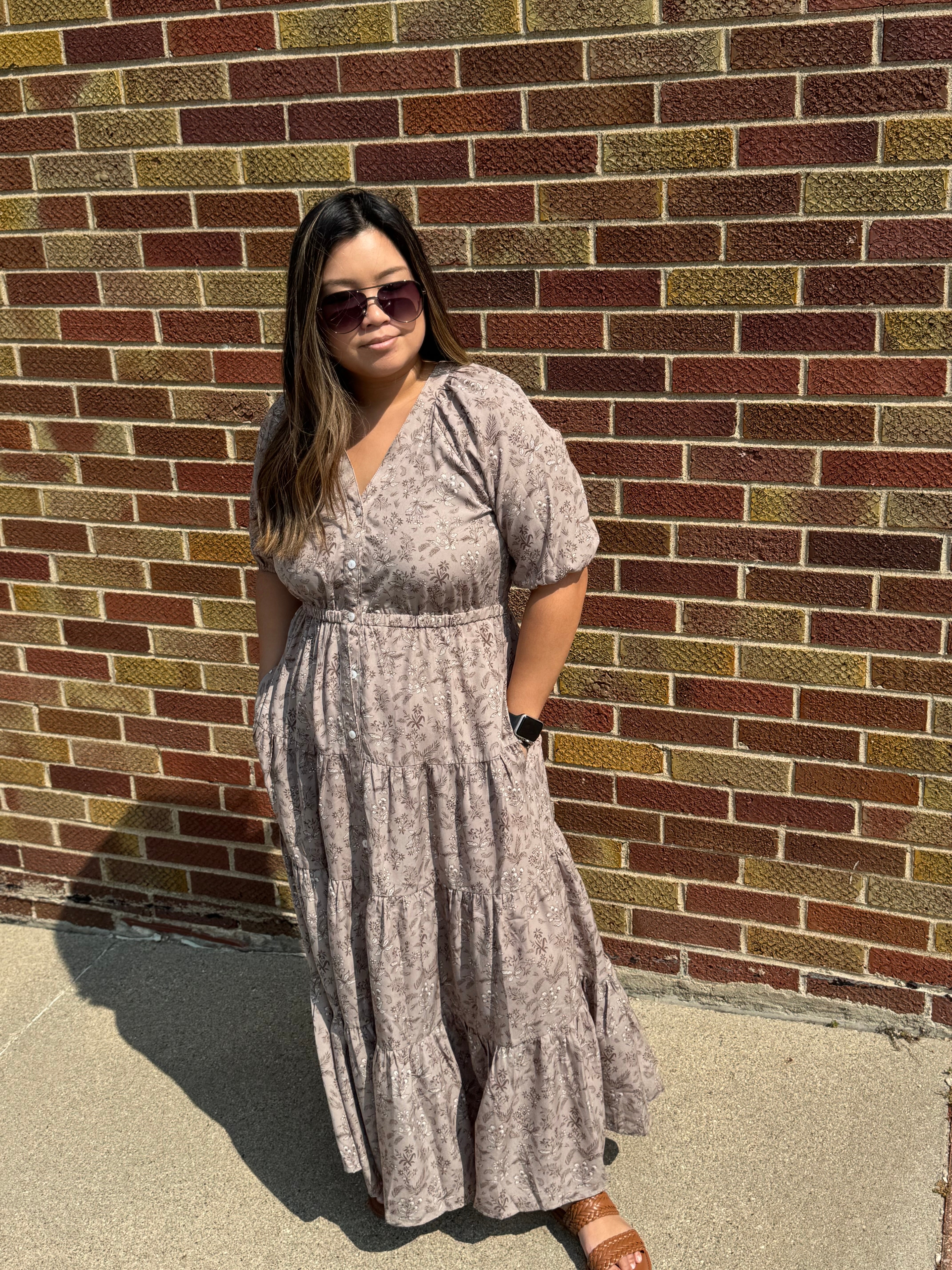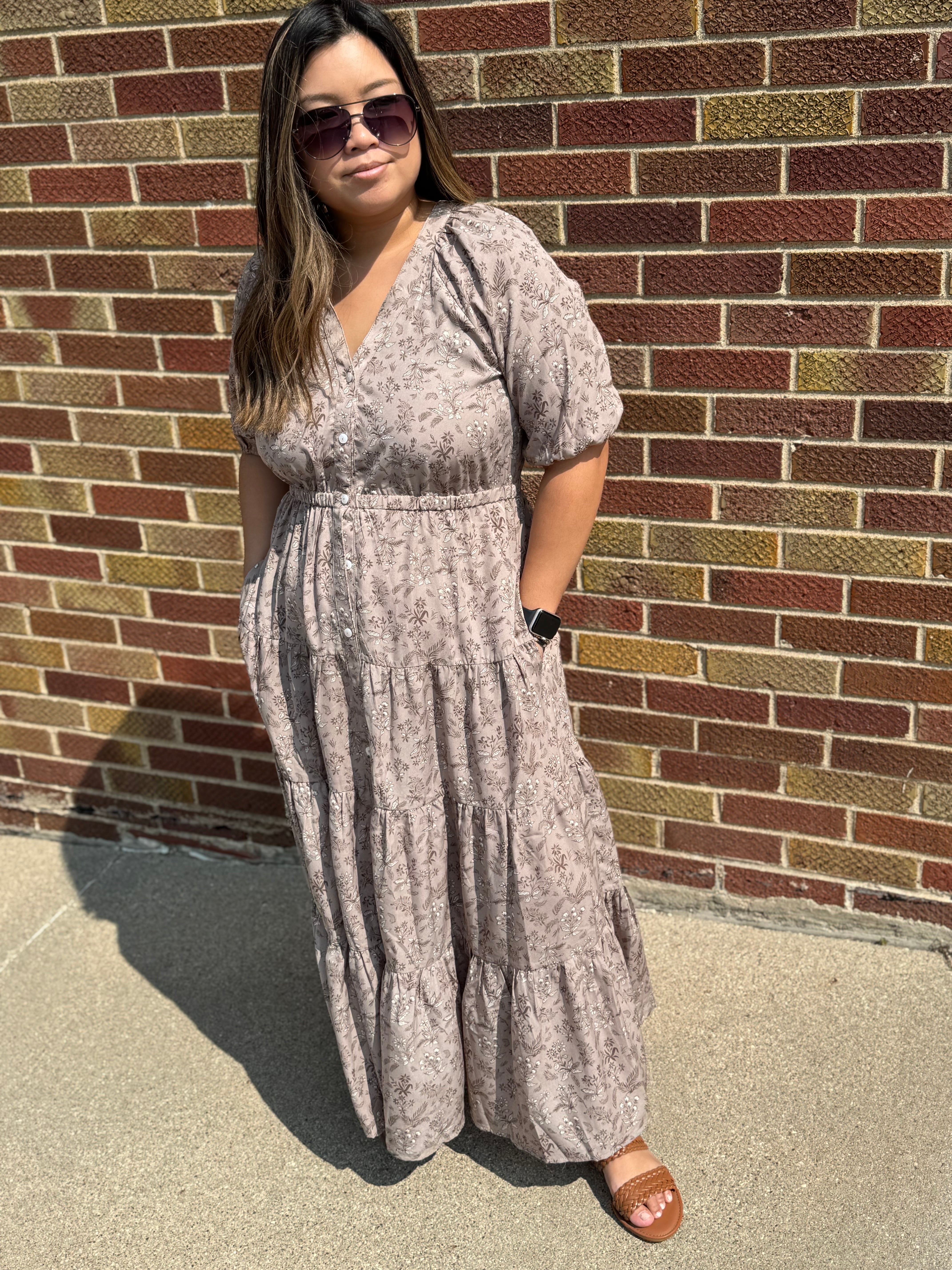 Elevate your wardrobe with this taupe floral maxi skirt, expertly designed for a flattering fit and timeless style. The soft, flowing fabric features a delicate floral pattern on a versatile taupe background, offering both sophistication and comfort.