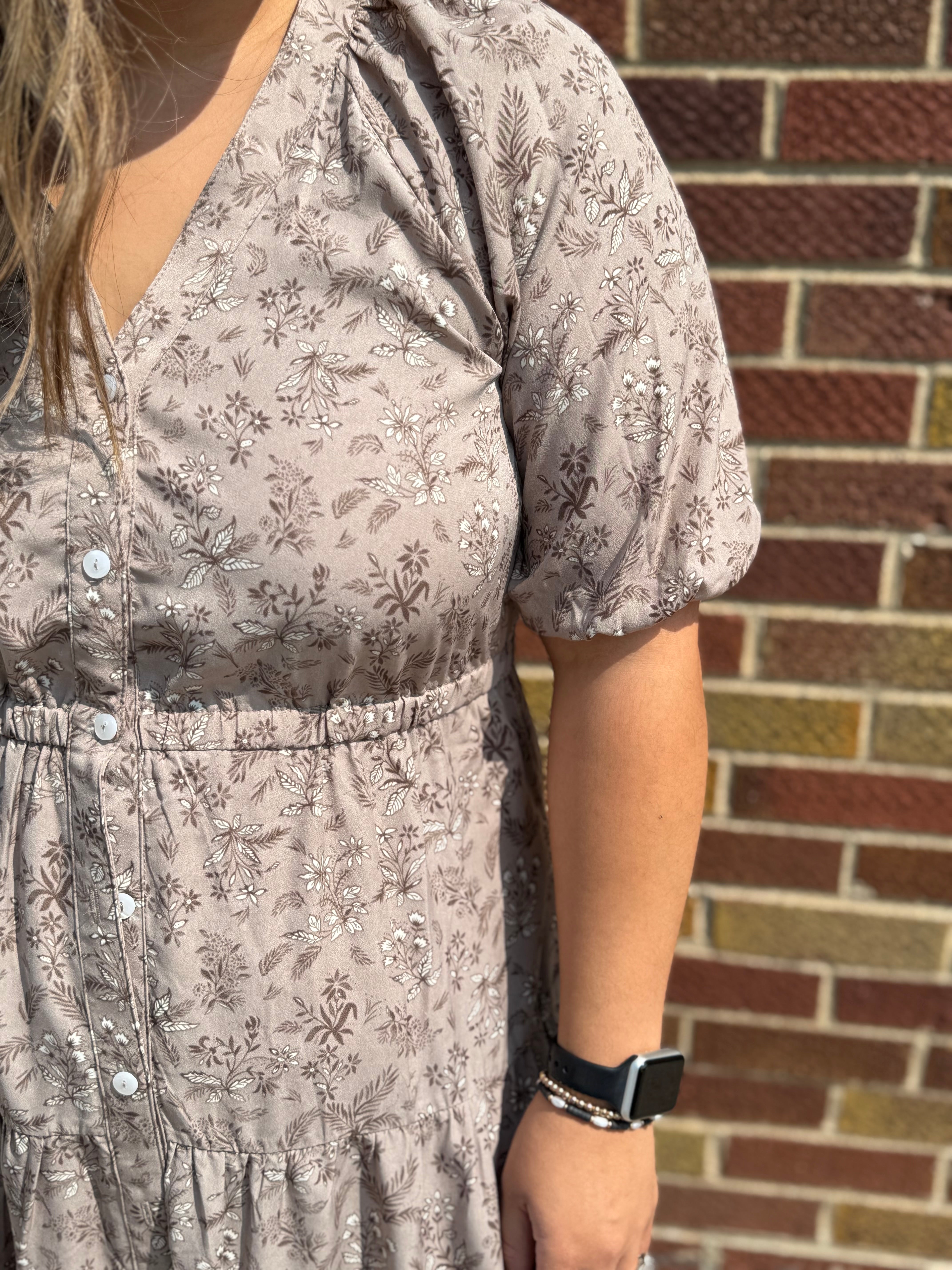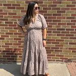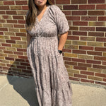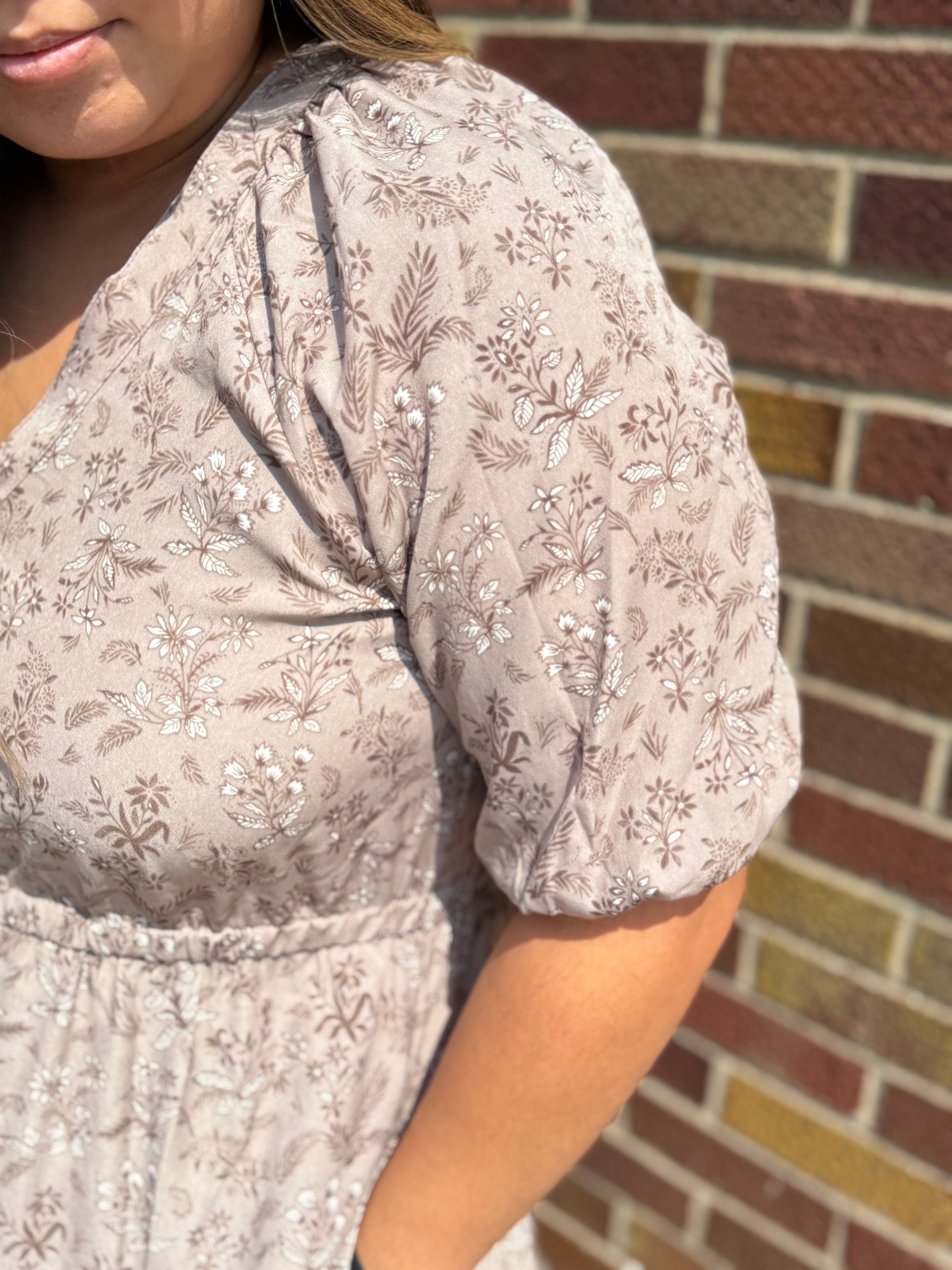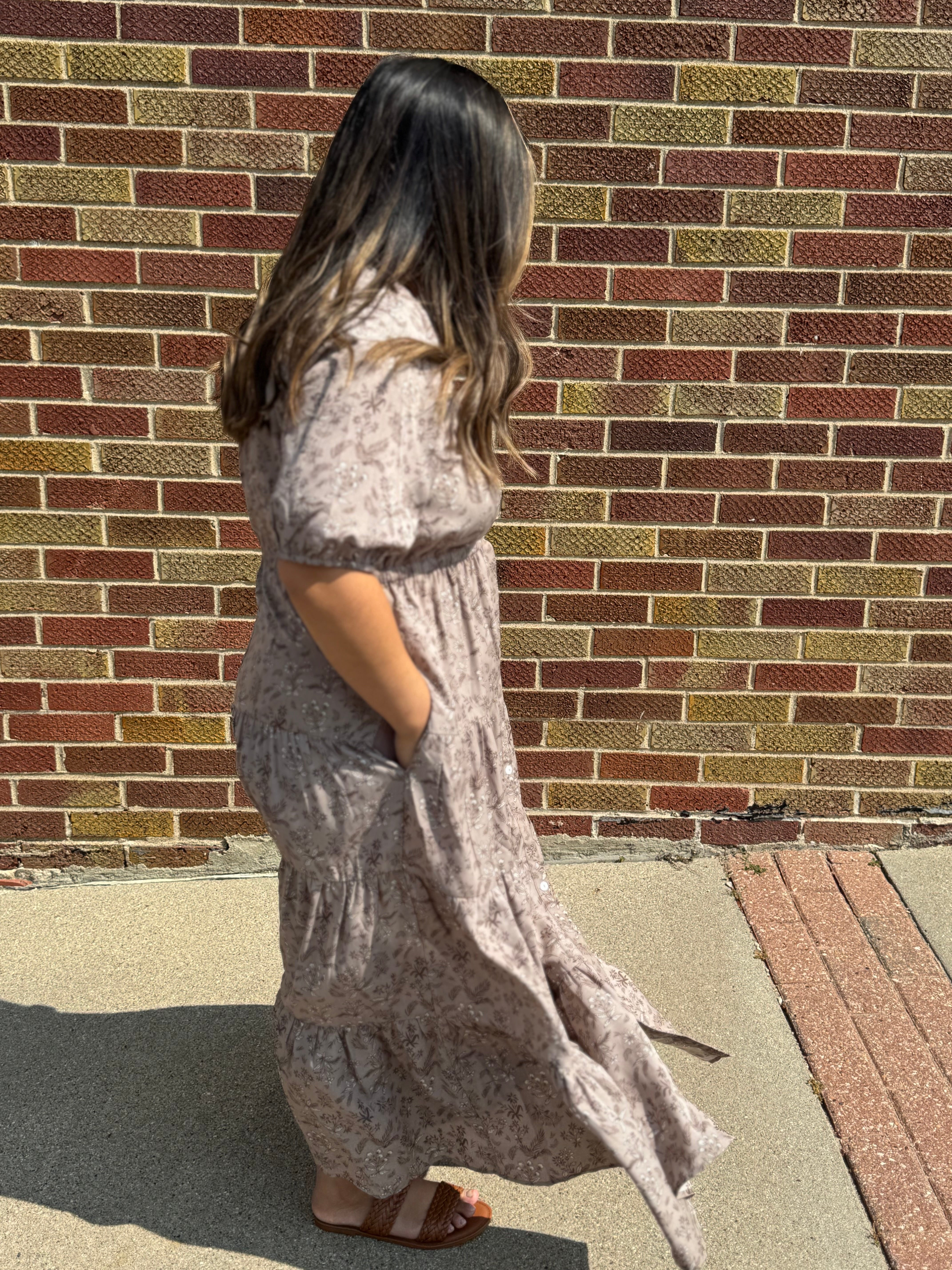 Elevate your wardrobe with this taupe floral maxi skirt, expertly designed for a flattering fit and timeless style. The soft, flowing fabric features a delicate floral pattern on a versatile taupe background, offering both sophistication and comfort.