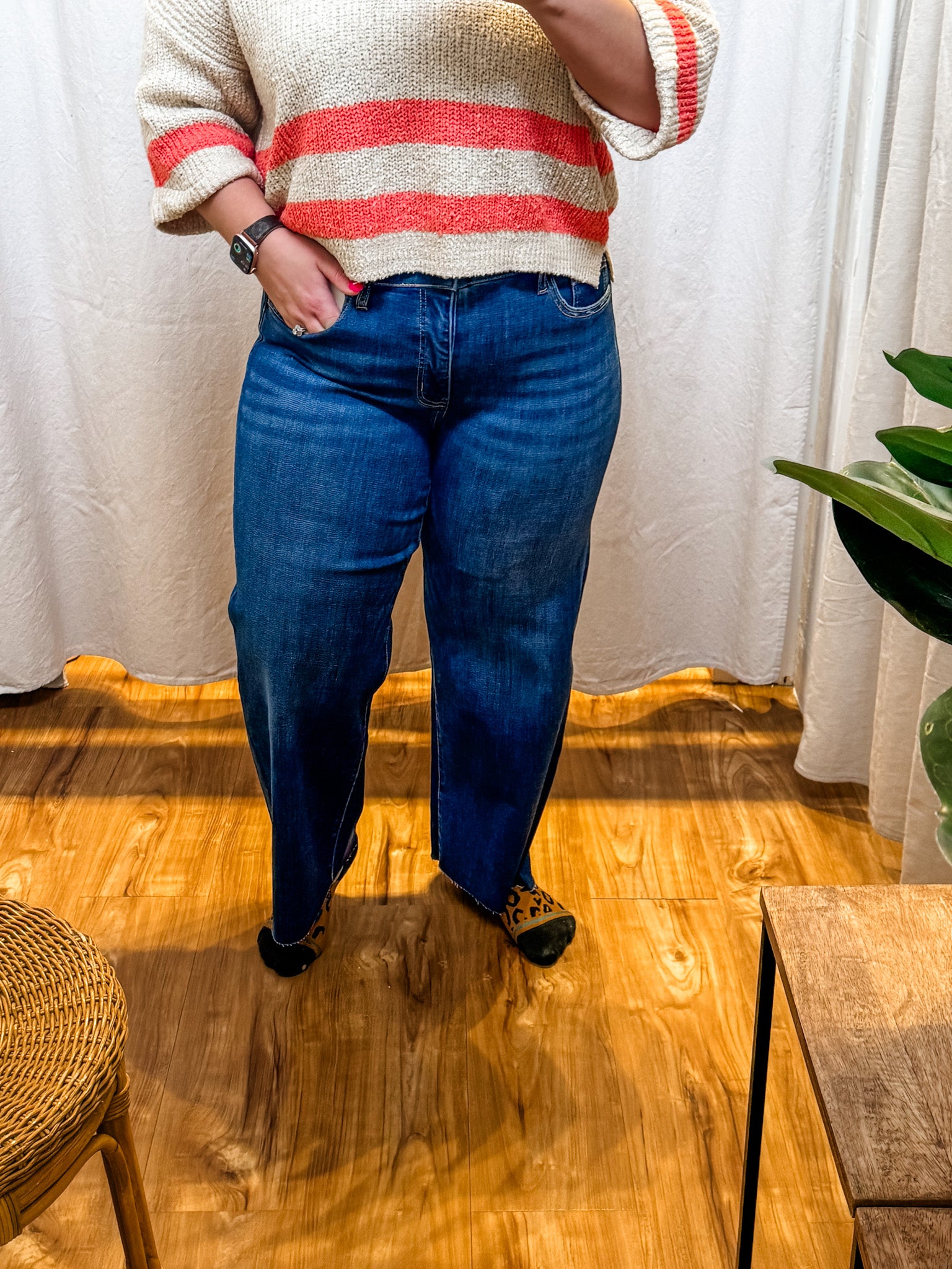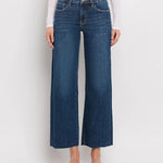 Comfort stretch denim, mid rise waist, 5 pockets, clean cut raw hem, cropped length, dark wash, wide leg jeans