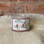 A jar candle from our Christmas Collection displaying a double-sided design of cardinals in a winter scene on frosted white glass. Design is replicated from original artwork hand painted in a delicate watercolor style. Seasonal candle features soy-based wax and 3 fabric wicks with 30 hours of burn time activating a Festive Spice scent. Our Winter Cardinal jar candle includes a dust cover and plastic lid for protection and polished appearance. A winter-themed home accent that is great for gifting.