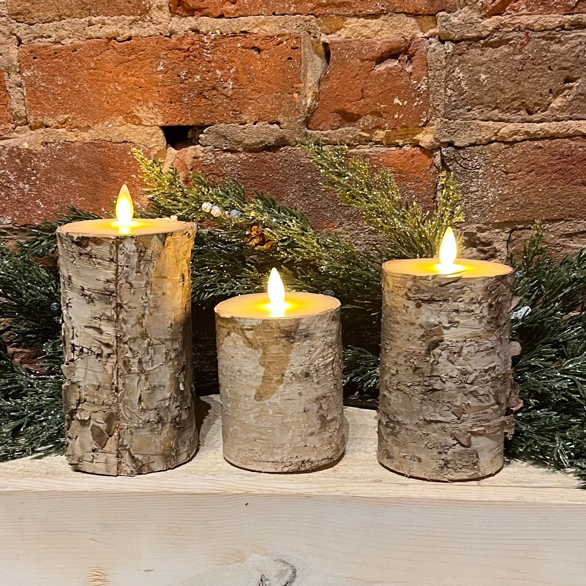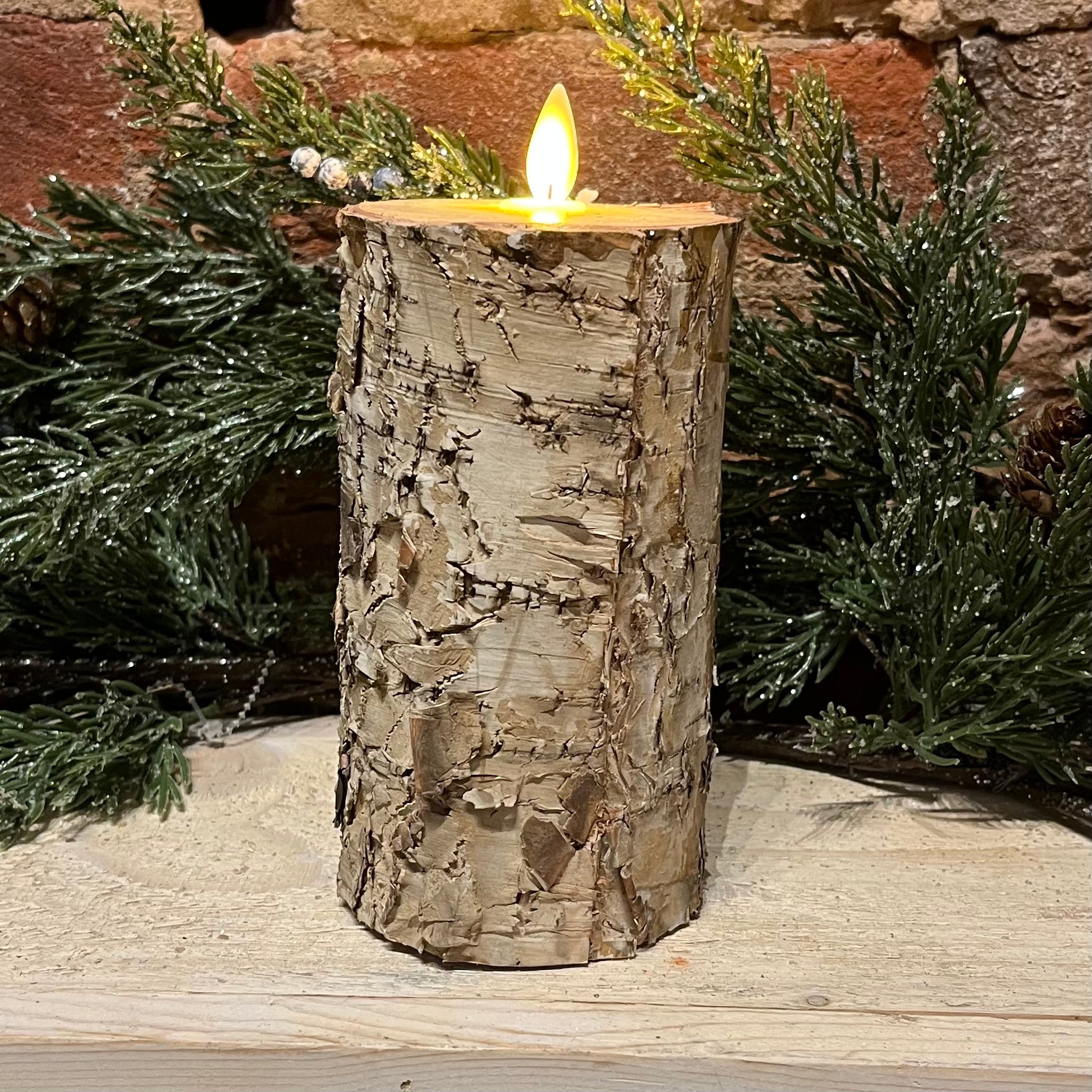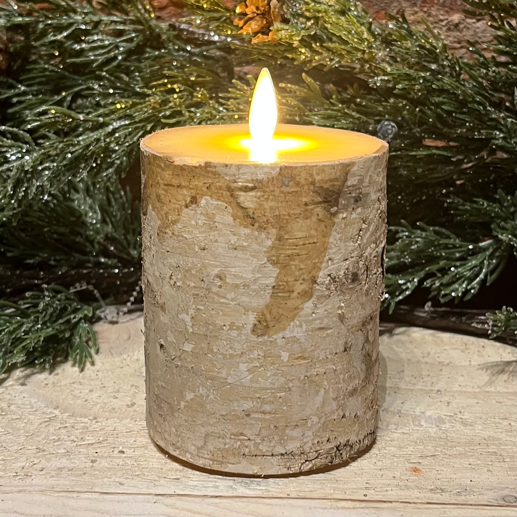 This Birch Pillar Candle is perfect for adding a warm, cozy ambience to any home. Its design features a natural birch finish that adds a unique detail to any room, making it a great decorative piece. Enjoy the classic beauty of birch without worrying about a mess thanks to the no-drip pillar candle design. 4 hour timer on candle.