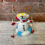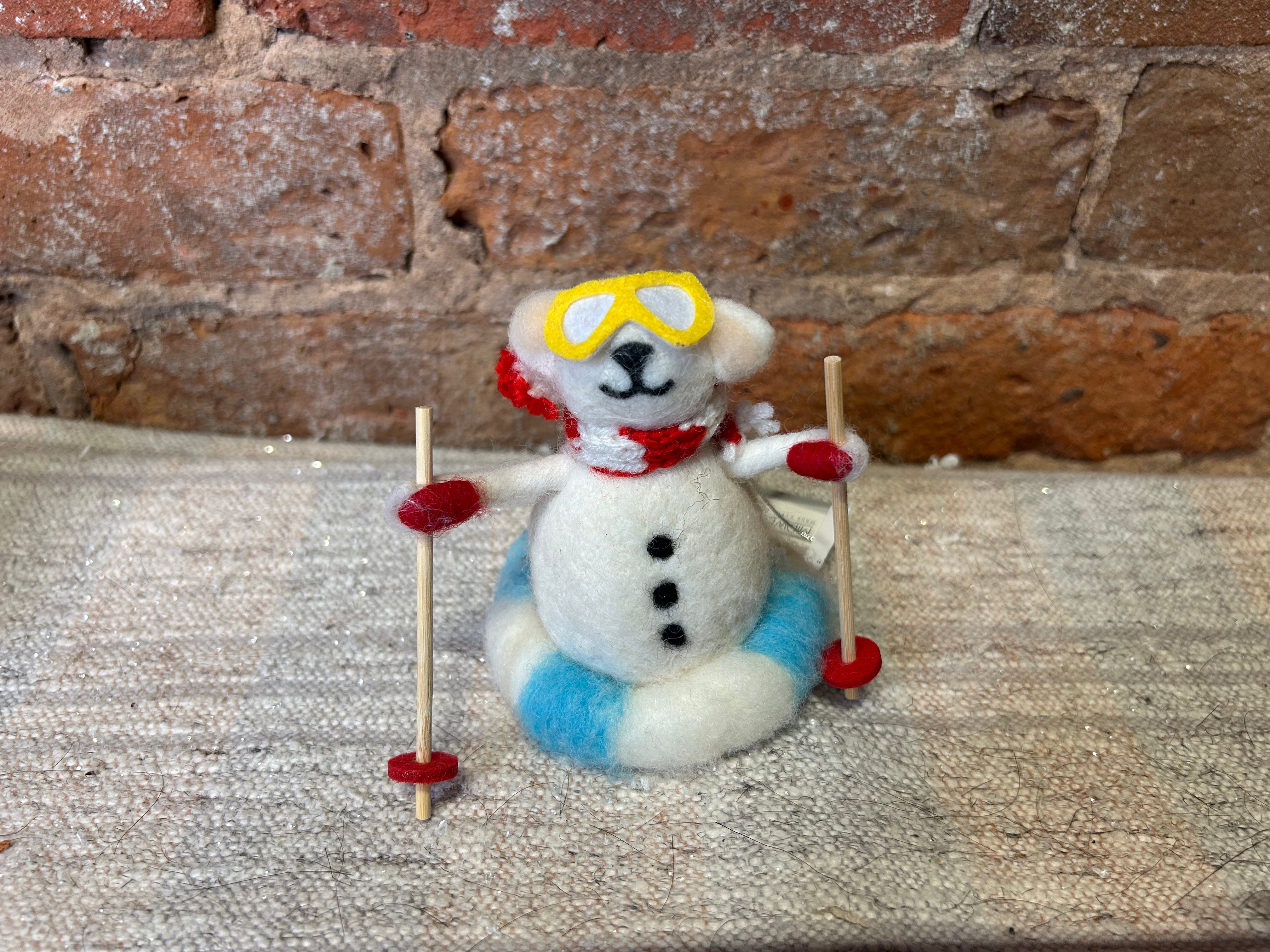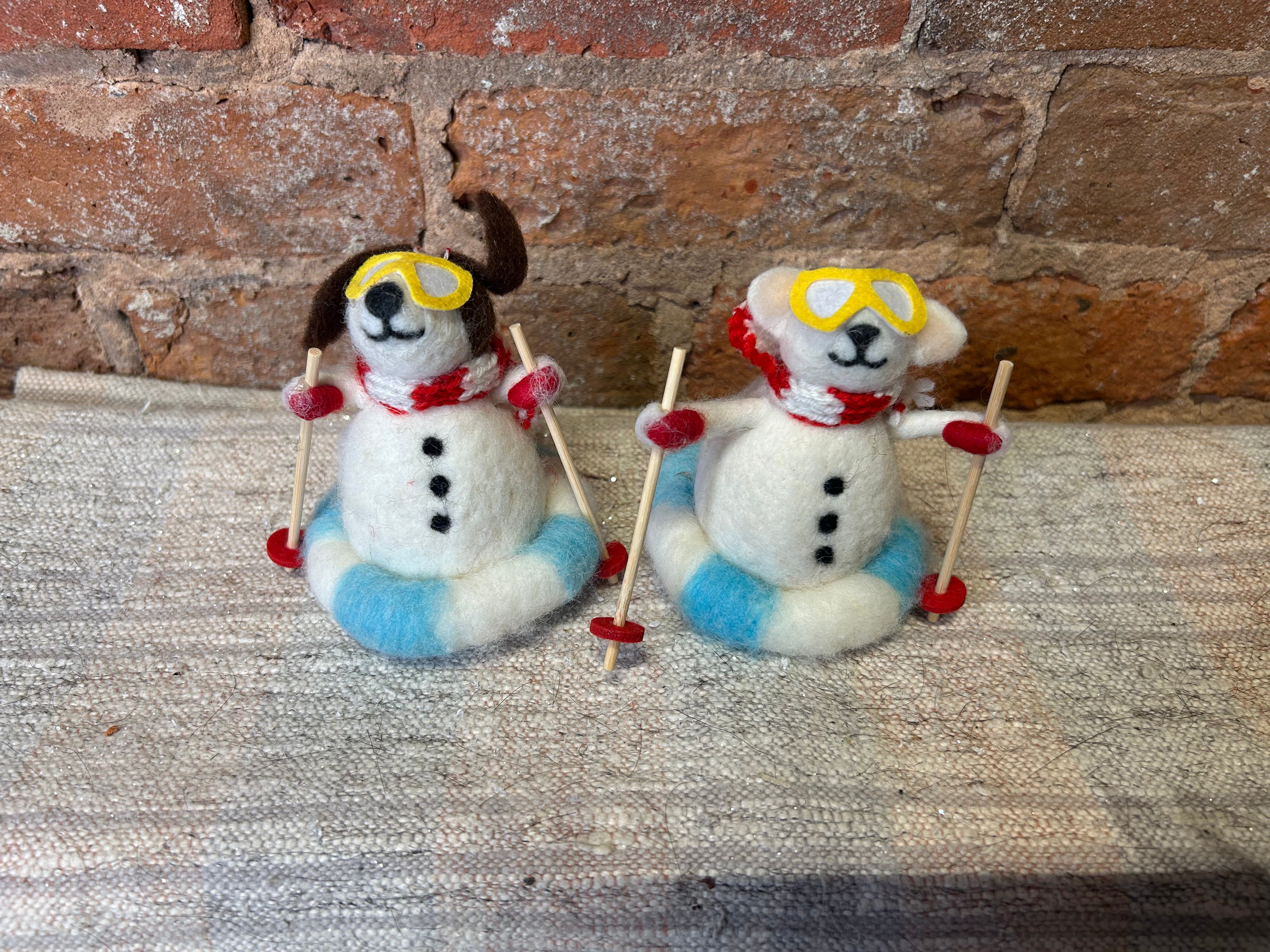 Add a whimsical touch to your space with this 4” felt animal tubing ornament. Featuring a charming felt cat and dog wrapped around a blue and white tubing ring, it’s accented with wooden skis and bright yellow goggles for a playful, adventurous vibe. Perfect for animal lovers and those who enjoy quirky décor that sparks joy and imagination.