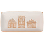 A durable stoneware platter displaying a cream color glaze with debossed gingerbread house designs in brown color on the inside and a bare ceramic accent on the rim. Our rectangular Gingerbread House platter is conveniently microwave, dishwasher, and food safe for easy use. A fun piece of gingerbread-themed tableware perfect for seasonal gatherings.