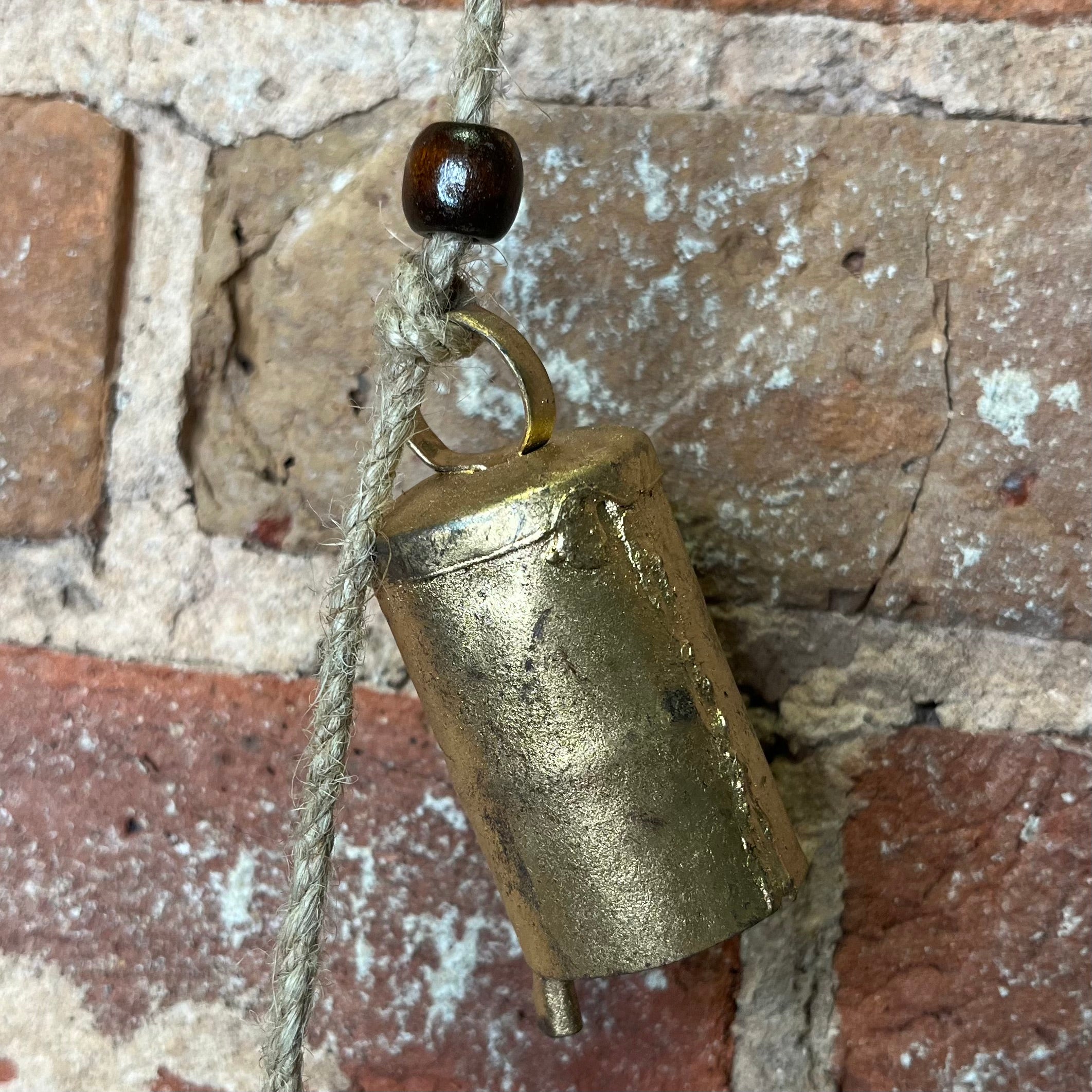 Hanging Antique Brass Metal Cylinder Bells w/ Wood Beads on Jute 28”