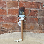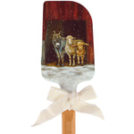 A double-sided silicone spatula features farm animals inside a barn on a snowy day. Design is replicated from original artwork painted onto burlap canvas, giving the art a unique depth and texture. Our Farm Family spatula features a logo engraved into wooden handle for added interest and a decorative bow and ribbon for hanging. Hand-wash recommended; not microwave safe.