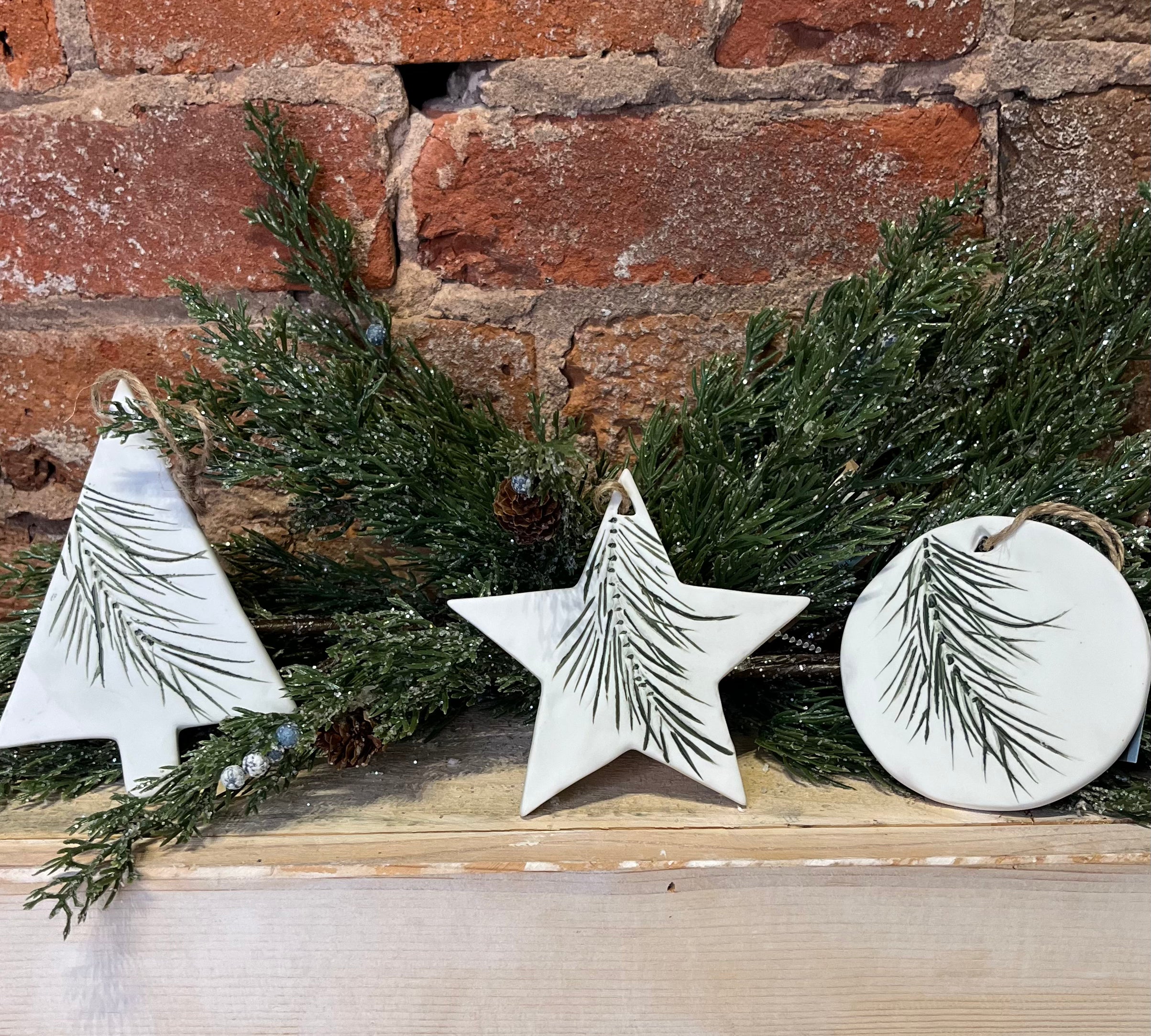 White Ceramic w/Stamped Green Pine Icon Orn 4"
