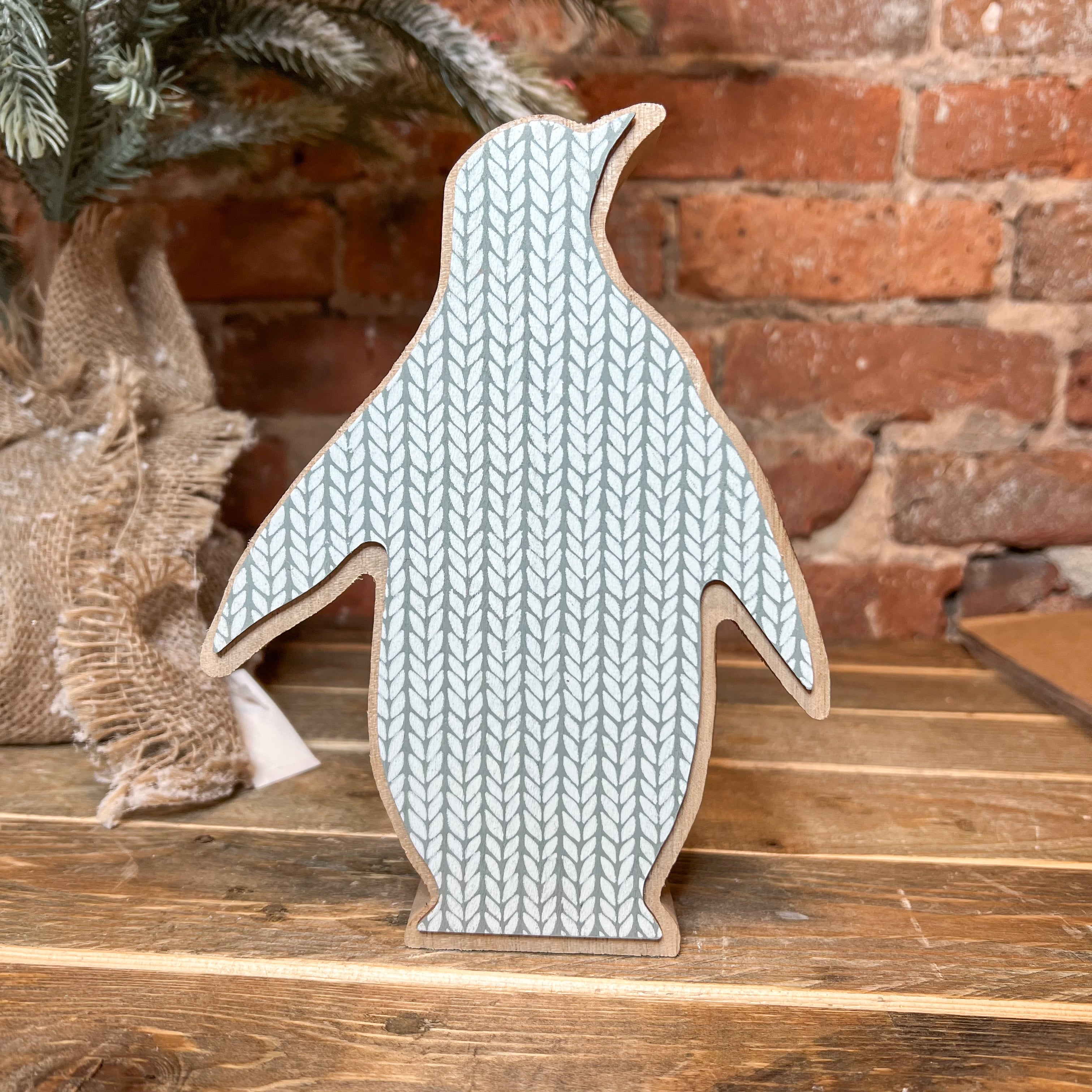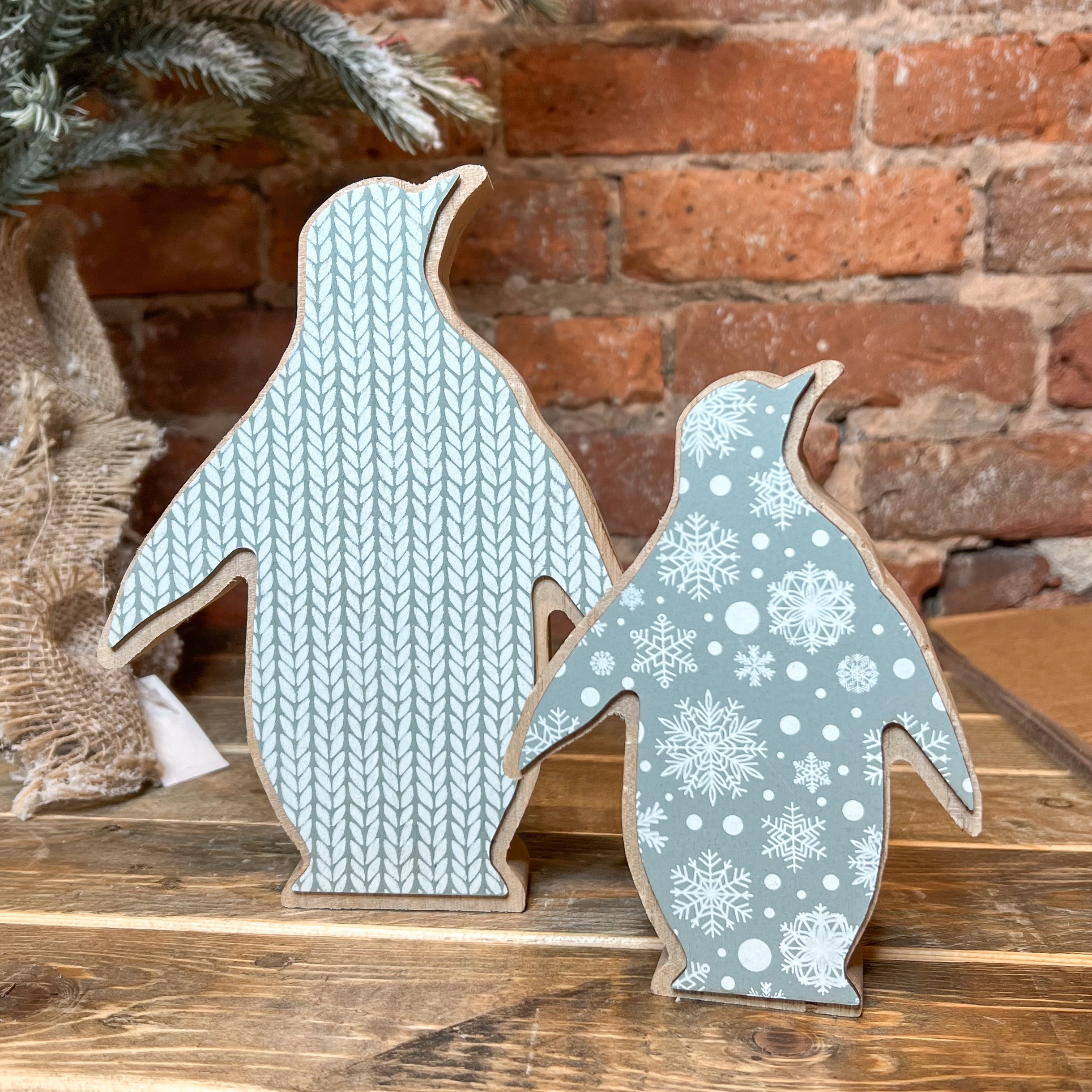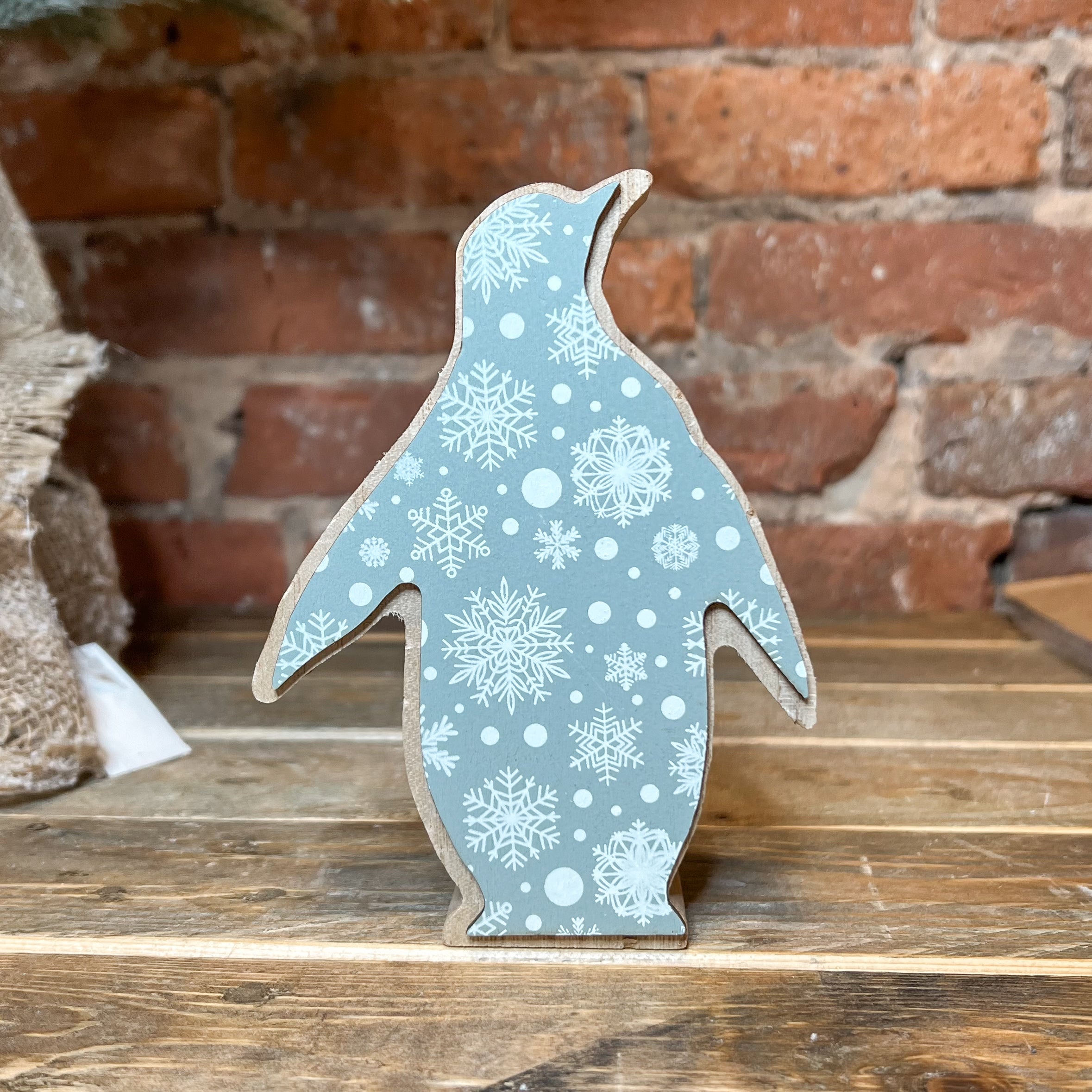 Introducing the Light Blue Faced Wooden Penguin! Crafted from light-colored wood with a charming snowflake and botanical pattern, these penguins are colored pastel blue hues. Perfect for adding a touch of Christmas to any space.