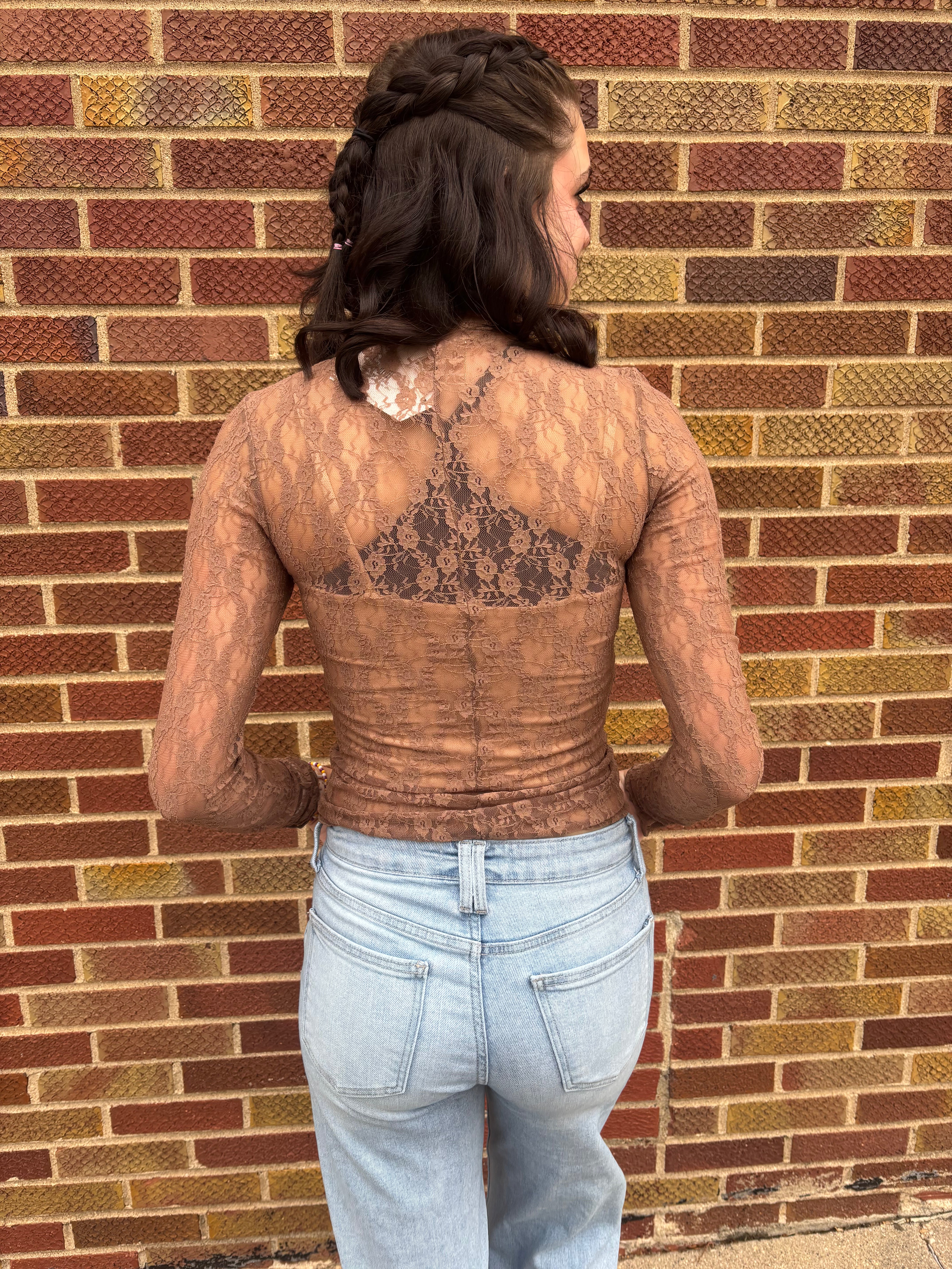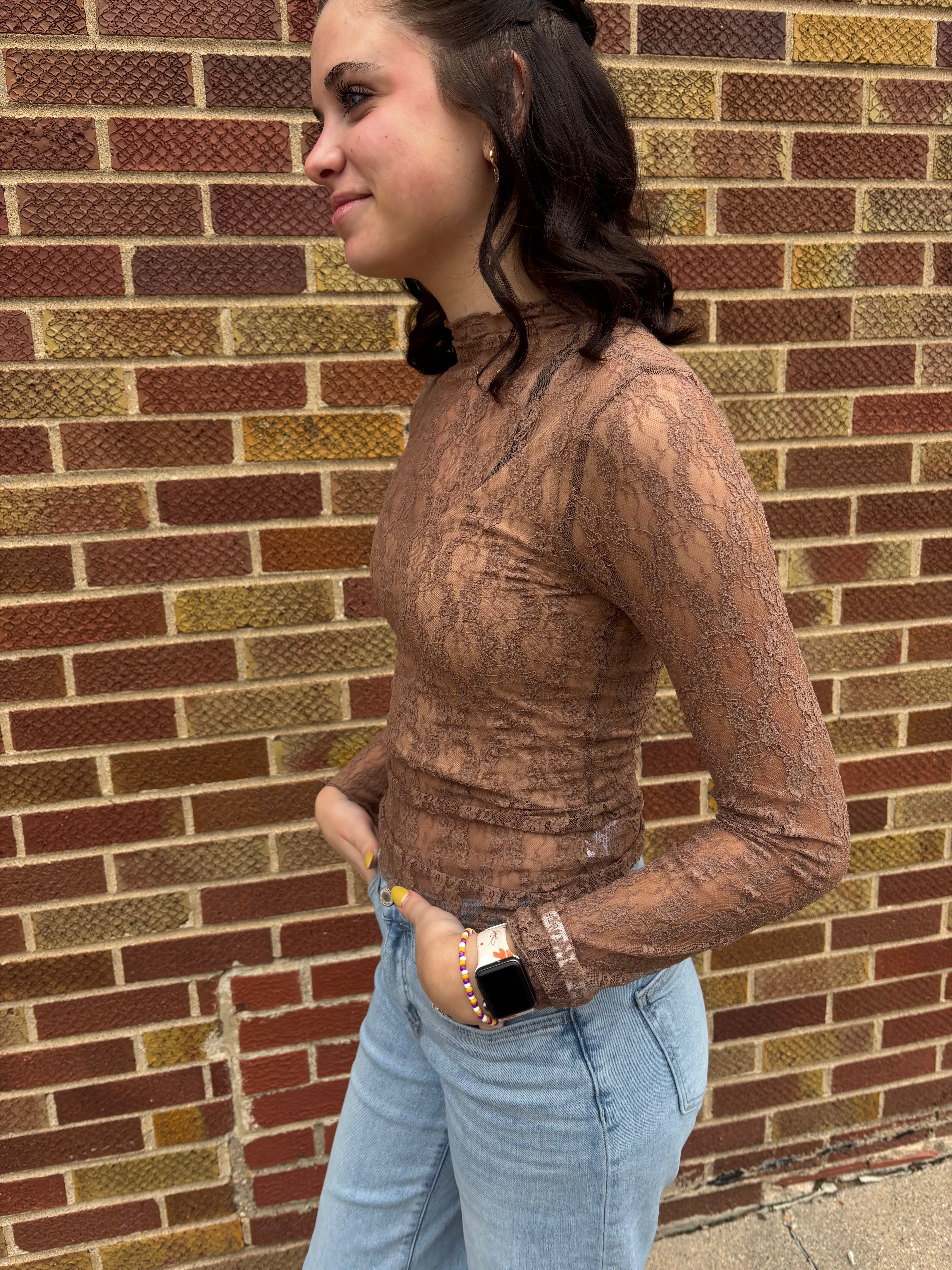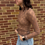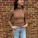 High Neck Fitted Sheer Mesh Lace Knit Top- Solid, Floral, Bow, Stripe & Leopard Printed- Long Sleeve