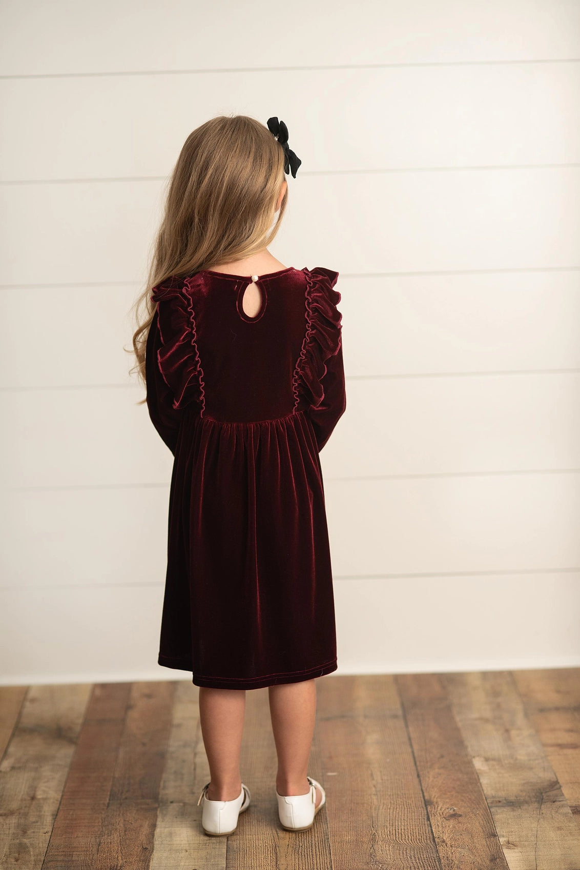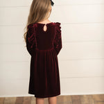 Girls wine burgundy long sleeve velvet dress with ruffle and Bow front details. Has dainty keyhole pearl button closure in back. A perfect classic dress for Christmas, New Years, and Winter Holiday parties! 95% Polyester 5% Spandex