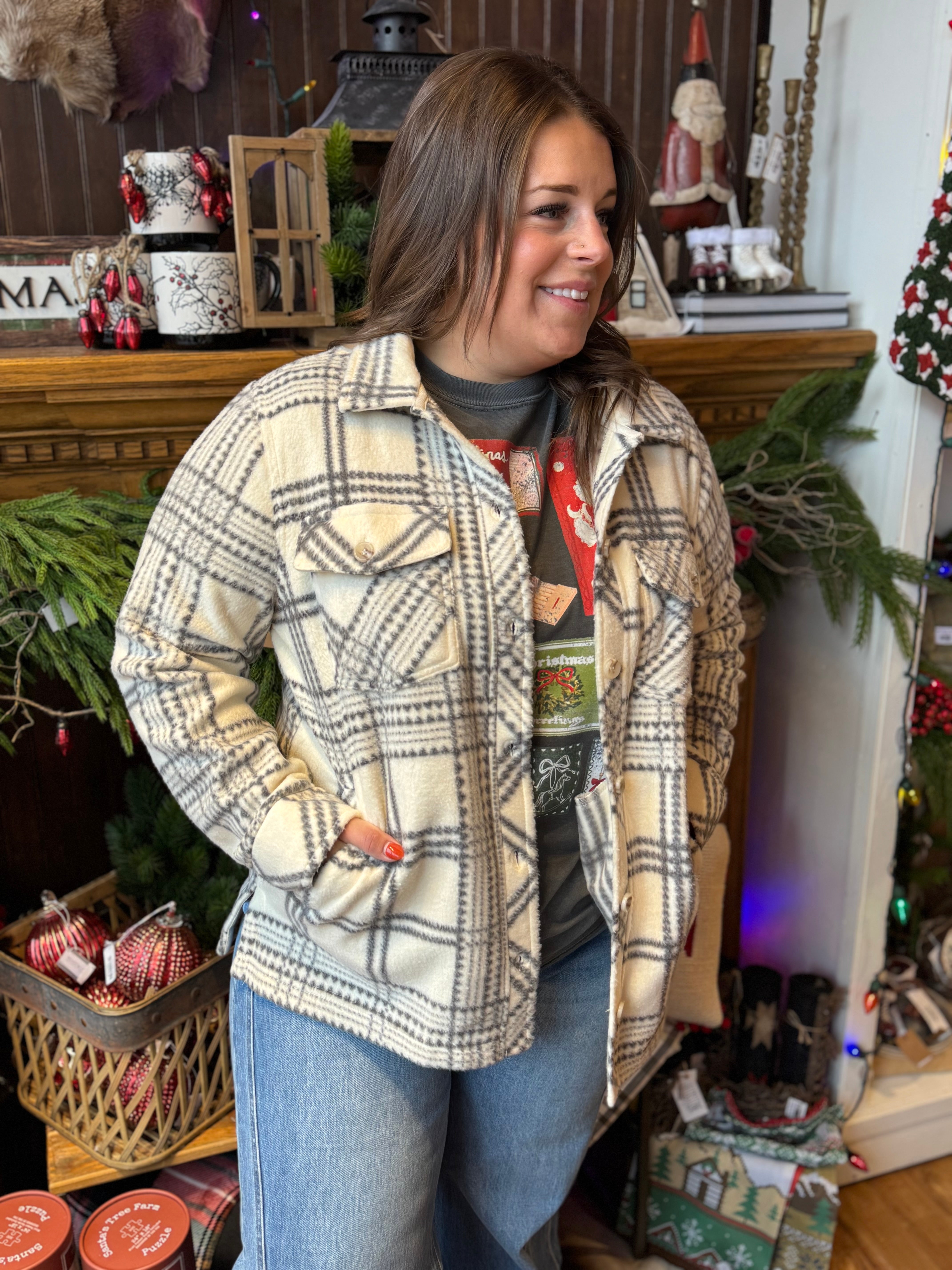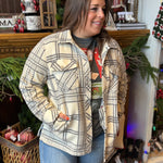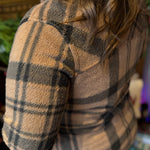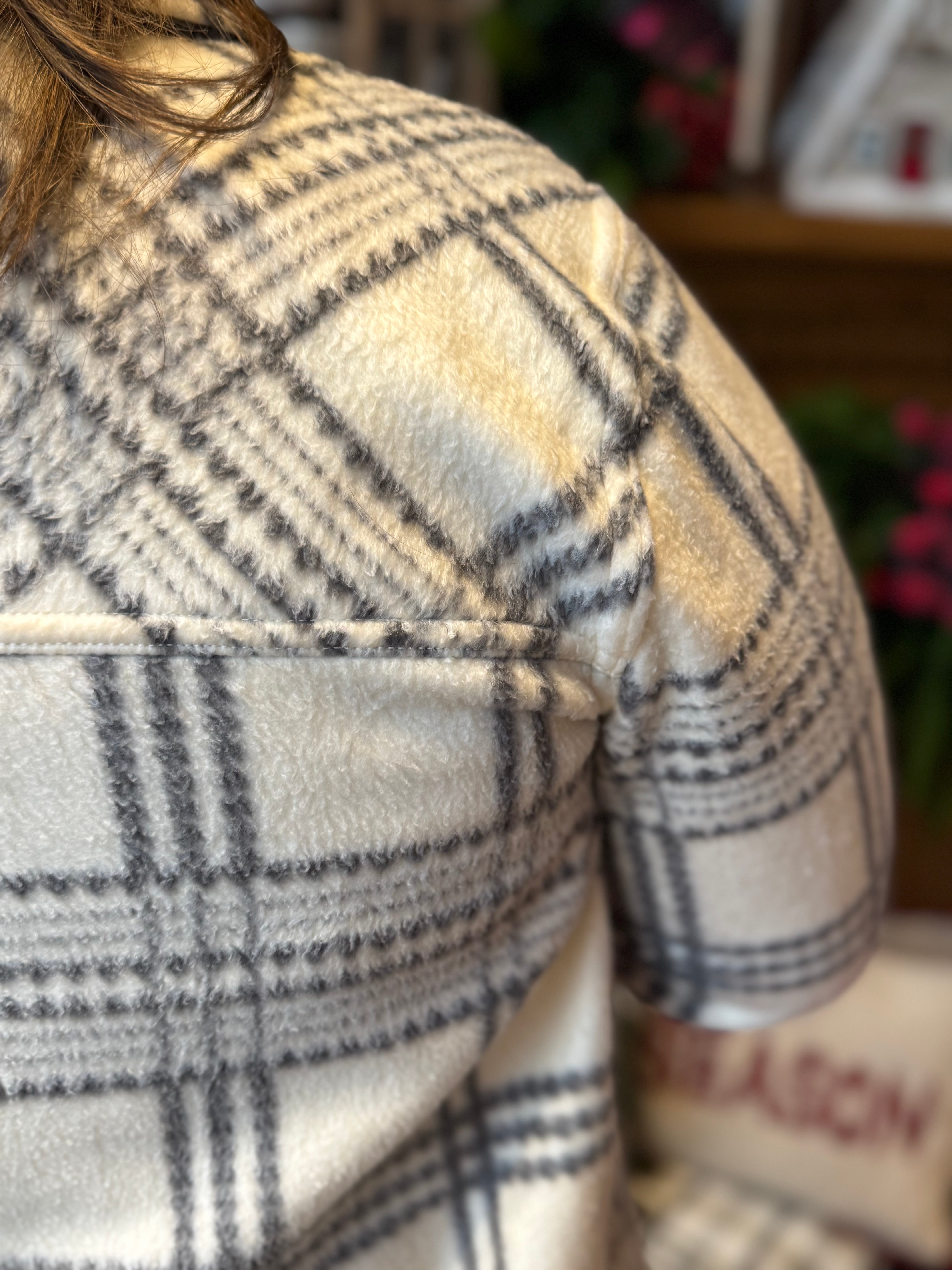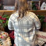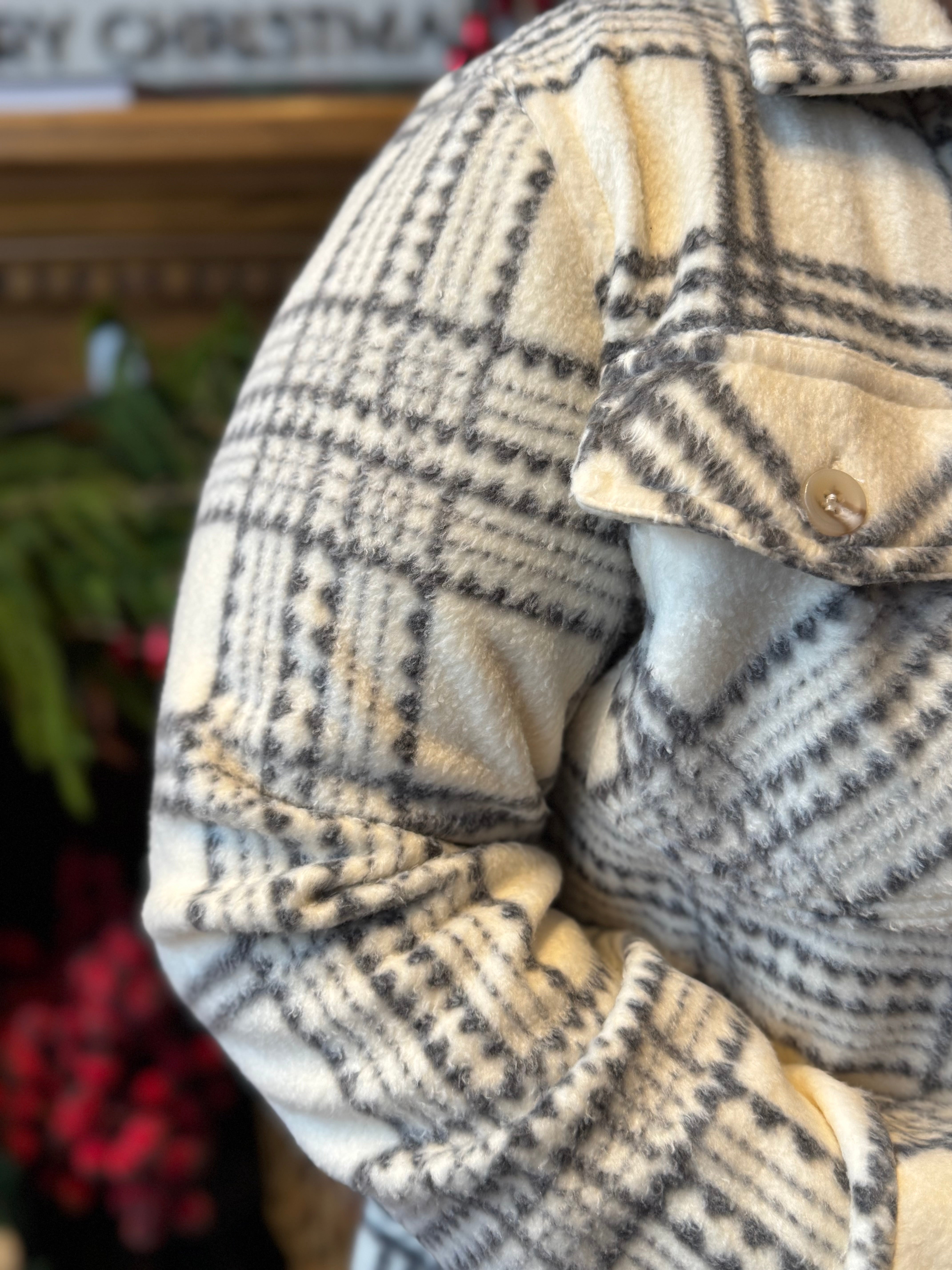 The Santa Fe Jacket combines a classic collar and long sleeves with a button-down front for a structured, refined look. Featuring convenient side pockets, it offers both style and practicality. Available in cream with charcoal plaid or pecan with black plaid, this jacket brings a sophisticated touch to your layering options.