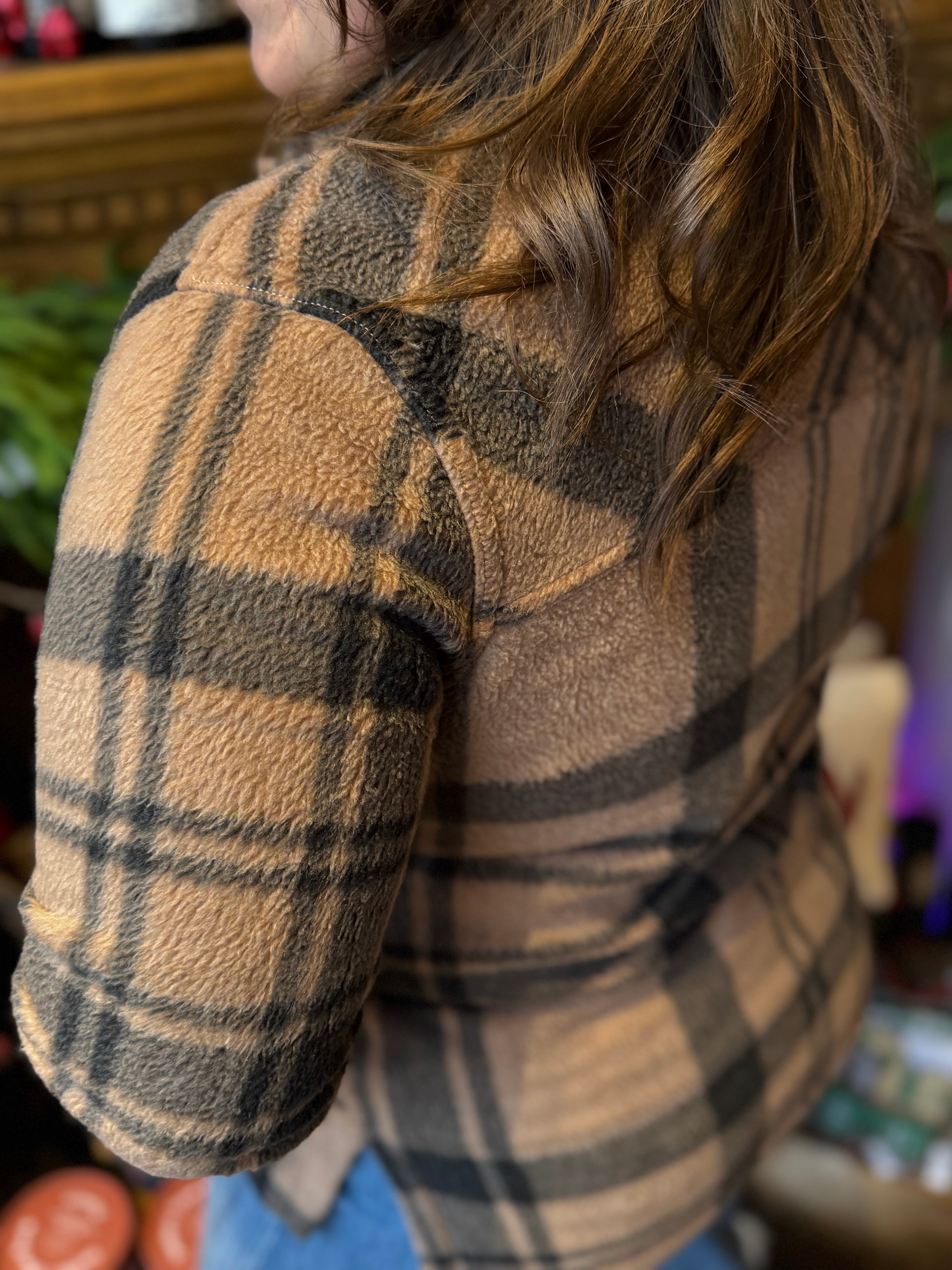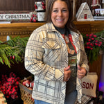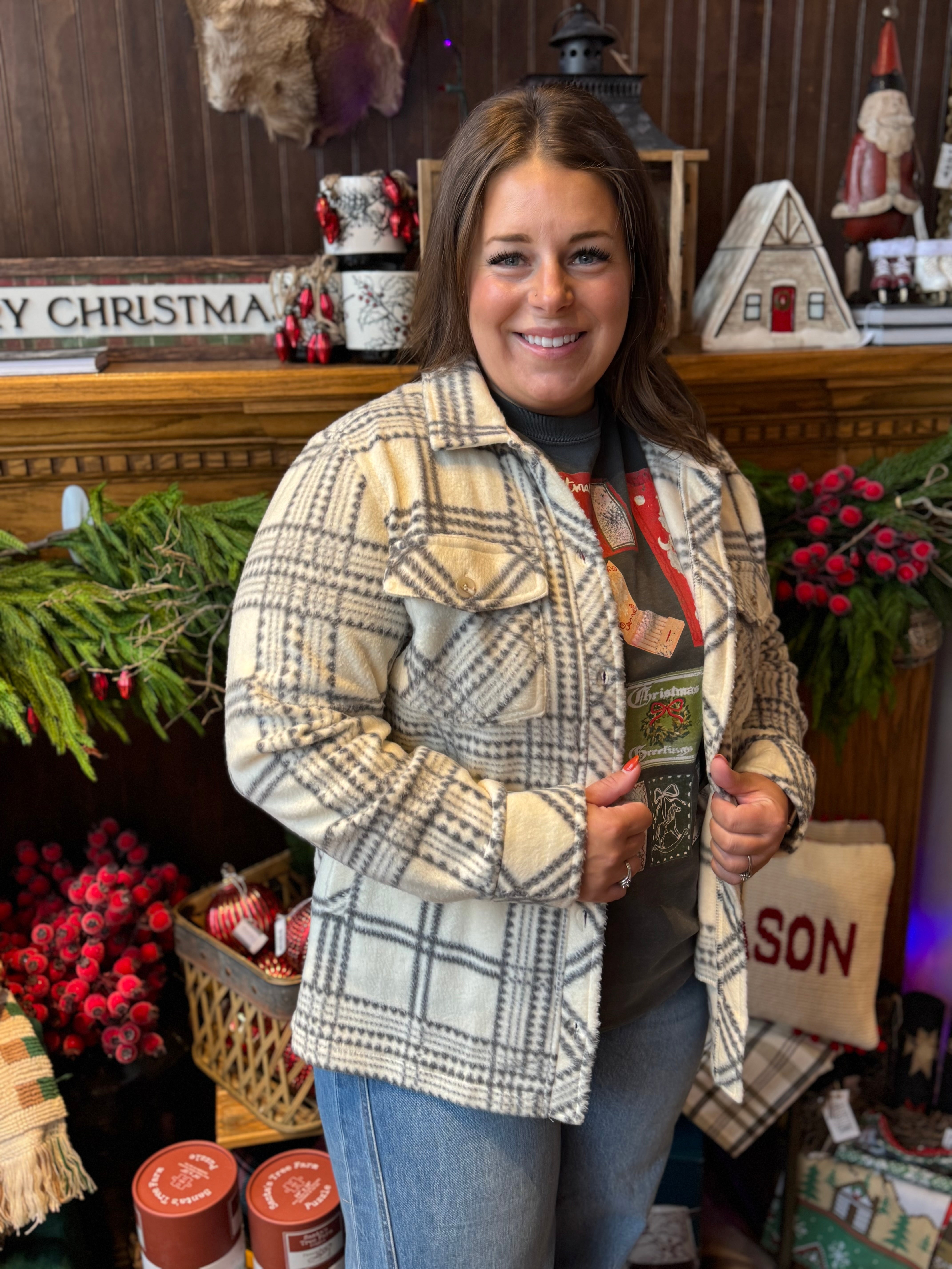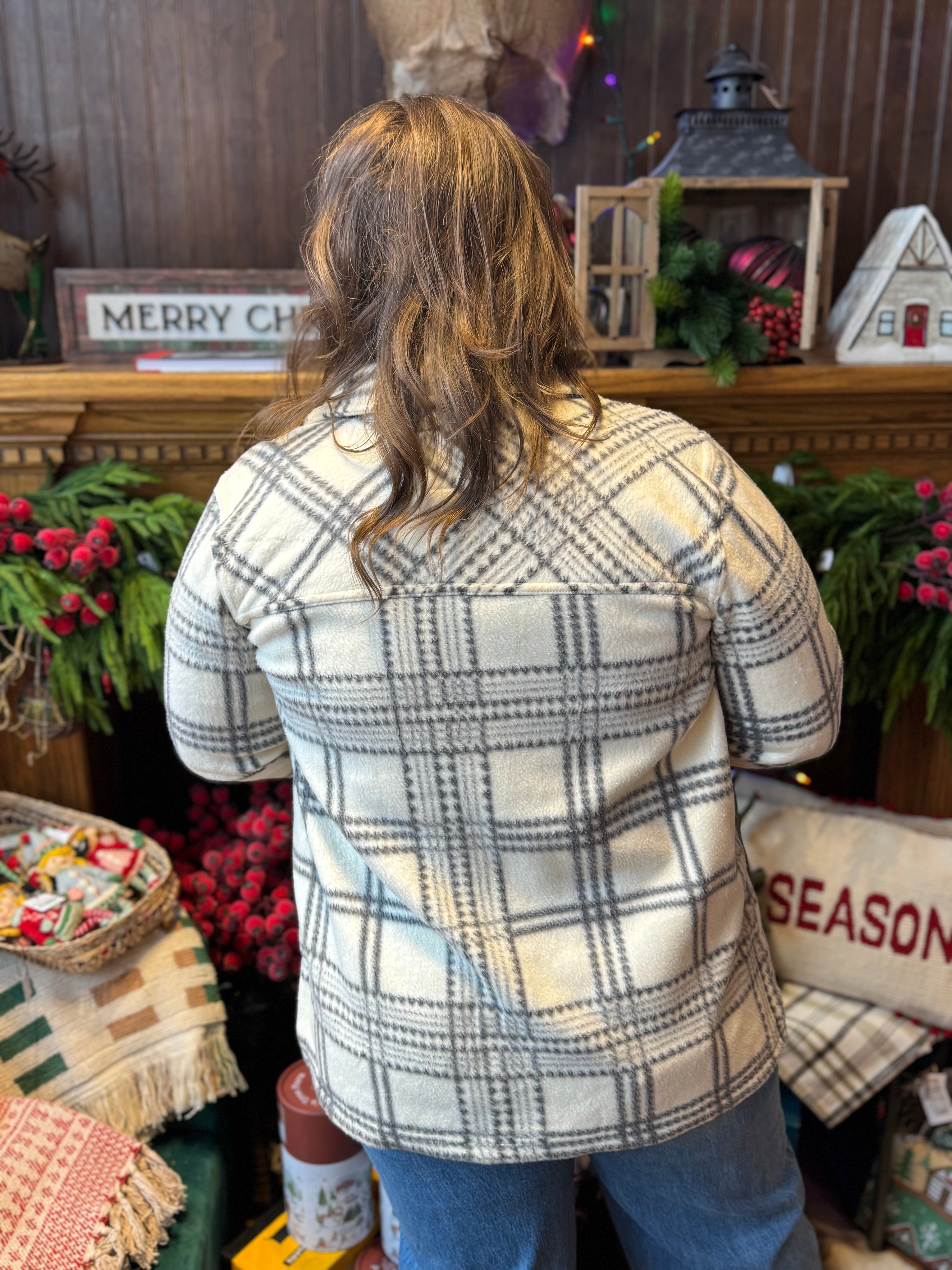 The Santa Fe Jacket combines a classic collar and long sleeves with a button-down front for a structured, refined look. Featuring convenient side pockets, it offers both style and practicality. Available in cream with charcoal plaid or pecan with black plaid, this jacket brings a sophisticated touch to your layering options.