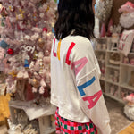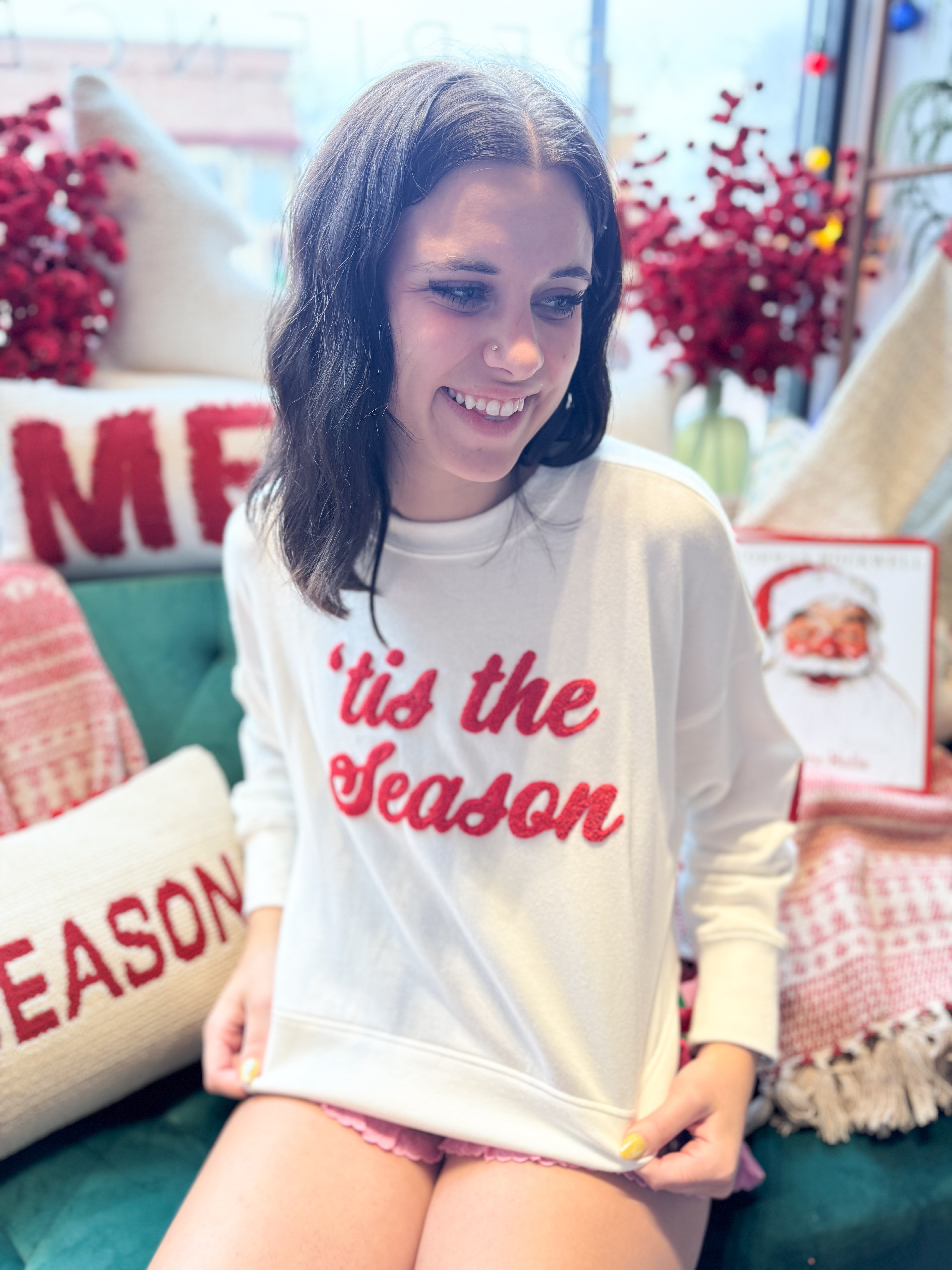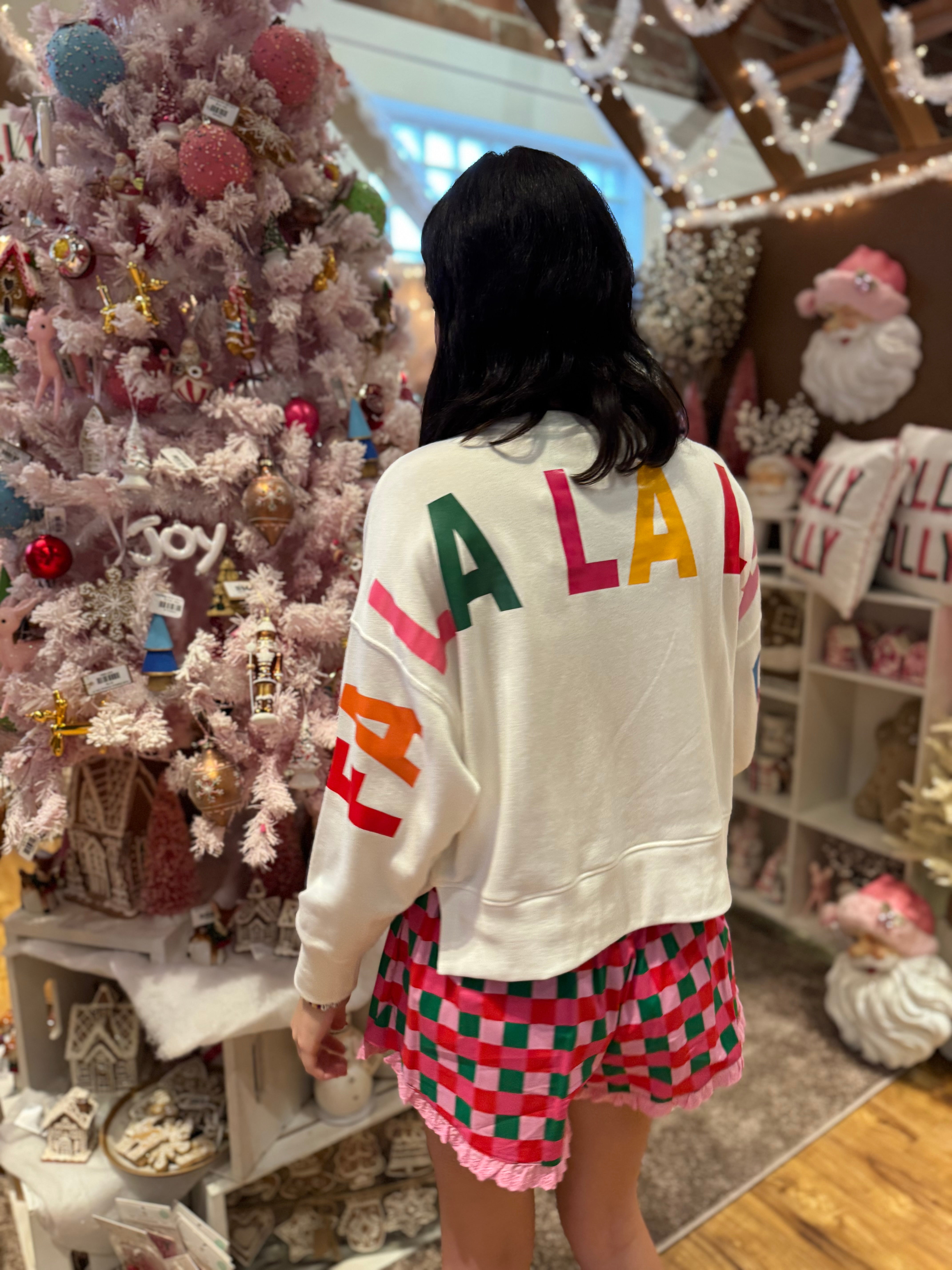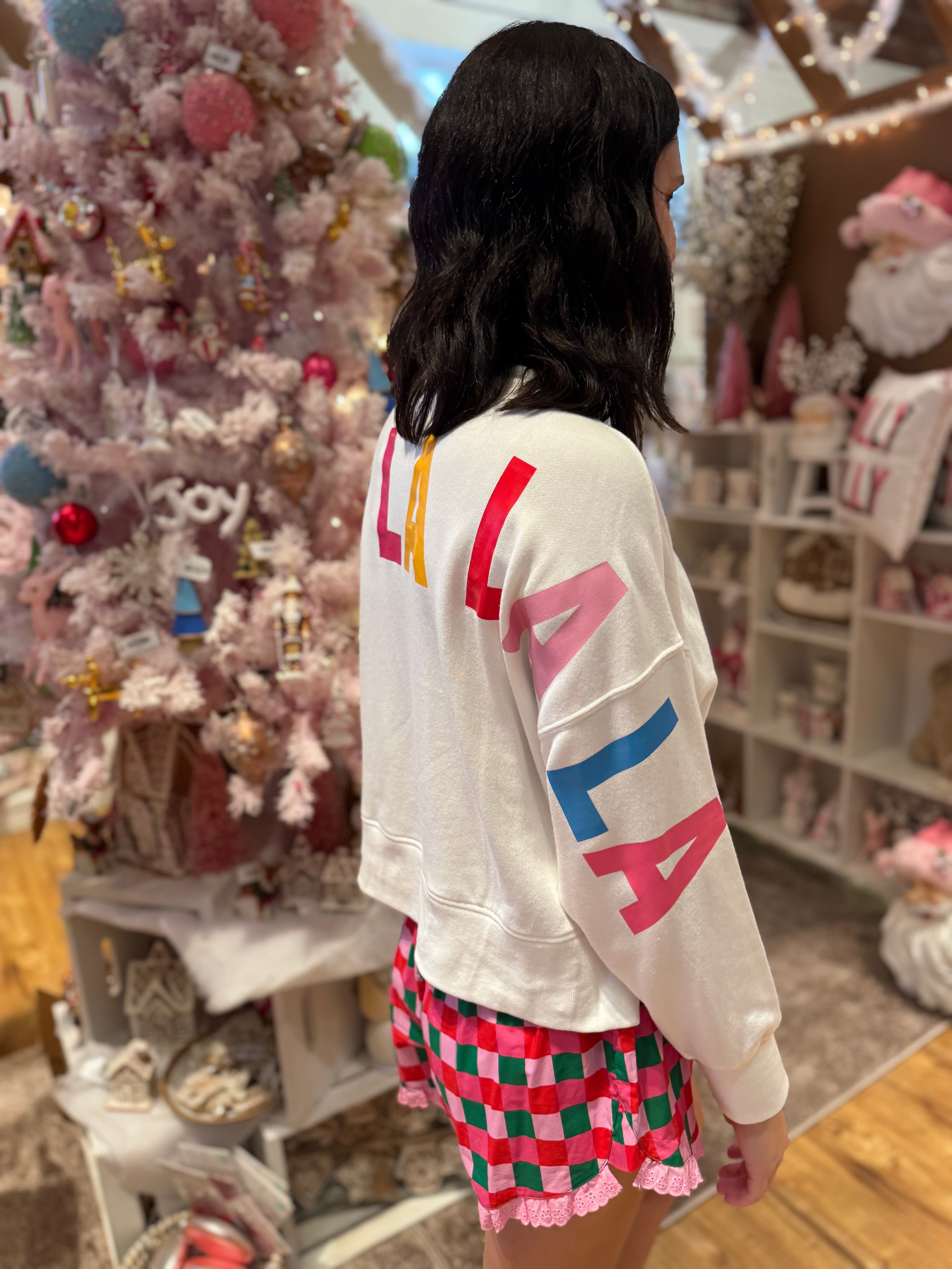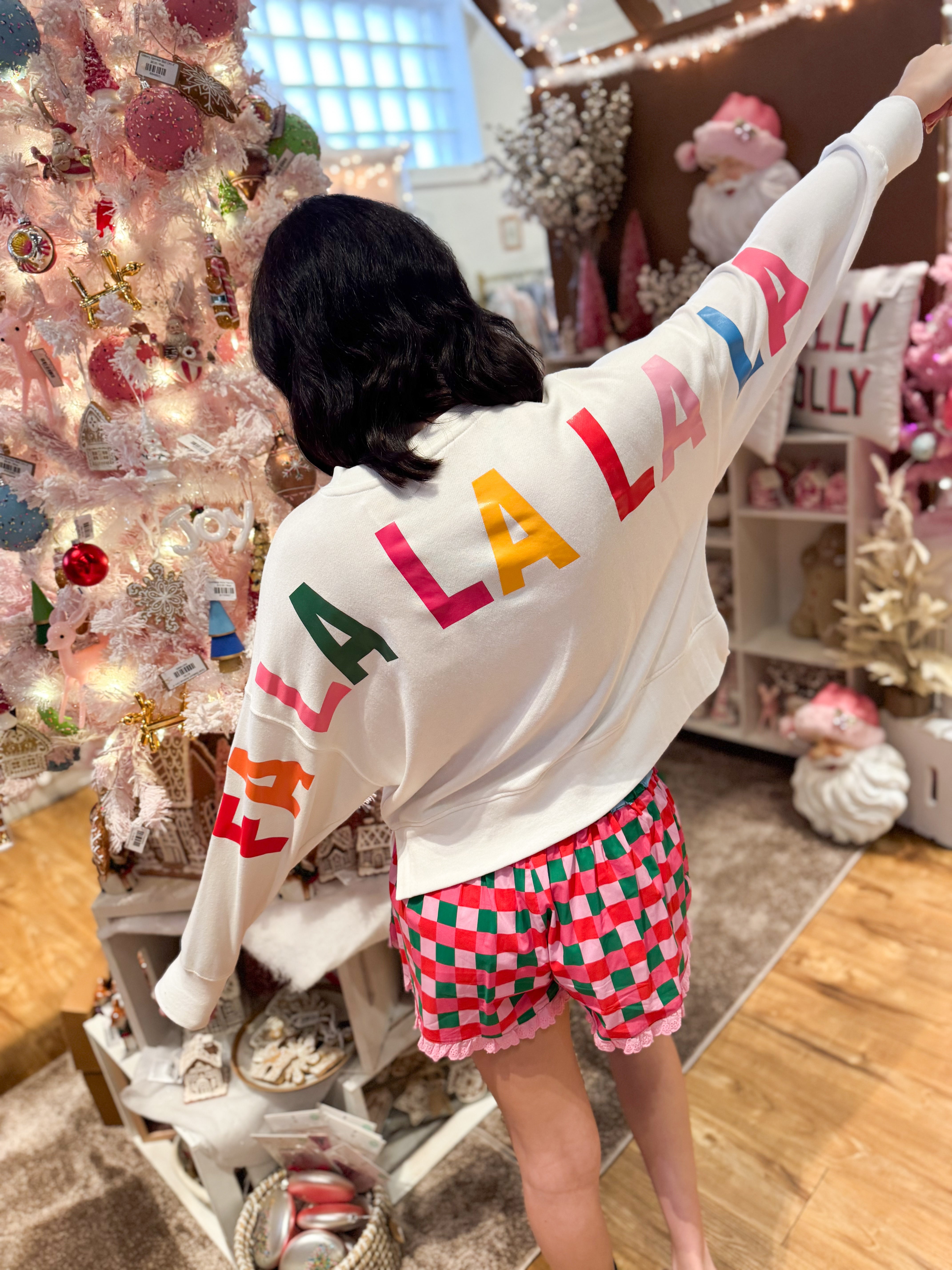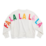 Get in the holiday spirit with the "’Tis the Season/Fa La La" Relaxed Sweatshirt! This ivory pullover features cheerful red chenille lettering across the front and a festive rainbow “Fa La La” print design wrapping around the sleeves and back. With its drop shoulders and slightly oversized fit, this sweatshirt is made for cozy nights in, cookie baking, or spontaneous dance parties by the tree.