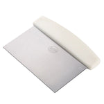 Designed to simplify food preparation, this stainless steel dough cutter / bench scraper is a must-have tool in any kitchen! Not only can it slice through dough to portion rolls or pizza bases, but it helps scrape up leftover dough at the end of prep. White polypropylene handle provides a comfortable, sturdy grip. 6" x 3" blade
