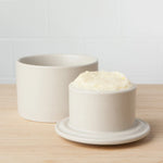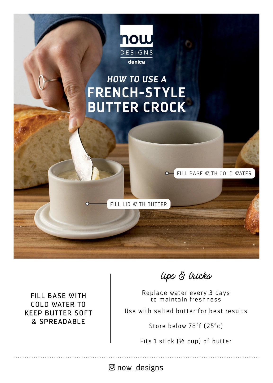 Swap out your butter dish for this contemporary yet classic French country crock, and you'll always have spreadable butter at the ready. Made from thick stoneware, the butter crock uses a tried-and-true storage method dating back to the 1800s to keep butter fresh and soft. Simply fill the base with cold water, add 1/2 to 1 stick of butter to the crock, and top with the lid to preserve freshness with an airtight seal. Replace the water every three days and store your butter crock below 25 degrees Celsius/78 degrees Fahrenheit for perfect butter every time. • size: dia4 x h3in, 1 stick or 1/2 cup of butter • material content: stoneware • care instructions: dishwasher safe