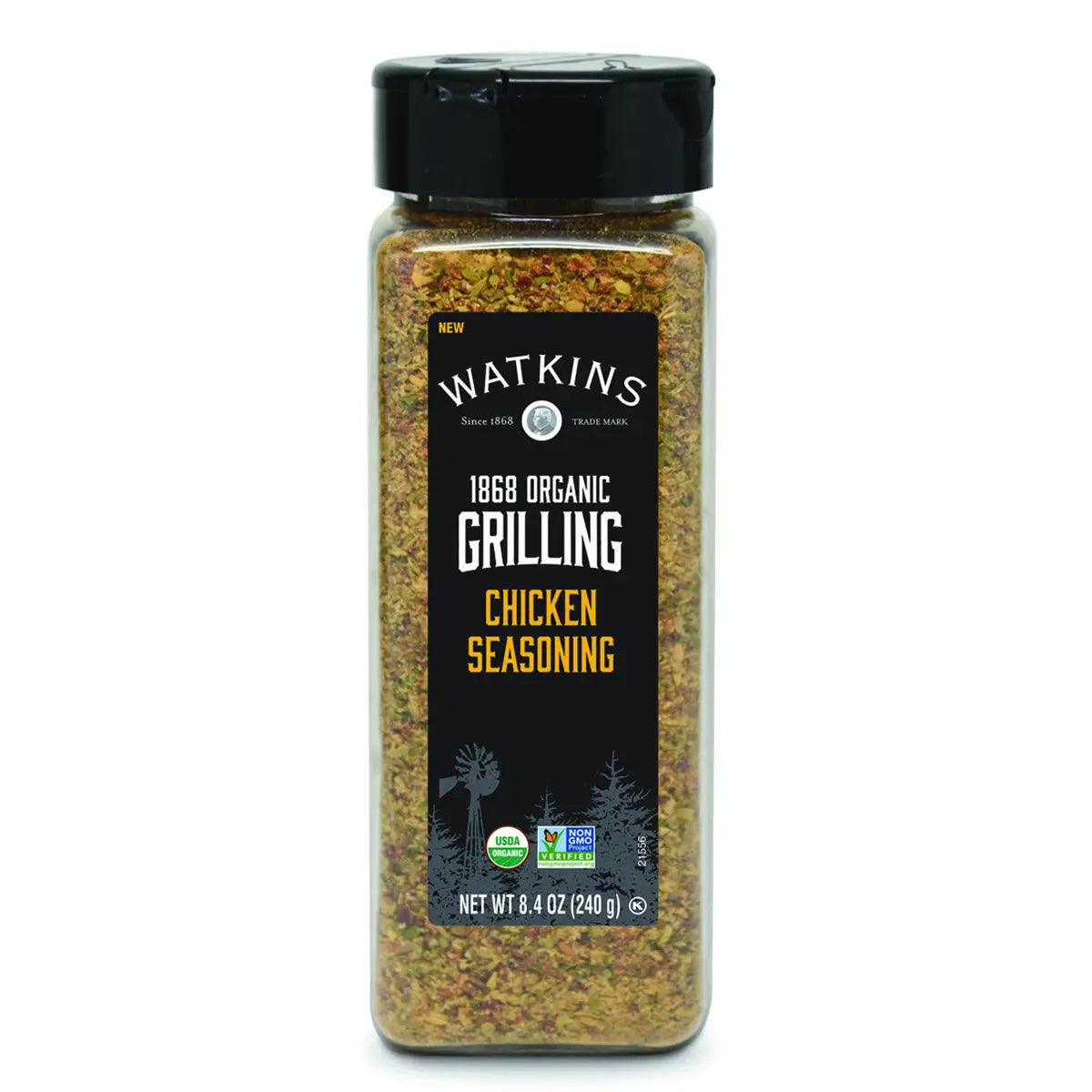 a NEW larger family size. The bold flavors of the Northwoods of Minnesota run as deep as the Great Lakes themselves. The Watkins Co. brings the authentic seasonings of the true north to your kitchen or grill, just as we have for more than 150 years. Savory salt, onion, garlic, pepper, lemon and more bring out the best of grilled chicken in this Organic Chicken Grilling Seasoning.