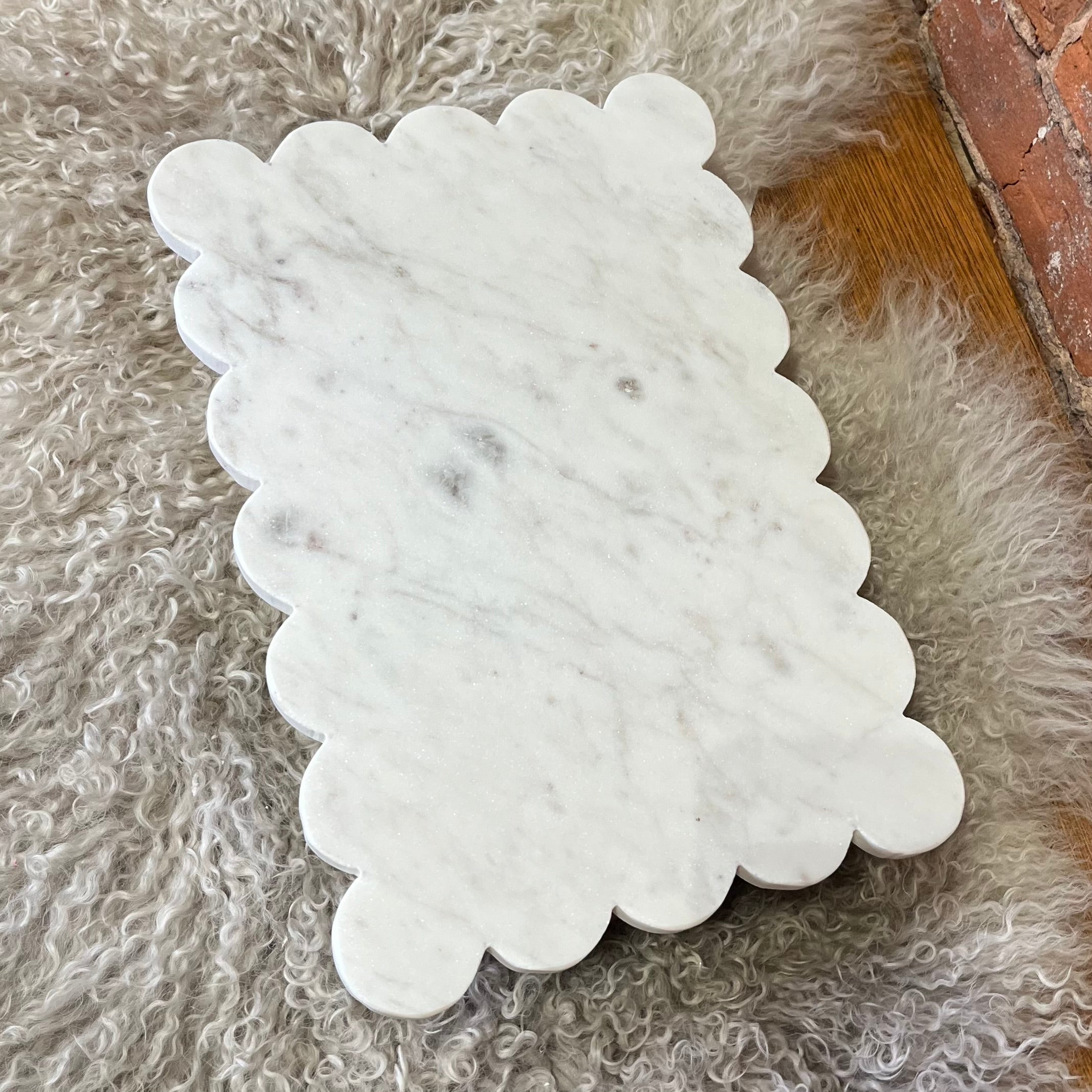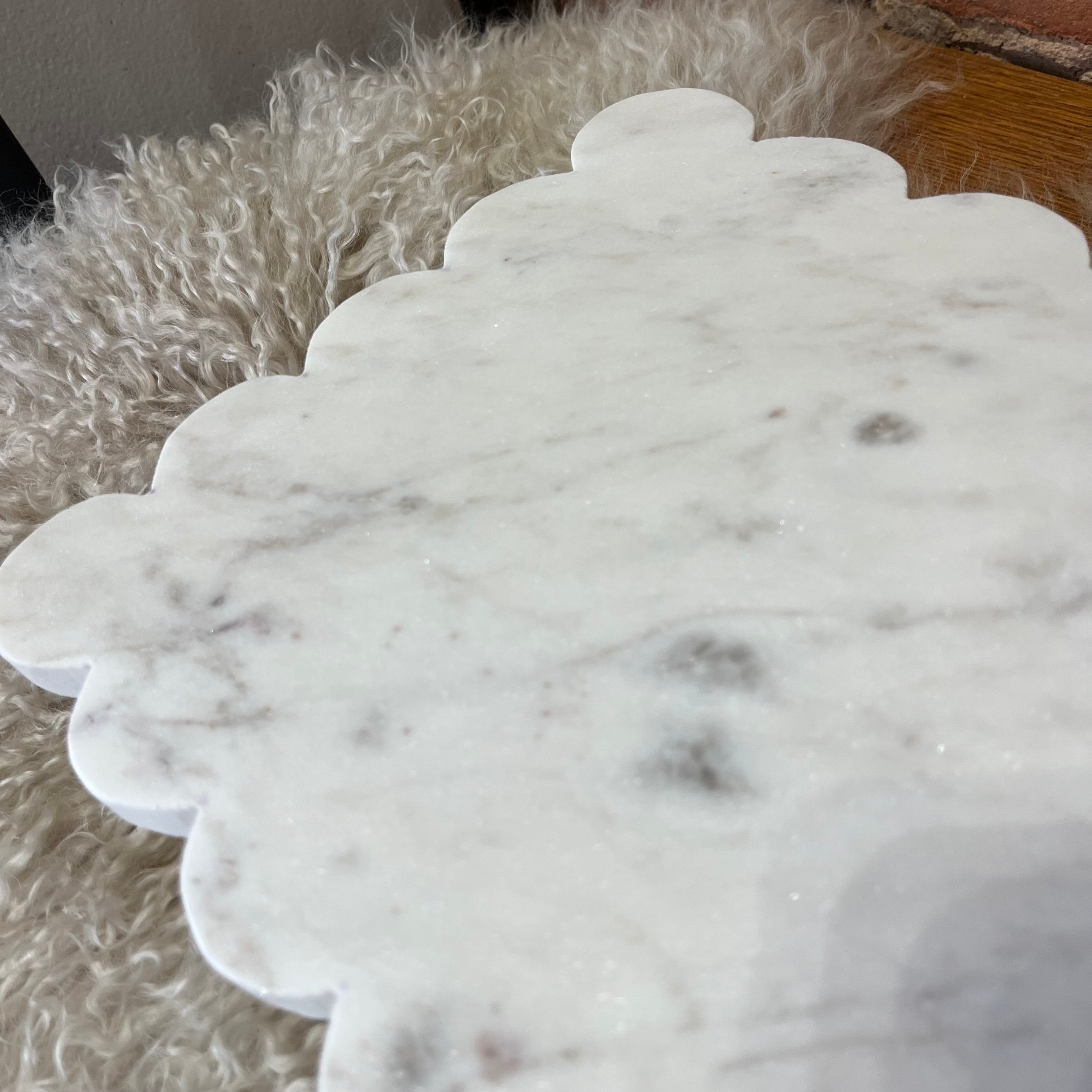 A beautiful statement piece for serving charcuterie, this white marble board features a hand-polished and finished surface and an elegant scalloped edge. Hand wash recommended.