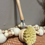 Swap plastic dish brushes in the kitchen with our 100% biodegradable beechwood and sisal fiber dish brush. The head is removable and replaceable. Our kitchen brush has a beechwood handle with sisal fiber (agave plant) bristles. Minimally fastened together with a metal wire & metal loop to hang to dry.