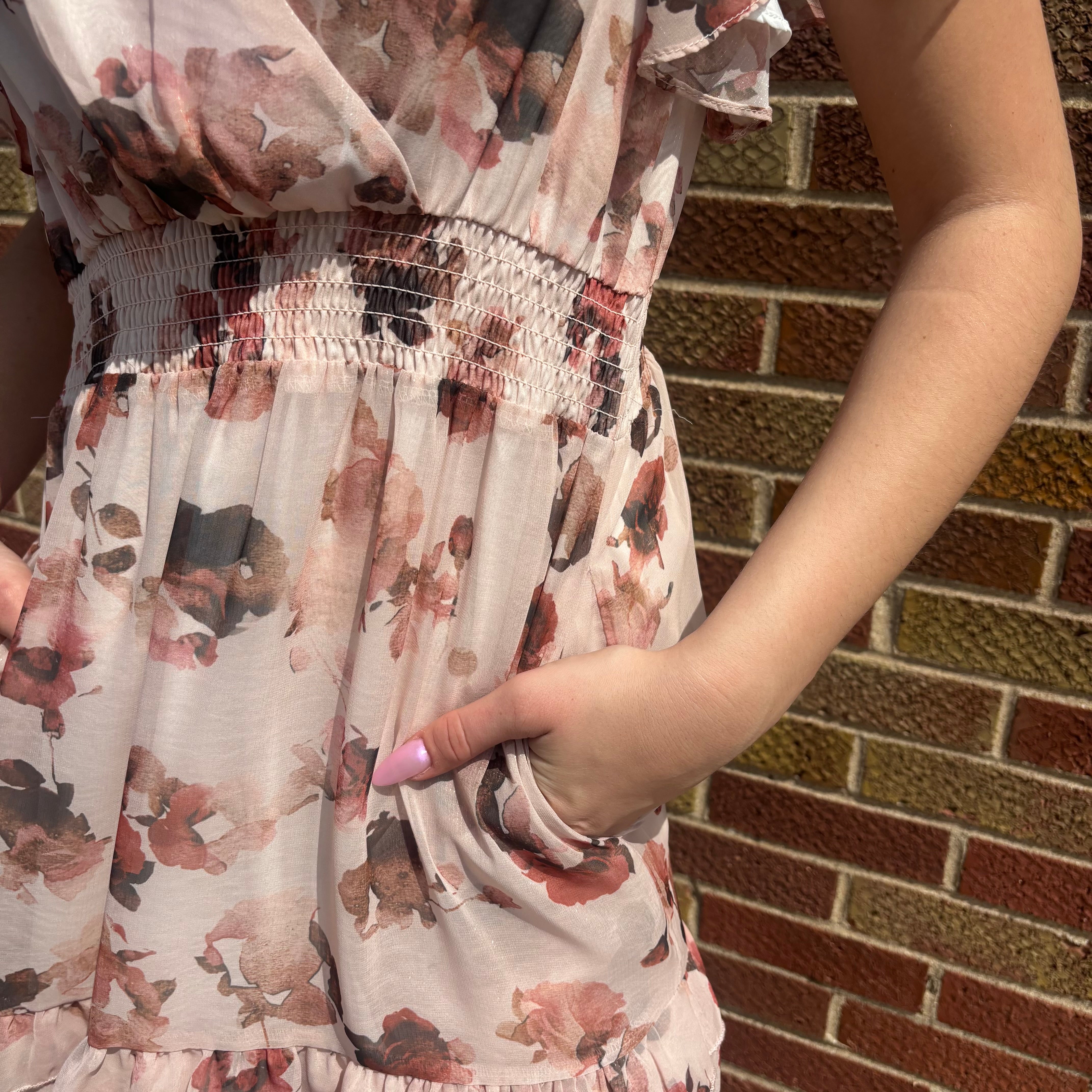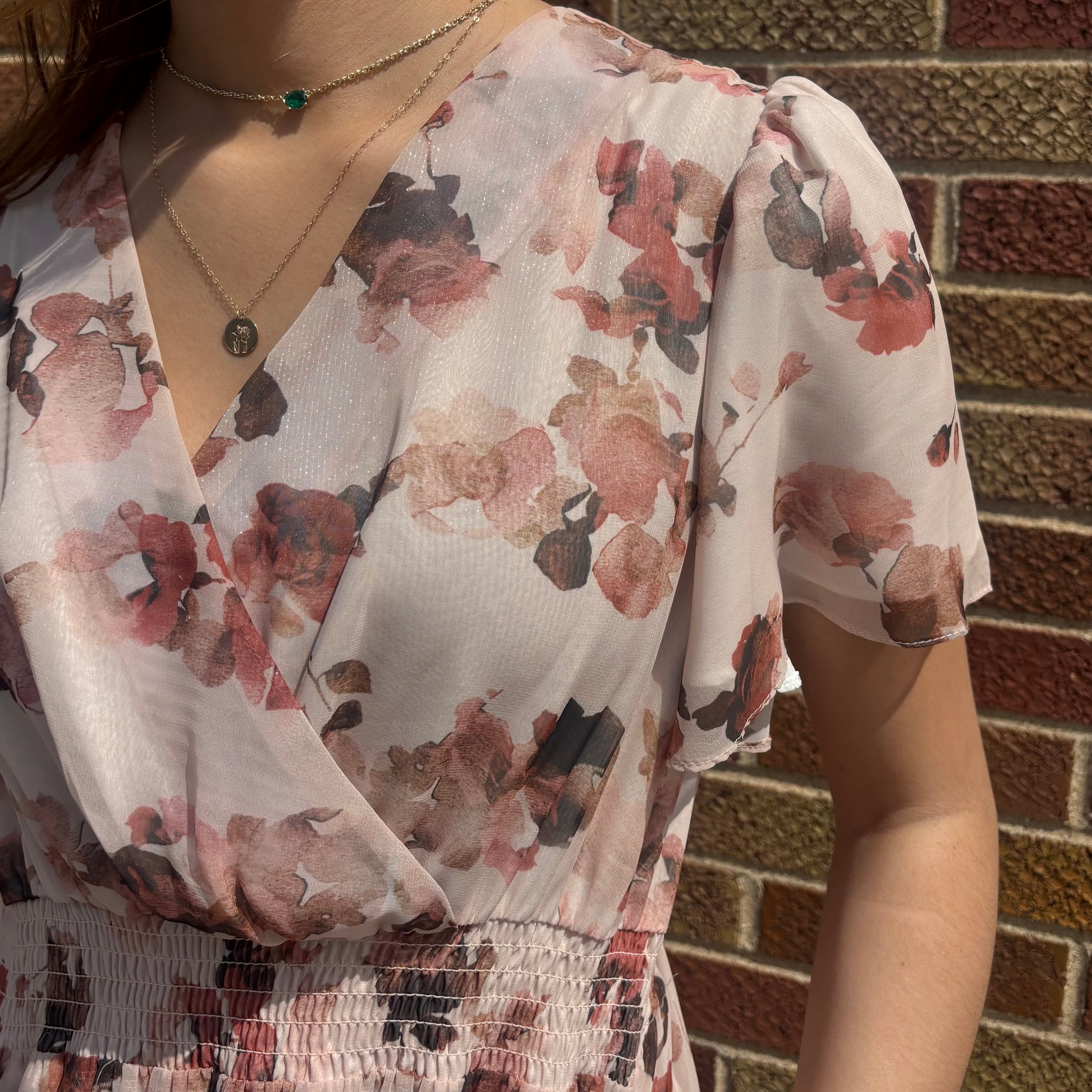 Elegant Jessa Petal Dress featuring a flattering V-neck and feminine cap sleeves. The distinctive petal design is enhanced with subtle gold shimmer underneath, creating dimension and visual interest.